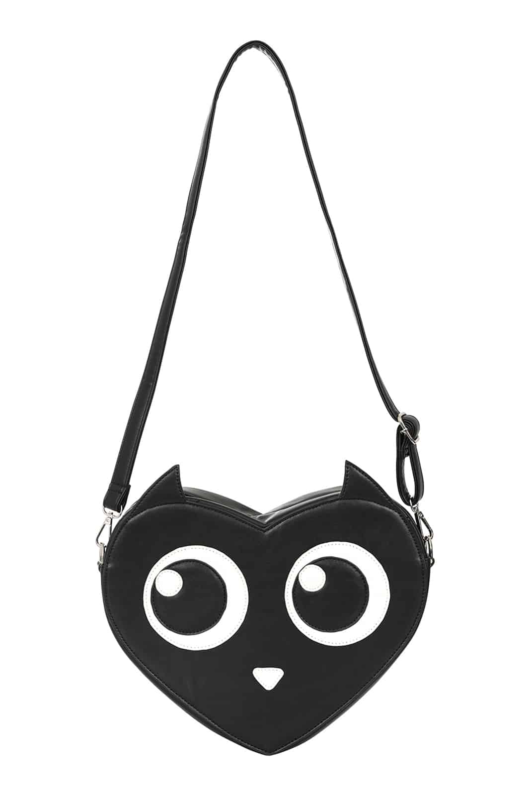 This shoulder bag from Banned enchants with its playful design. The heart-shaped bag features a cute cat face with large white eyes and a small nose – a perfect accessory for kawaii and gothic fans. The vegan faux leather gives it a high-quality look, while the adjustable shoulder strap makes it comfortable to carry. Functional and a real eye-catcher for everyday life.