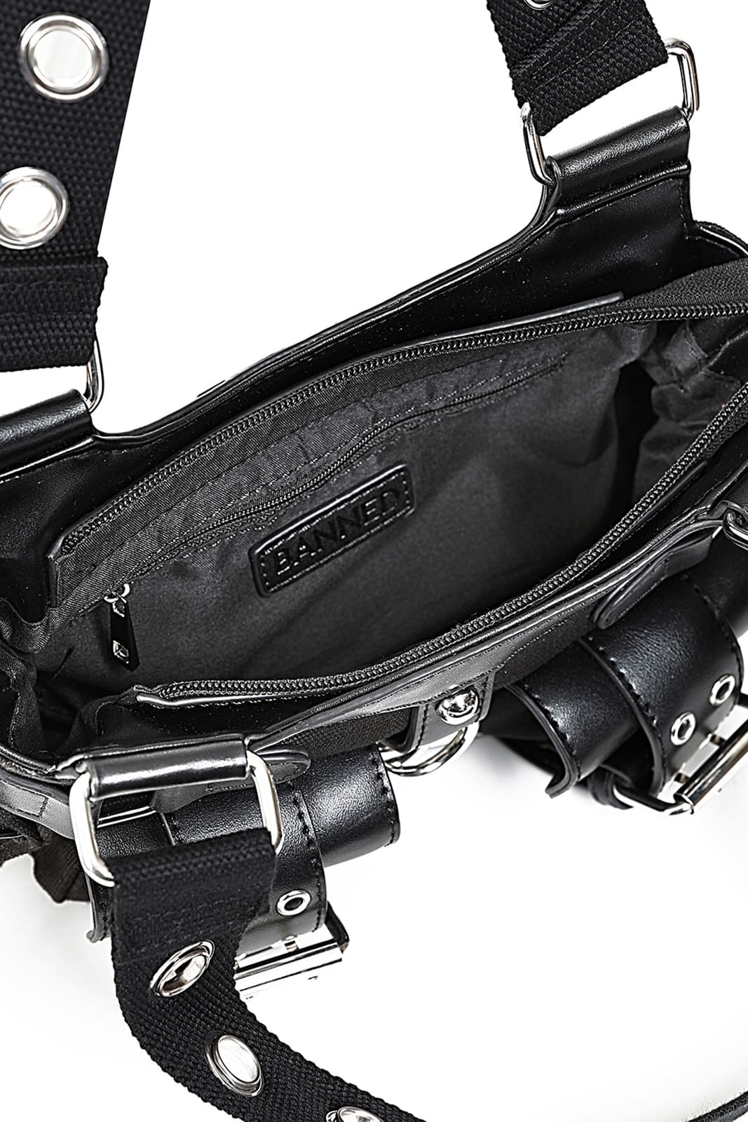 Make a strong statement with the Dark Doll handbag from Banned. This small shoulder bag combines robust canvas with PU details and combines edgy design with practical function. Multiple pockets, striking buckles and metallic accents give it the typical gothic look, while the detachable shoulder strap offers versatile carrying options. Ideal for everyday wear, concerts or to add a rebellious touch to your outfit.