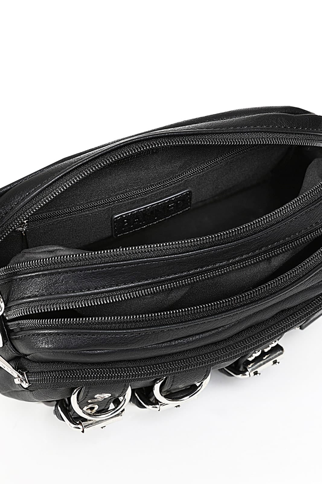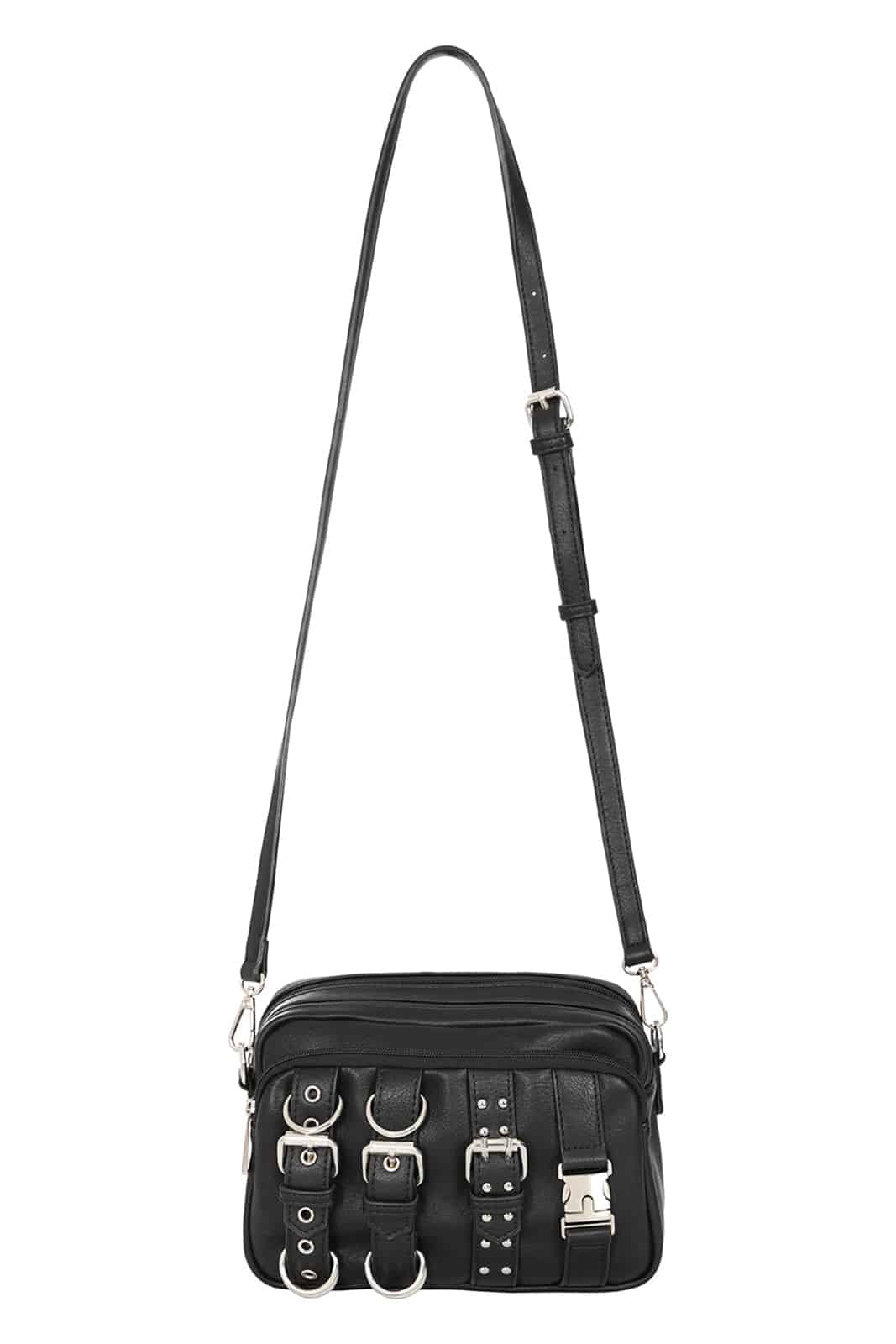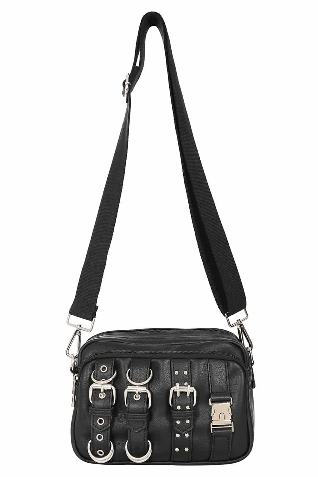 This shoulder bag from Banned combines a clear gothic style with practical everyday practicality. Made from vegan faux leather, it features striking buckles, studs and silver-colored hardware. The adjustable, woven shoulder strap makes it comfortable to wear, while several compartments offer plenty of space for your essentials. A perfect blend of edgy design and functionality.