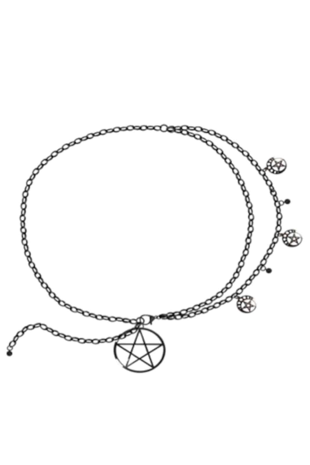 A small moon phase pendant with integrated pentagram and banned logo forms the end of the chain. A lobster clasp makes it easy to put on and take off the belt.