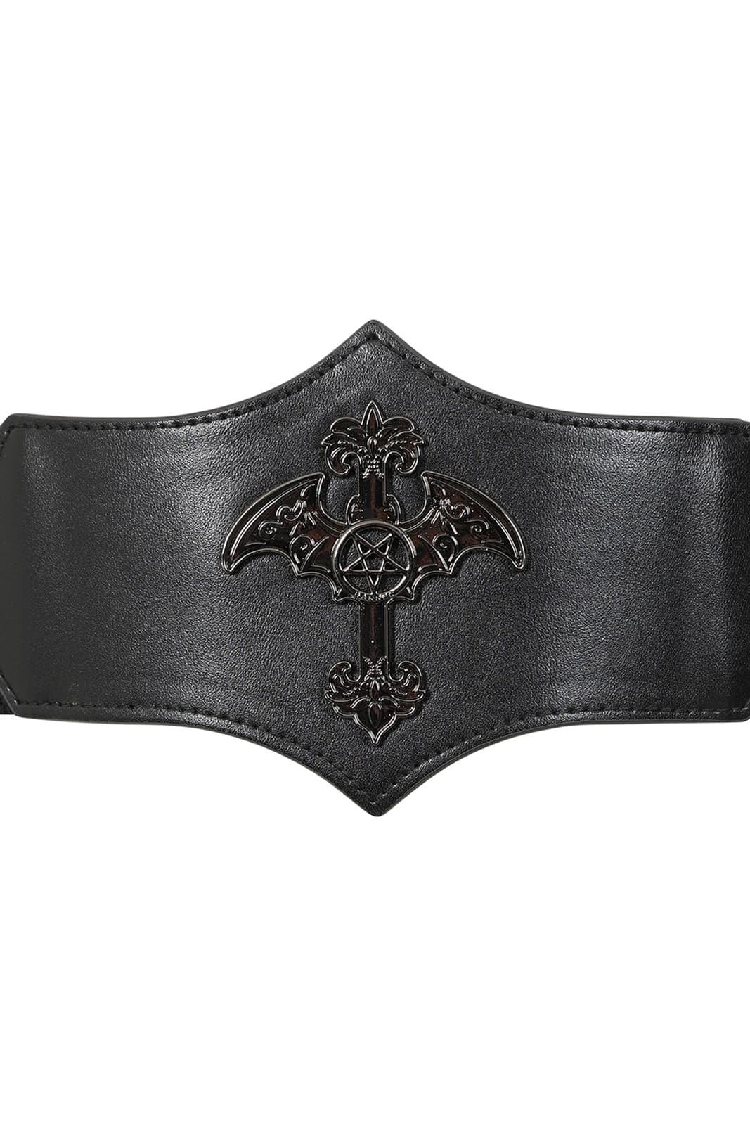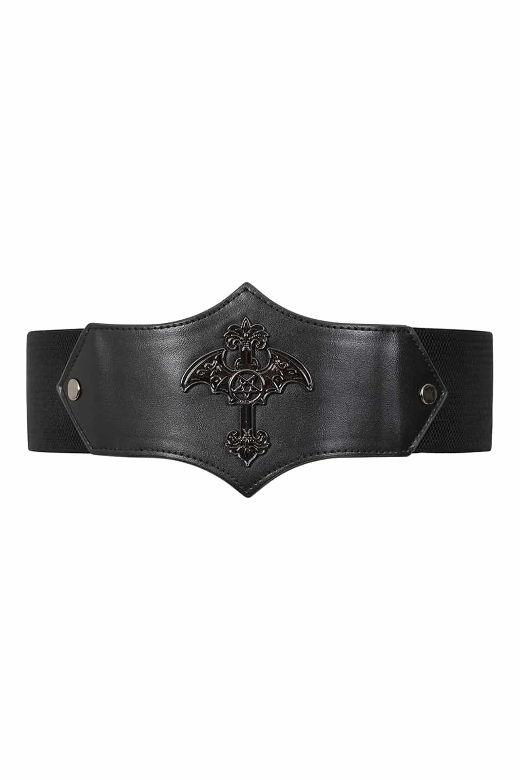 The Wicked waist belt from Banned is the perfect accessory for a strong gothic statement. The elastic waistband ensures a comfortable fit, while the eye-catching cross ornament with bat wings gives the belt its dark, extravagant character. Ideal for enhancing simple outfits or adding the finishing touch to your look.