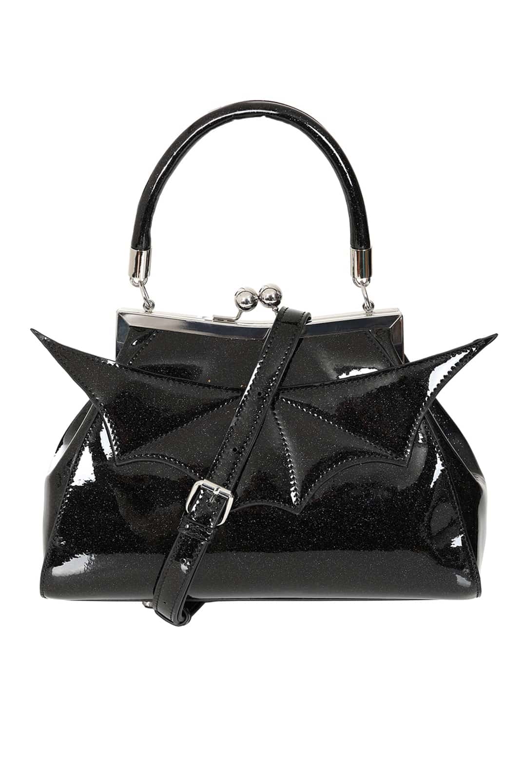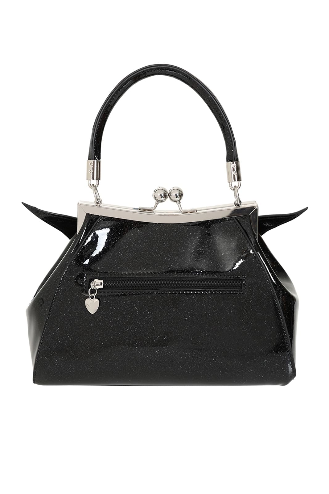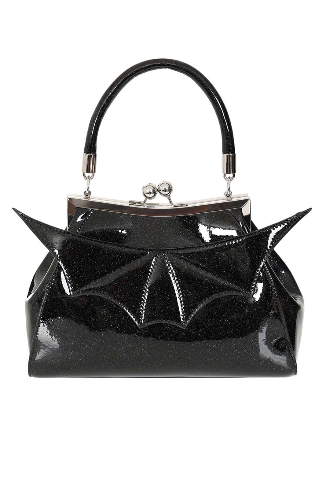 The Elvira Shimmer handbag from Banned combines vintage charm with an eye-catching gothic accent. The shiny material with a shimmering effect is emphasized by the striking bat wings on the front. With a classic clip fastening, sturdy handle and detachable shoulder strap, the bag can be carried elegantly in the hand or practically over the shoulder. A stylish accessory that perfectly rounds off rockabilly and gothic looks.