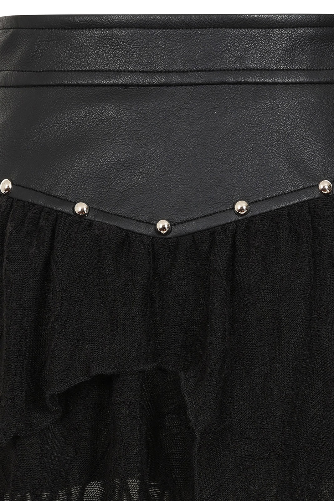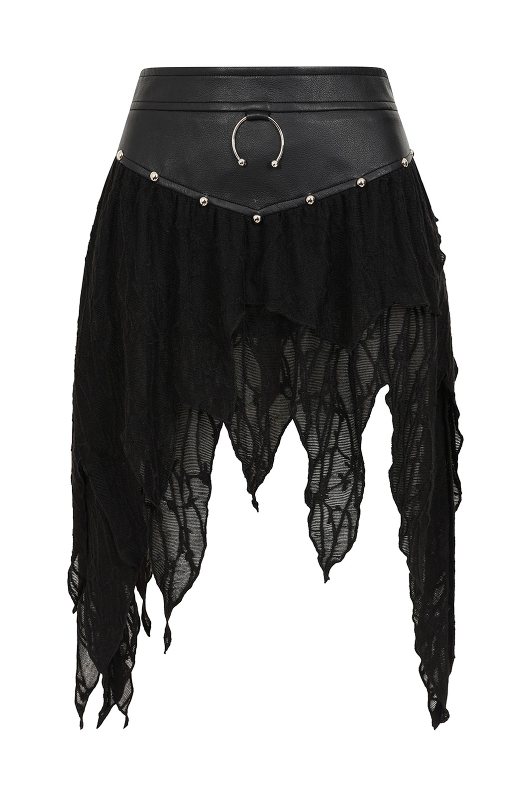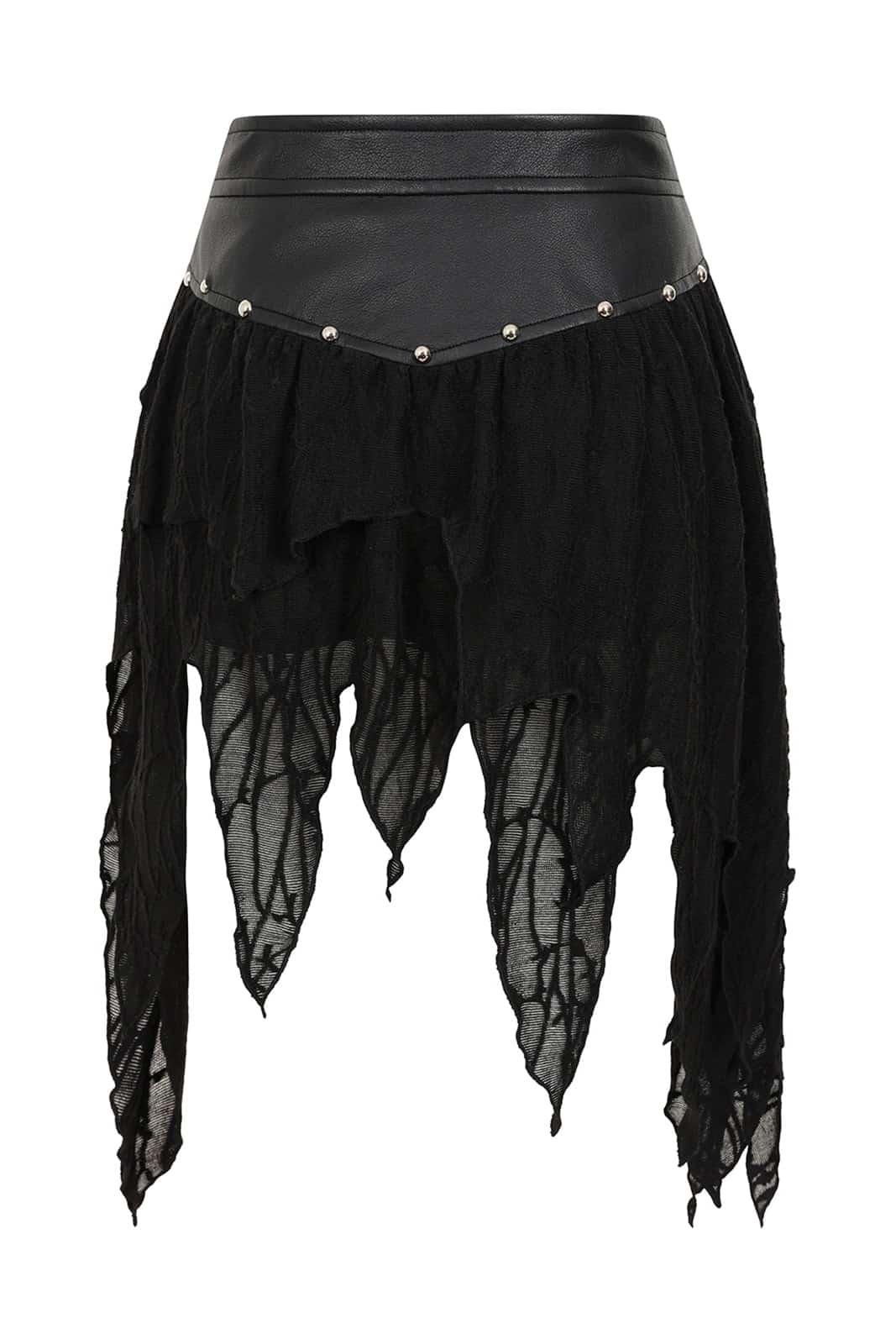 This alternative skirt combines textured faux leather with shredded, semi-transparent knitted fabric to create a striking gothic design. The high faux leather waistband provides shape and support, decorated with a silver-colored O-ring and small studs. Underneath, the asymmetrical, zipper-shaped fabric falls loosely down in several layers, creating a mystical, ripped look. The contrast between smooth leather and soft knit makes this piece a highlight for dark, playful outfits.