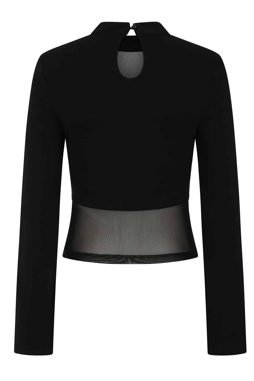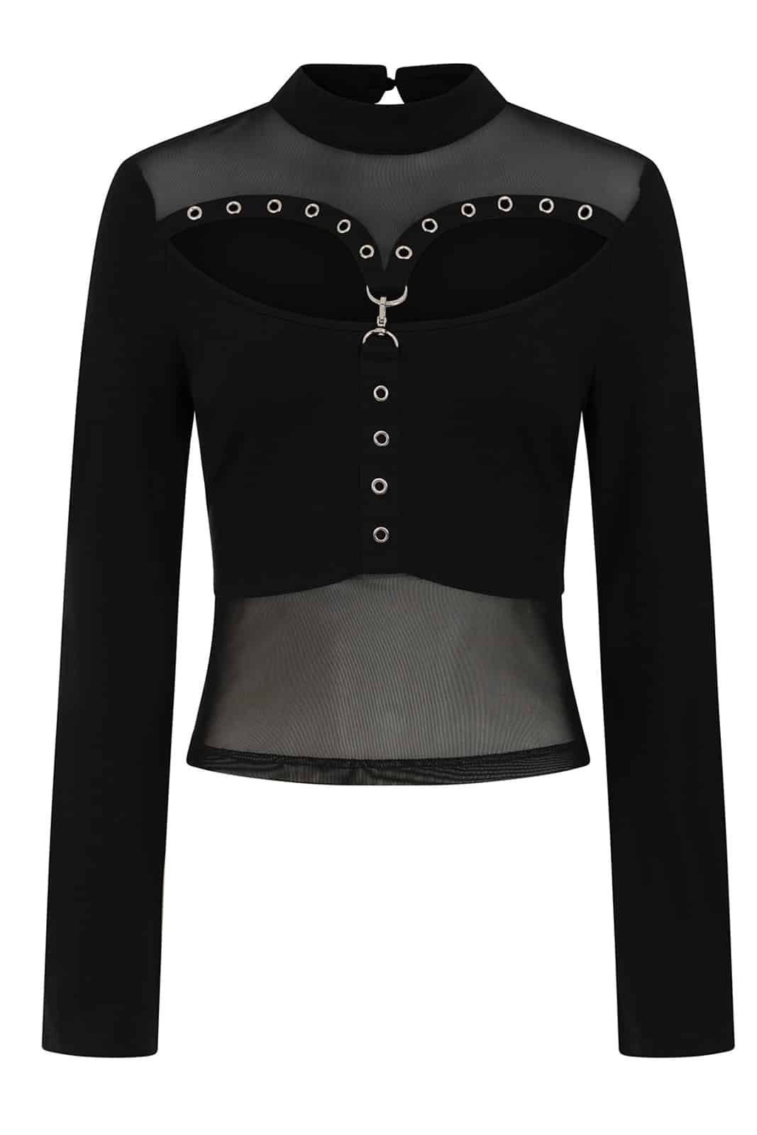 This alternative top from Banned features a sophisticated gothic design and a body-hugging silhouette. The black base material is contrasted by transparent mesh inserts on the chest, shoulders and hem, creating an expressive look. Silver eyelets, a striking D-ring detail and the high collar provide additional accents, while the small keyhole cut-out at the back with button fastening creates an elegant finish. Ideal for eye-catching outfits from everyday to evening.