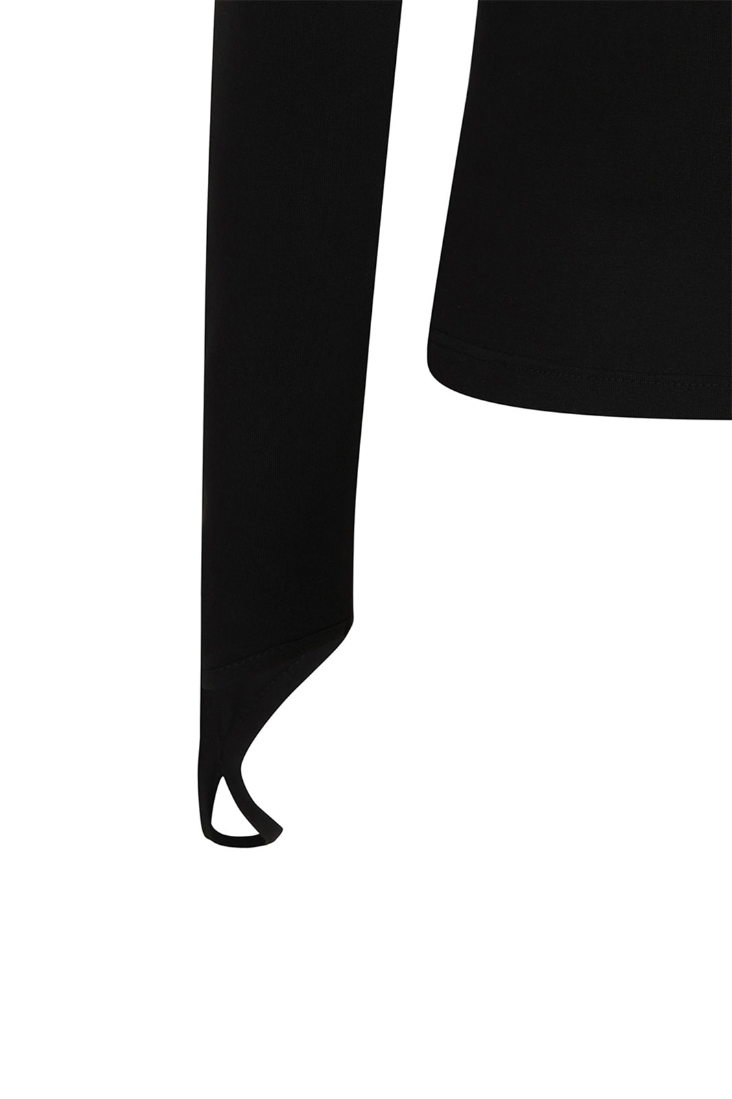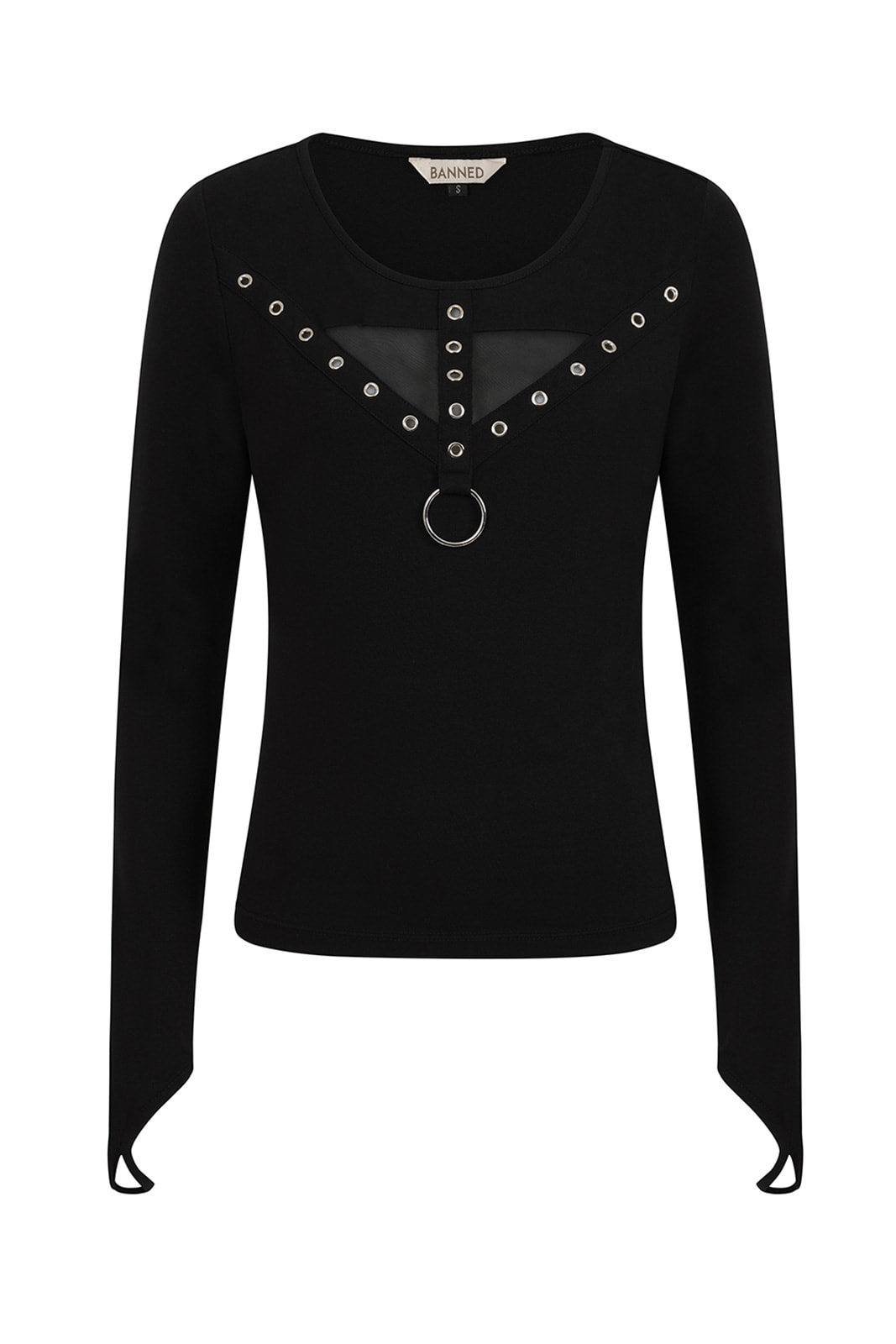 This black Banned top combines clean lines with striking details. A V-shaped mesh insert at the neckline, framed by silver-colored eyelets and a central strap with an O-ring, gives it a strong, alternative touch. The long sleeves end in tapered cuffs with thumb loops for a dramatic look. Figure-hugging cut, ideal as a statement piece or for layered styles in gothic and punk styles.