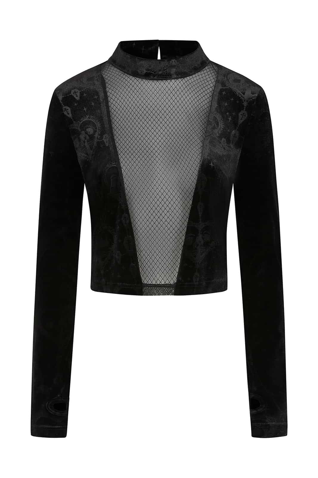 This cropped velvet top makes a striking appearance and combines sophisticated material with eye-catching details. The embossed skull print gives the fabric a special texture, while the transparent mesh panel at the front creates a dramatic contrast. The high collar with a keyhole cut-out at the back rounds off the design. Perfect for layering and as a highlight in your darkwear wardrobe.