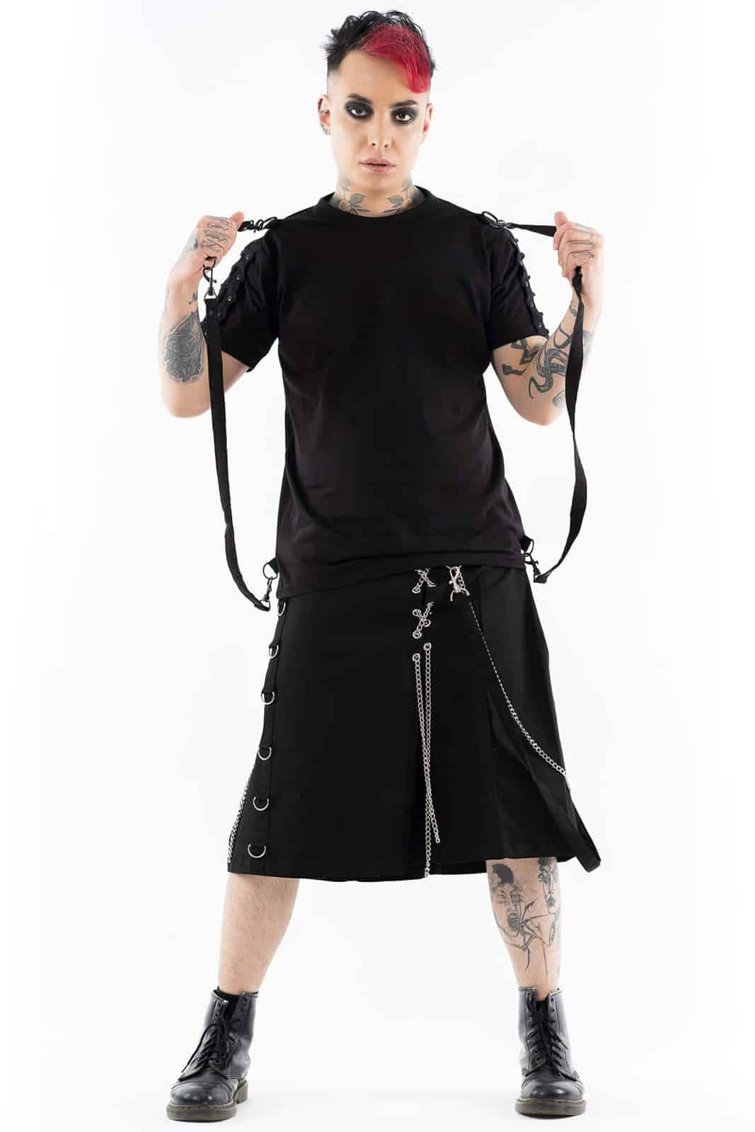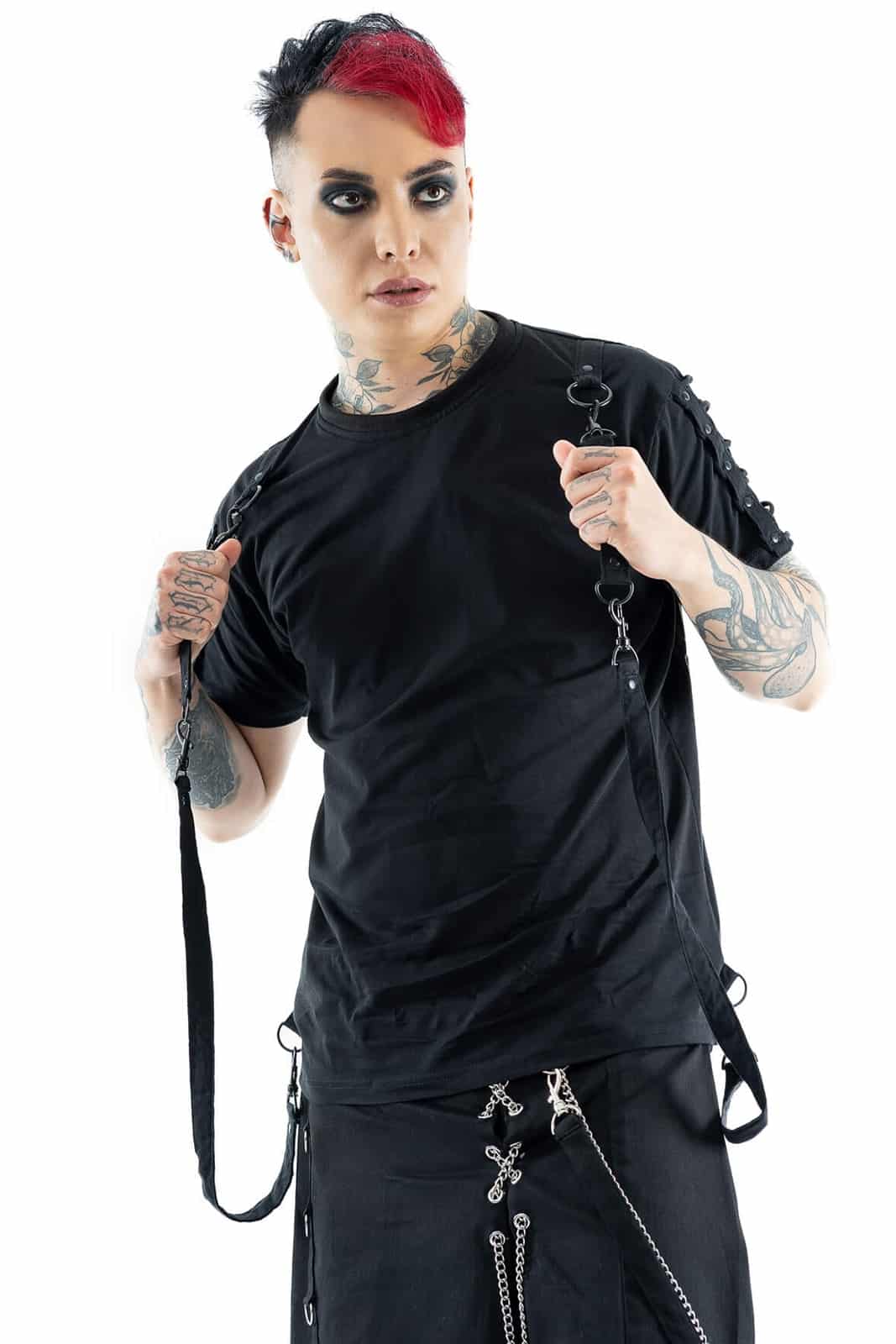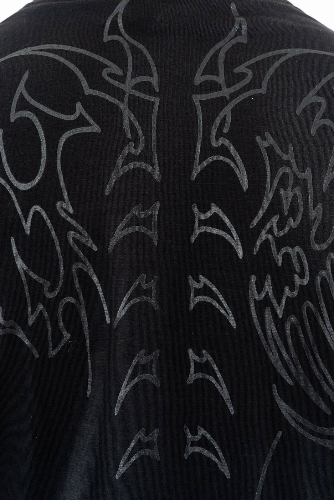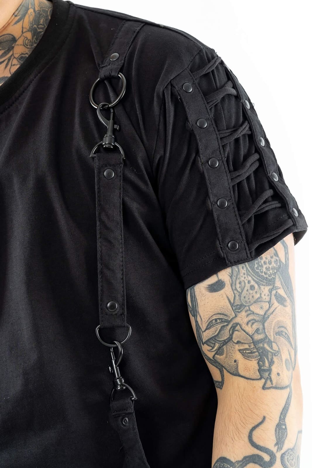 This black T-shirt made from pure cotton combines classic comfort with an expressive design. The back features a detailed tribal print that runs along the spine like a dark totem animal and gives the shirt a striking mystical touch. Decorative lacing runs along the shoulders and sleeves, framed by robust press studs that create a textured, almost military-looking surface. Two adjustable straps with snap hooks attached to D-rings add a functional, customizable component to the design. The shirt can be worn solo or in more complex layering looks and is ideal for anyone who doesn’t want to compromise on dark sophistication even when it comes to basics.
