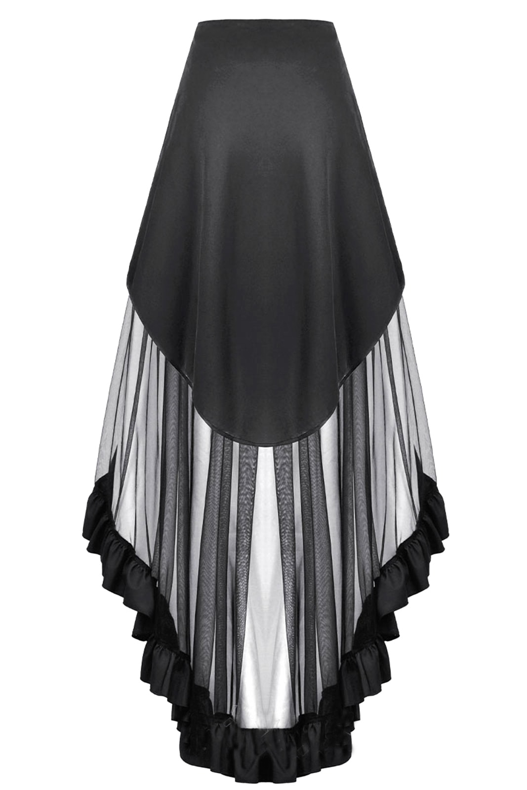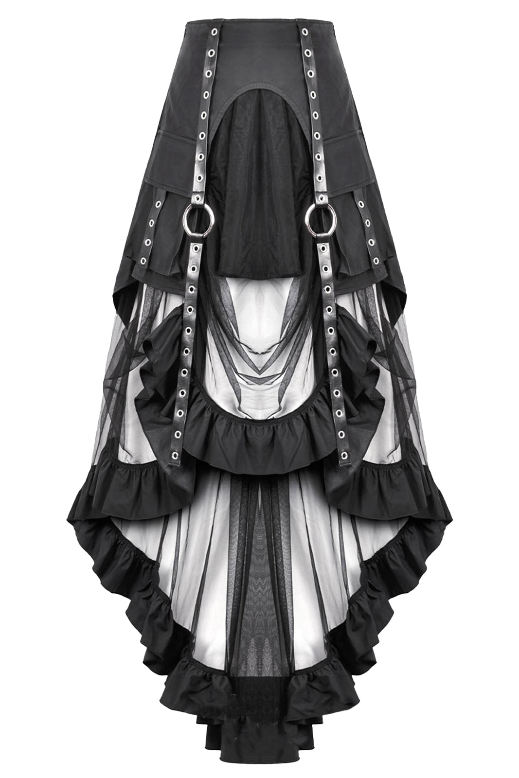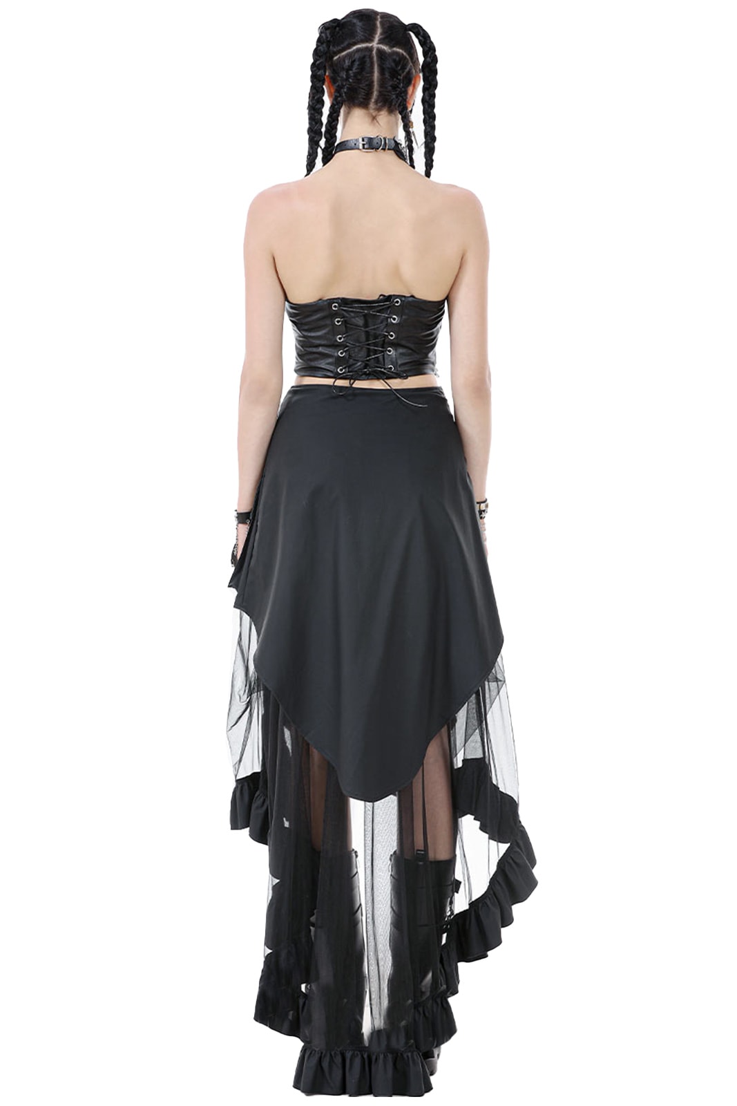 A skirt that perfectly combines dark elegance and rebellious details. The “Pandora Arcanum” combines shiny faux leather with transparent tulle, decorated with ruffles and striking eyelet straps. The high-low cut emphasizes the silhouette and ensures a dramatic appearance – whether at festivals, in clubs or in everyday life with style.