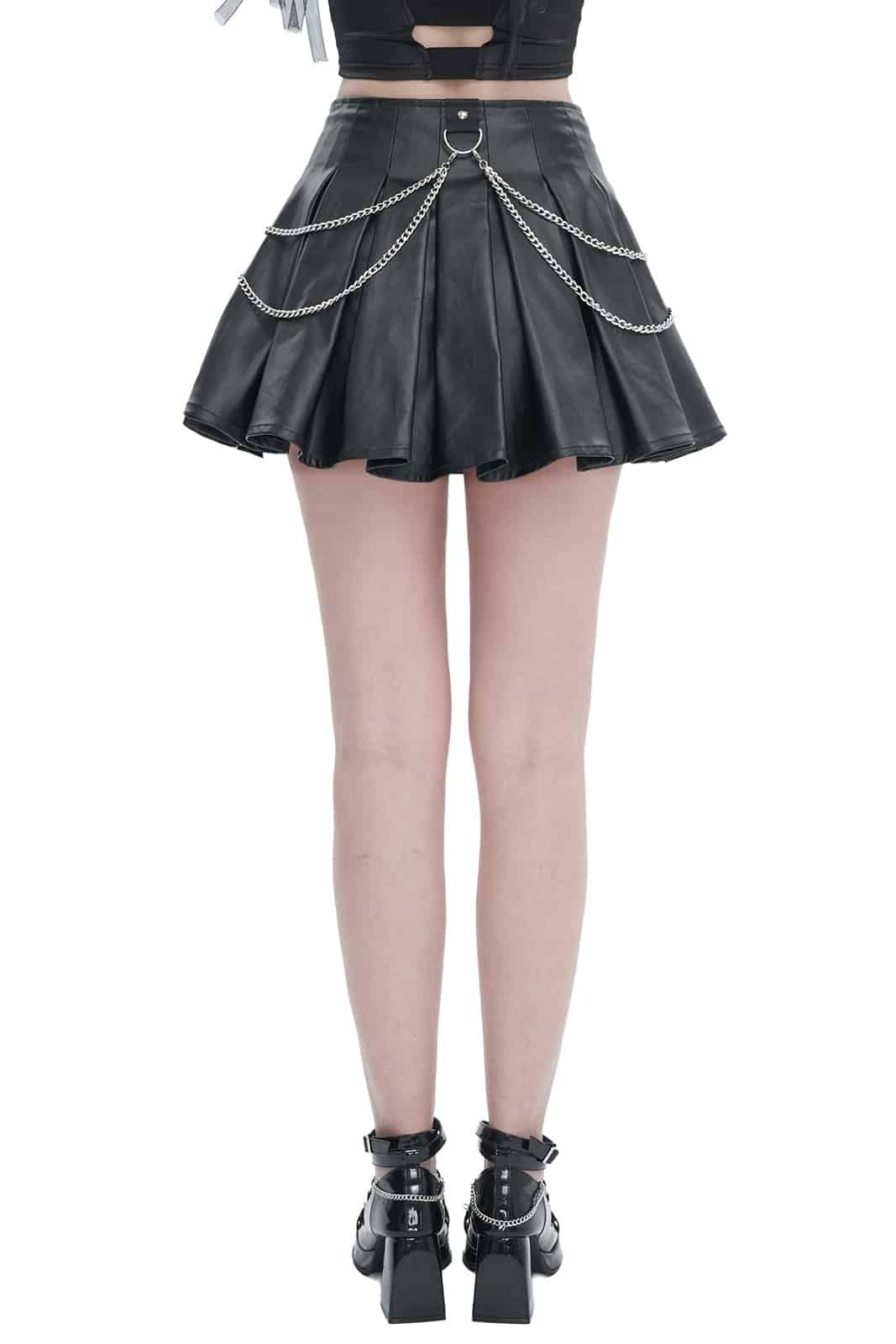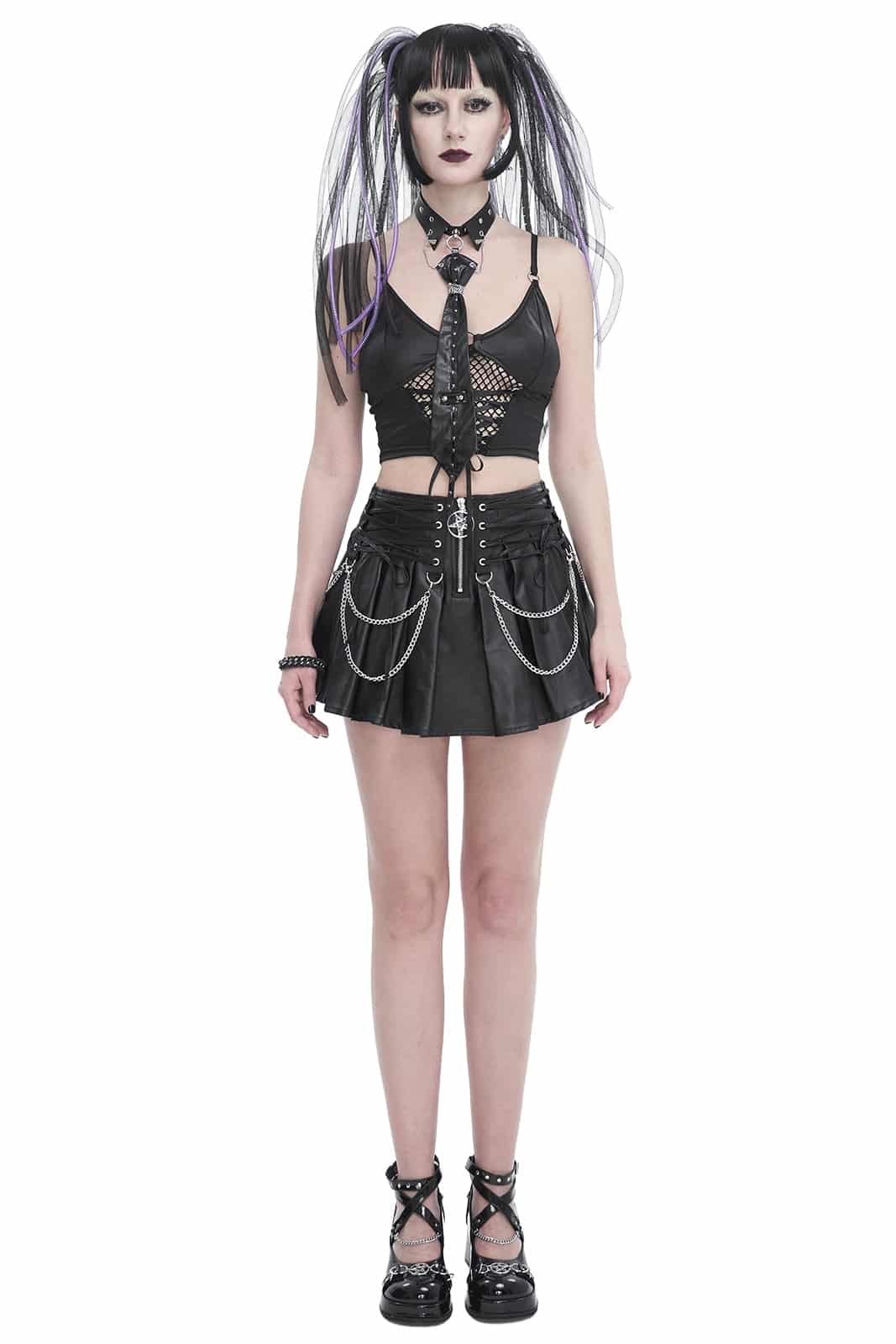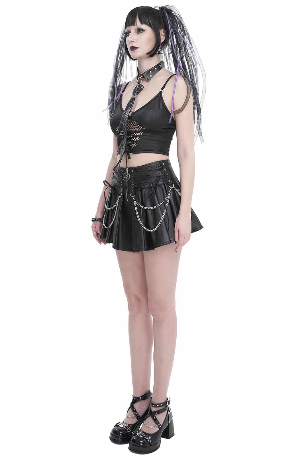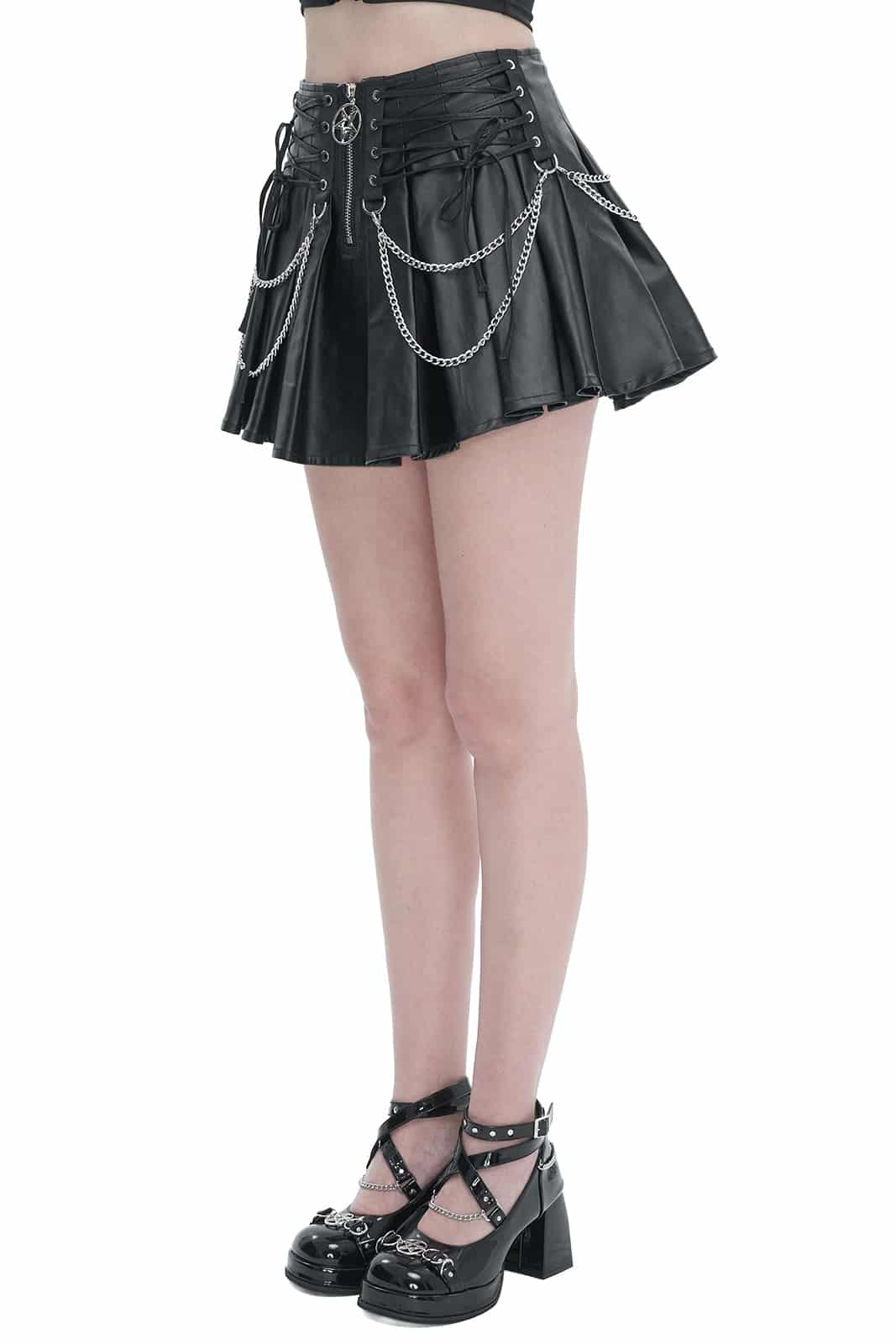 Rebellious and seductive at the same time – this black faux leather mini skirt brings pure dark punk energy to your wardrobe. The pleated shape creates a playful silhouette, while the striking zipper with pentagram zipper and the lace-up details at the sides add a dark touch to the design. Detachable metal chains reinforce the rock character and offer styling versatility depending on the occasion. Perfect for combining with crop tops, boots or fishnet stockings, this skirt is a real statement piece for anyone who wants to create a rebellious and dark look.