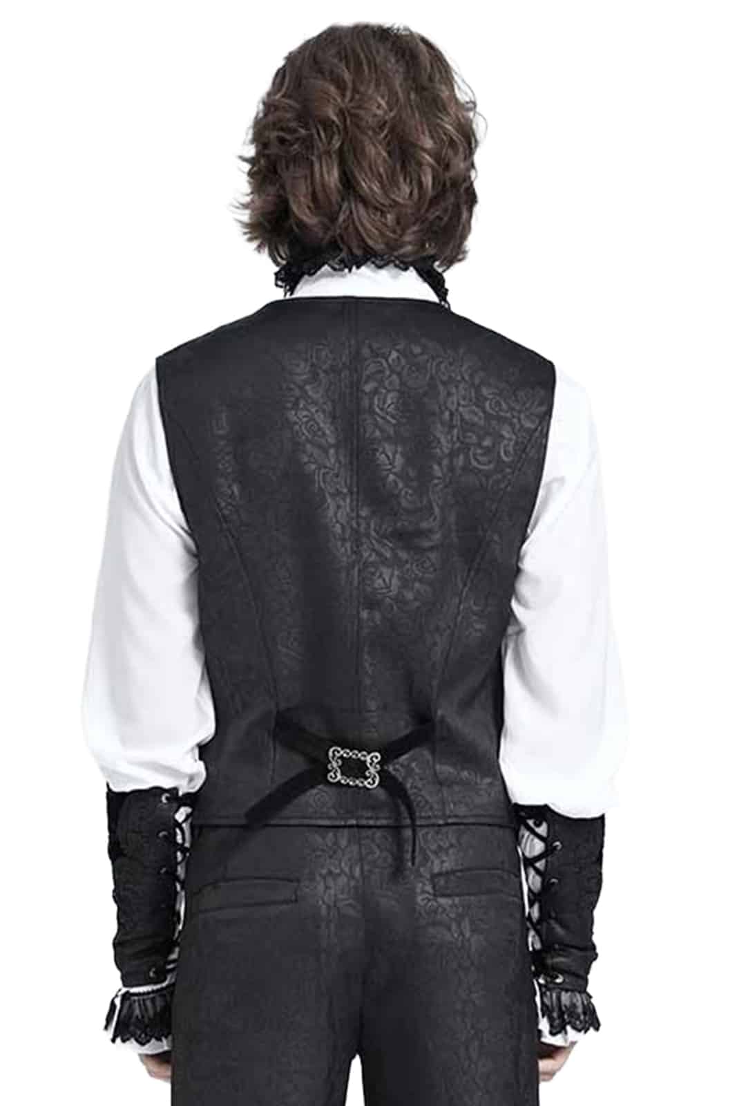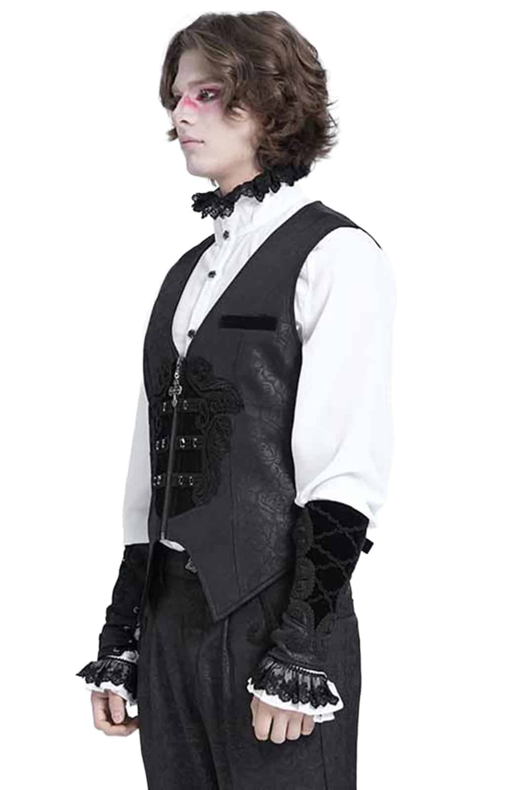 The Theodore Gothic men’s vest is an elegant garment that combines the classic art of brocade with dark sophistication. Made from black fabric with a rose pattern, it impresses with a luxurious finish that adds depth and texture. The front is adorned with detailed embroidery and black velvet appliqués that lend the design a sumptuous character. A zipper with a cross pendant adds a striking accent while also ensuring functionality. The slim cut emphasizes the silhouette, while the buckle detail at the back regulates the fit and provides an additional eye-catching feature. With a deep V-neck and no lapels, the vest is perfect for combining with frilled shirts and Victorian accessories. Made from 100% polyester, it is perfect for formal occasions, gothic events or as a stylish statement for alternative fashion ensembles.
