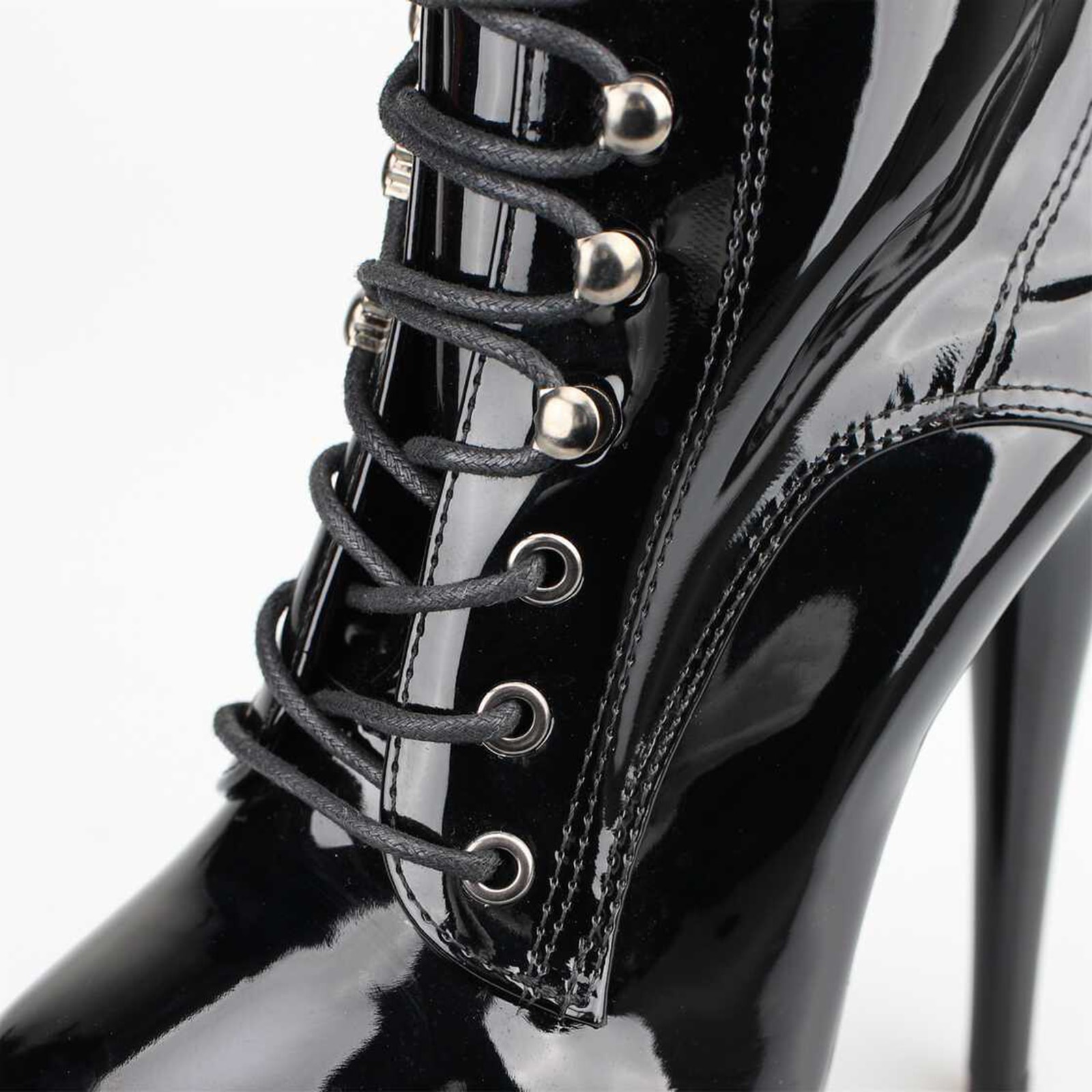 Extravagant patent ankle boot with polyurethane upper and high platform PVC sole. Completely vegan!