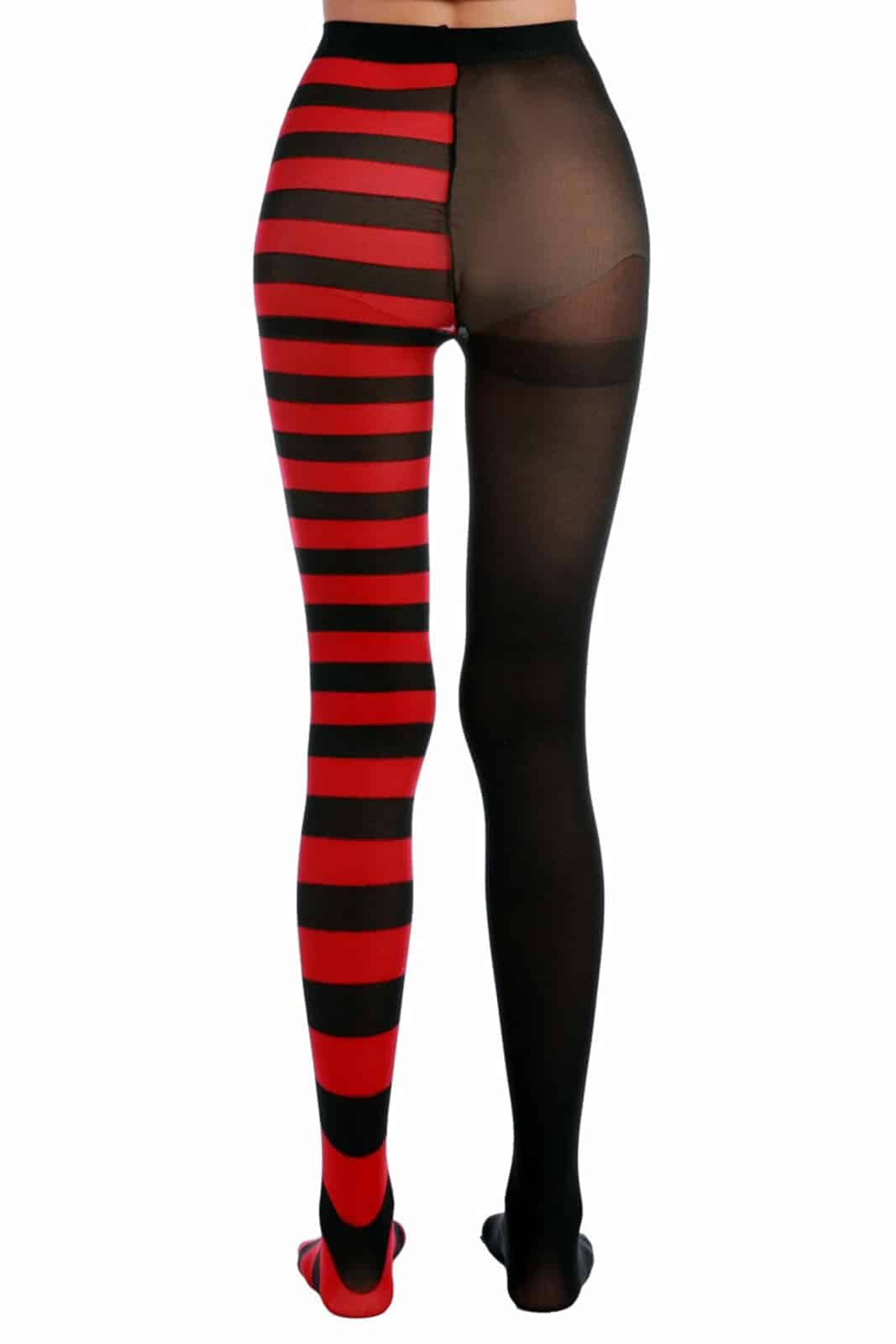 Tights made from fine mesh for all occasions. One leg in black, one leg in black/red stripes.