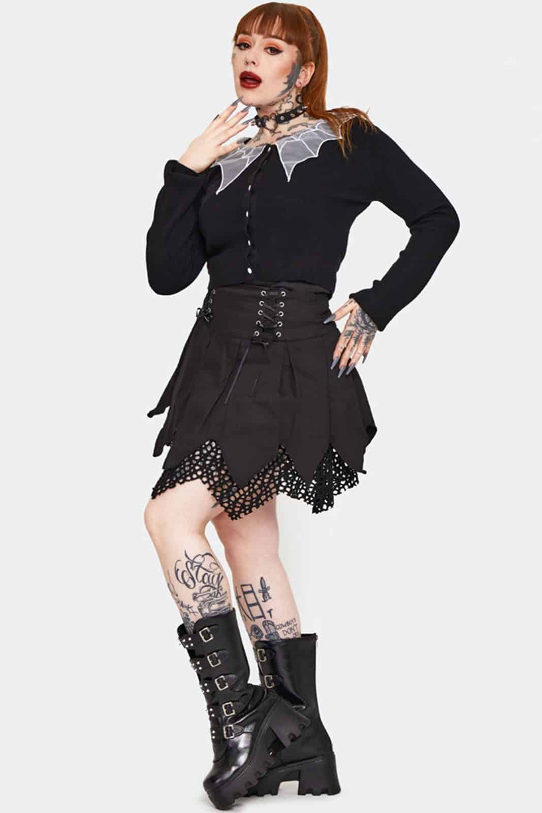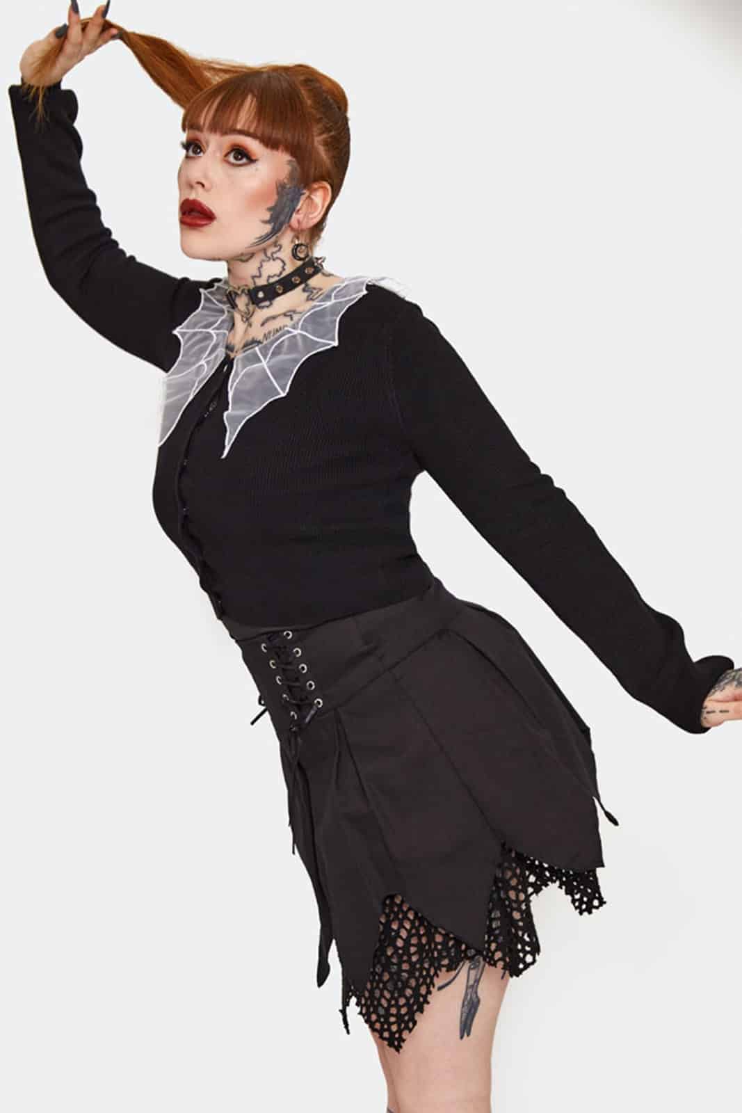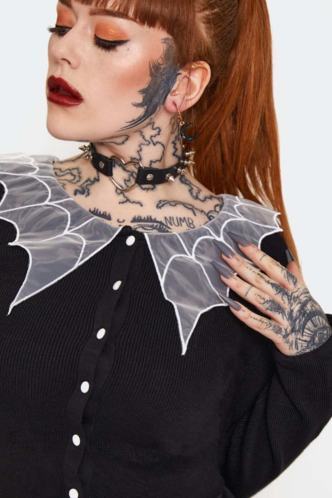 This buttoned gothic cardigan stands out with its striking spider web collar, which immediately catches the eye and emphasizes an alternative look. In classic black, with a round neckline, long sleeves and a button placket with five white buttons, it combines simple elegance with a touch of dark romance. Perfect for combining with skirts, pants or dresses and a must-have for all lovers of alternative fashion.