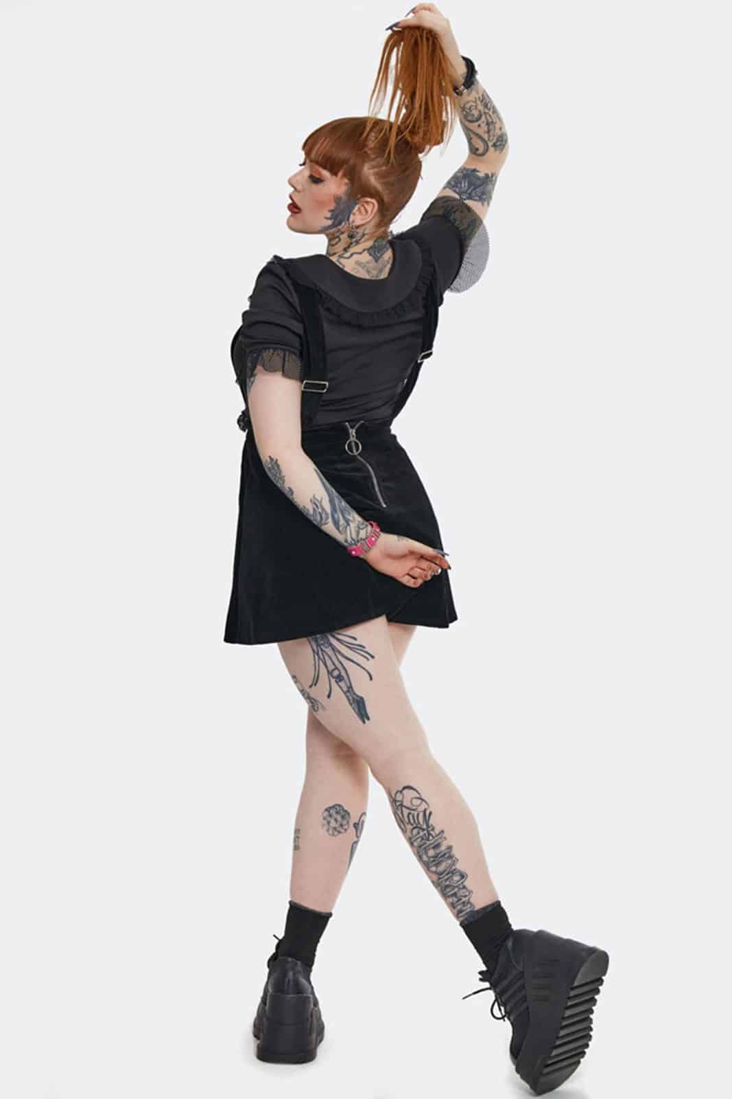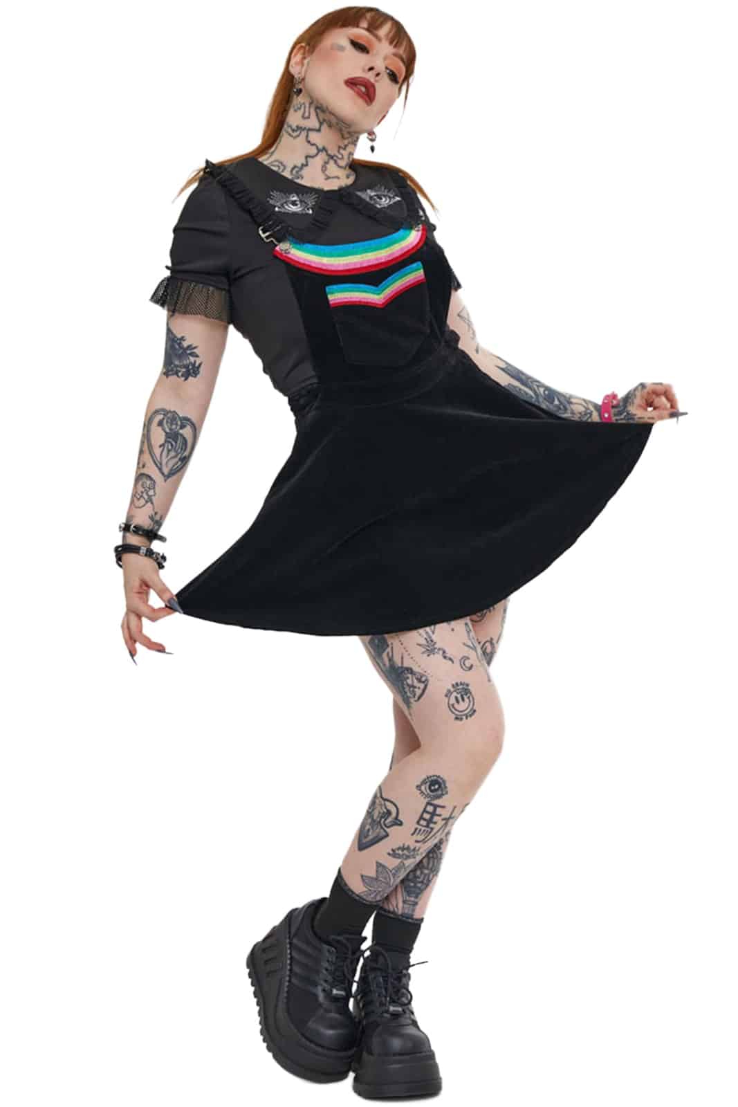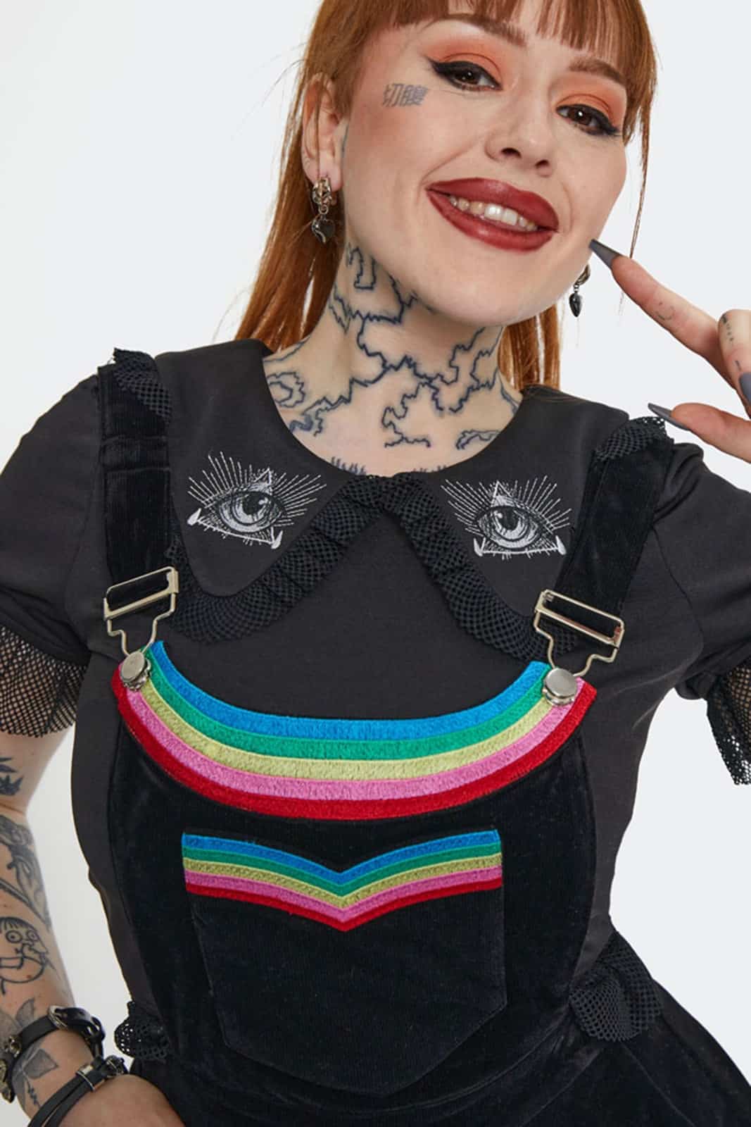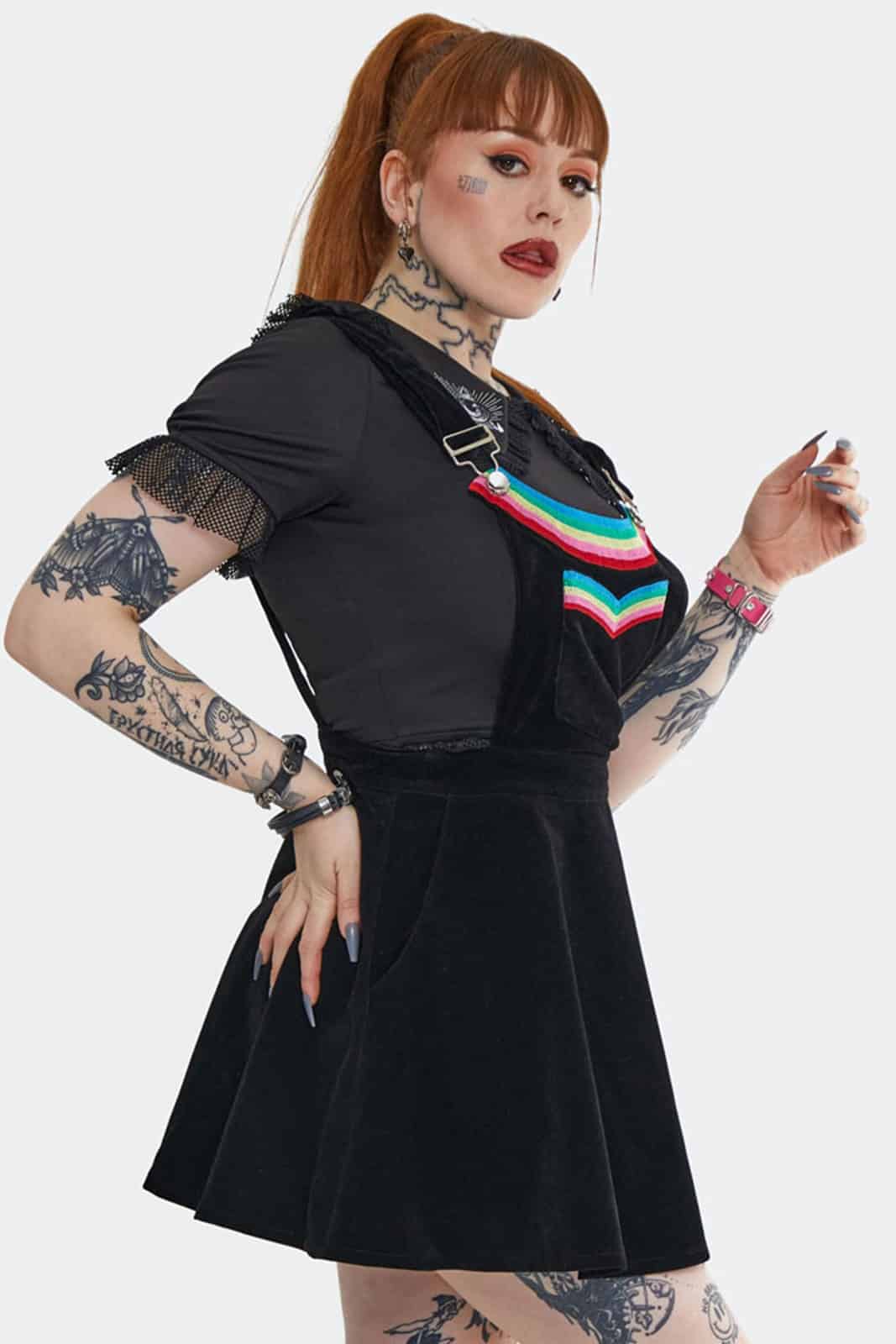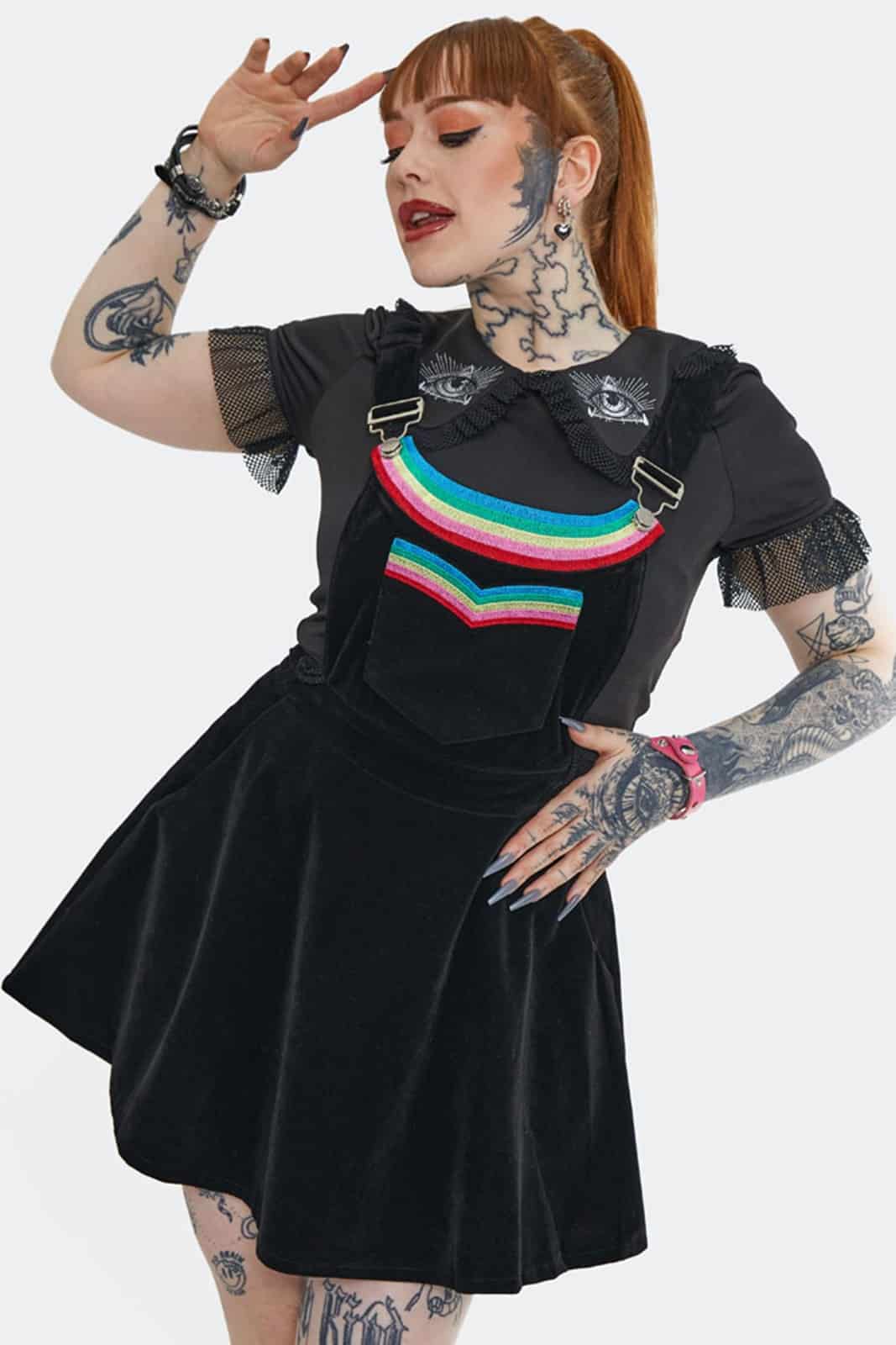 There’s no pot of gold waiting at the end of the rainbow, but this sugar-sweet and super-soft velvet strap dress with double rainbow embroidery. The classic black look is broken up by the colorful details on the front, making this dress a real eye-catcher. Comfortable, playful and versatile – ideal for anyone who wants to add a touch of color to their alternative wardrobe.