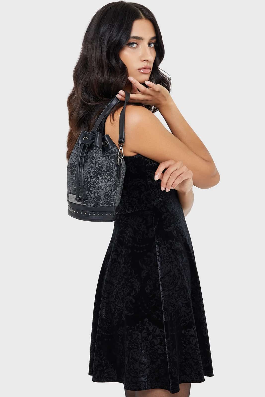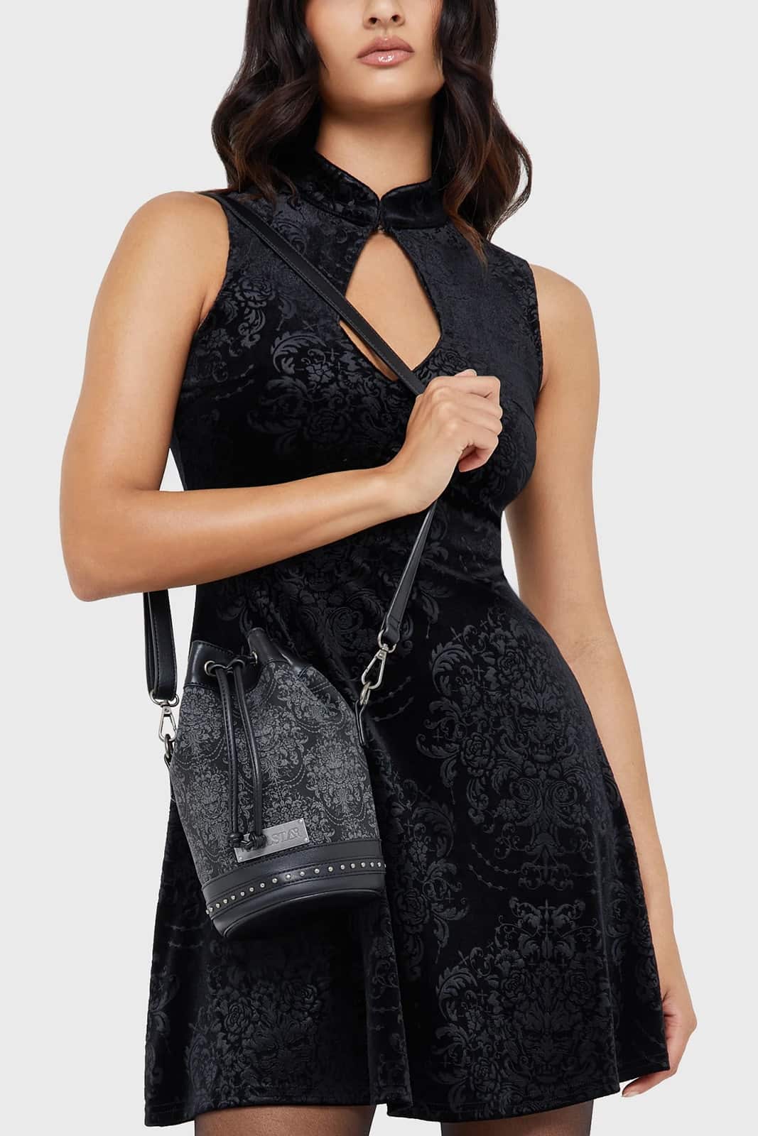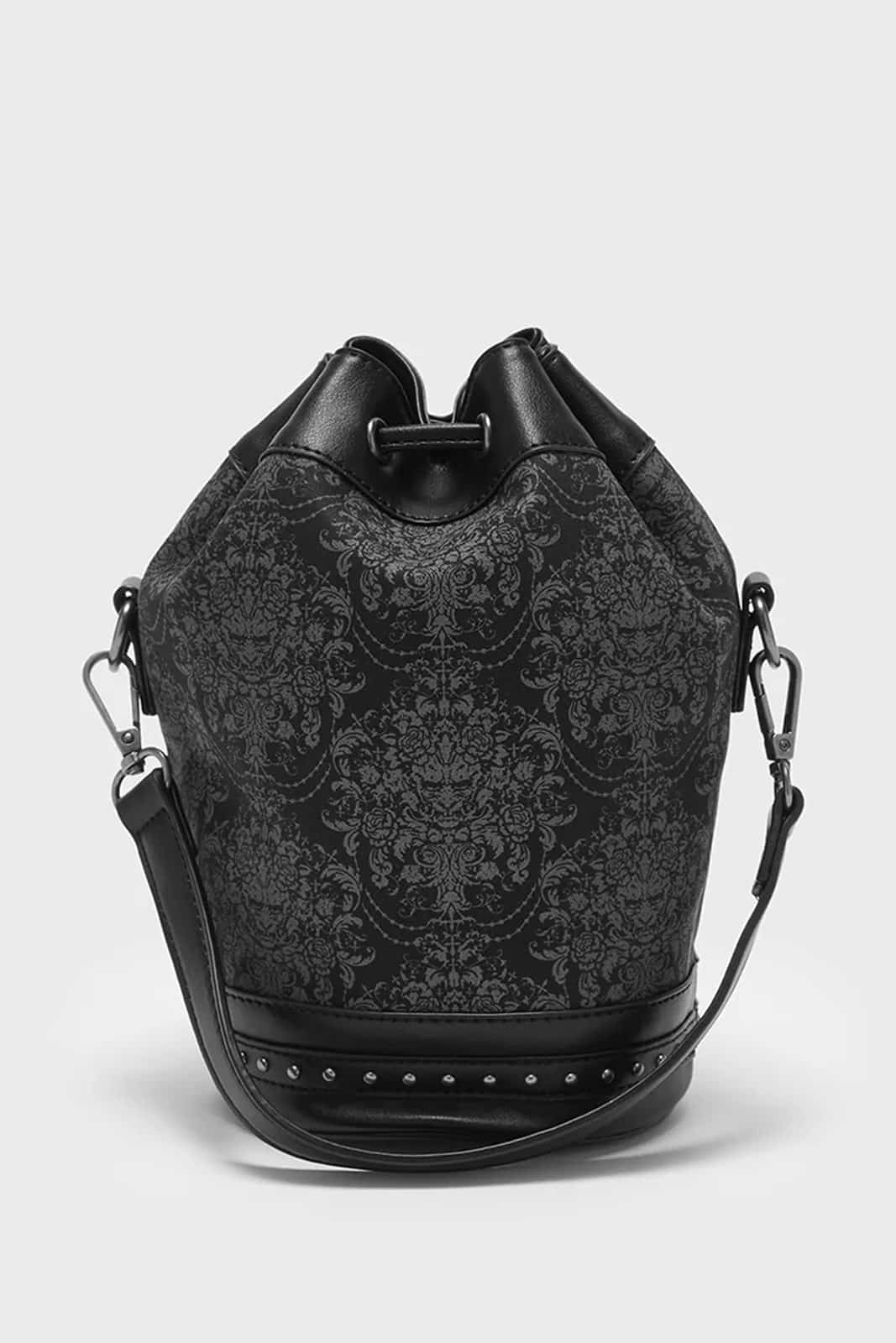 This elegant bucket bag from KILLSTAR combines practical design with dark charm. Made from robust, printed PU, it features a striking fiend print and a classic drawstring that gives the bag its characteristic shape. Metal rivets on the base provide an edgy finish, while the adjustable shoulder strap and an additional hand strap offer versatile carrying options. Fully lined and with a high-quality finish, this bag is the perfect companion for everyday and evening outfits.
