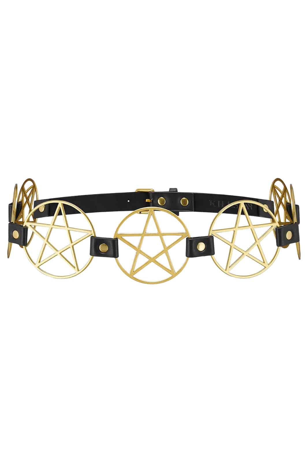 Witchy faux leather belt with stainless steel pentagrams, gold-coloured coating.