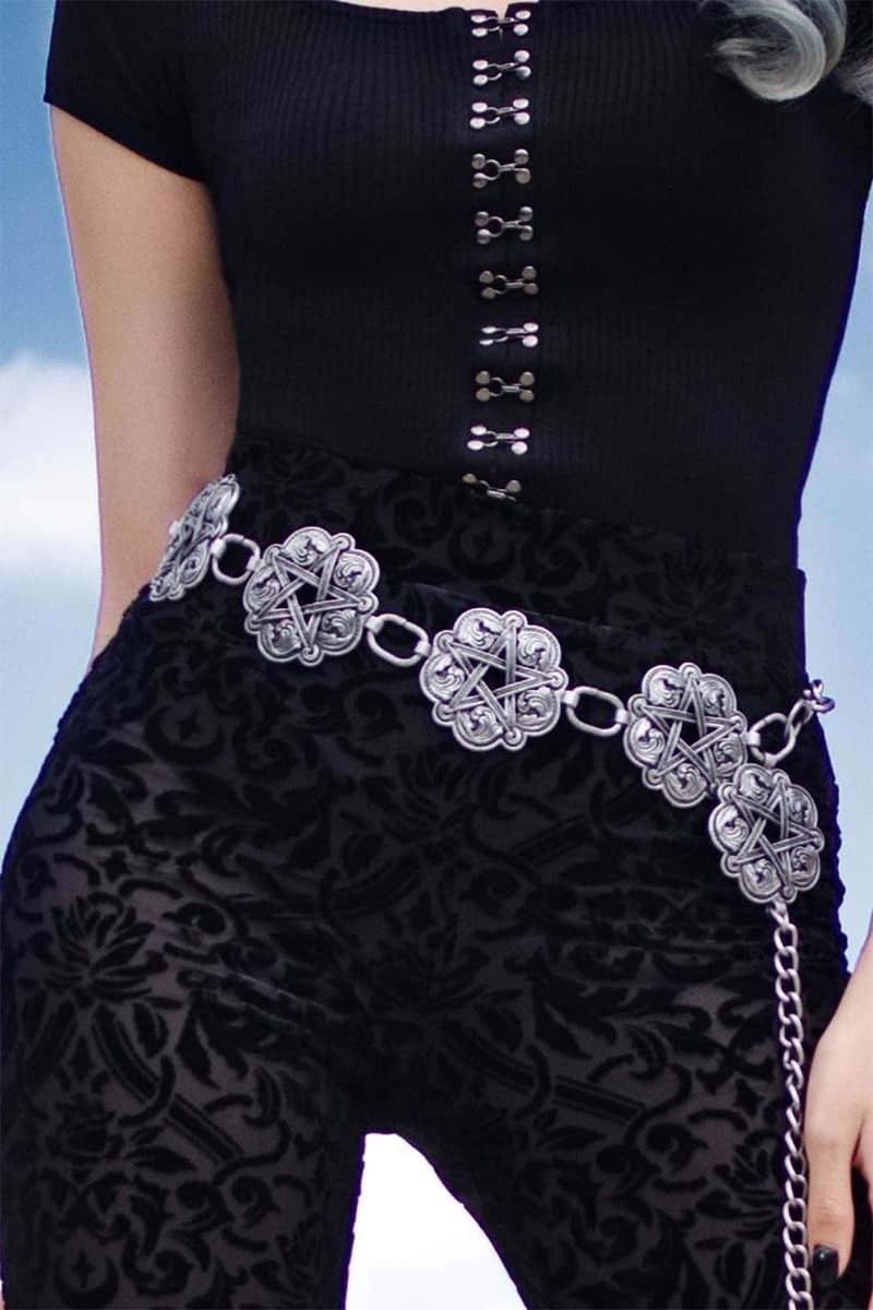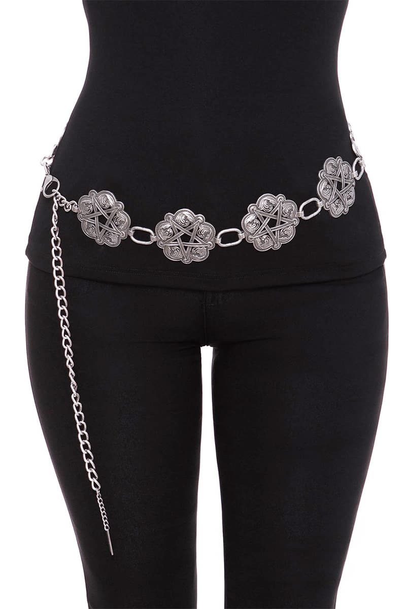 Belt made of nine heavy conchos in the shape of a pentagram decorated with floral ornaments. The belt itself is 80 cm long, the total length with the fastening chain is approx. 115 cm. Fitted with a snap hook.