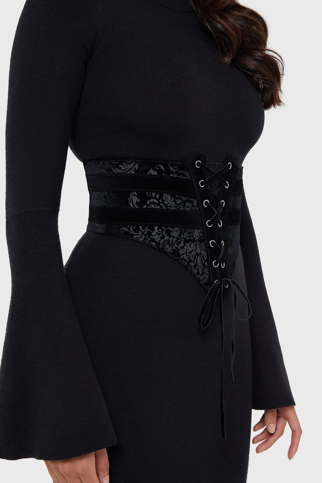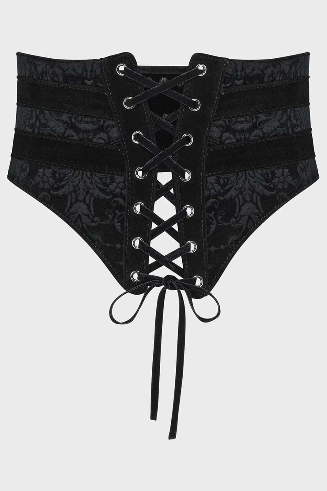 This KILLSTAR waist belt combines sophisticated design with striking gothic flair. Made from soft, embossed velvet in the characteristic fiend print, it makes an impressive statement with its shaped front and lacing with metal eyelets and double-sided velvet ribbon. The elasticated back sections with press stud fastening ensure optimum support and comfort. A stylish accessory that instantly adds structure and elegance to outfits.