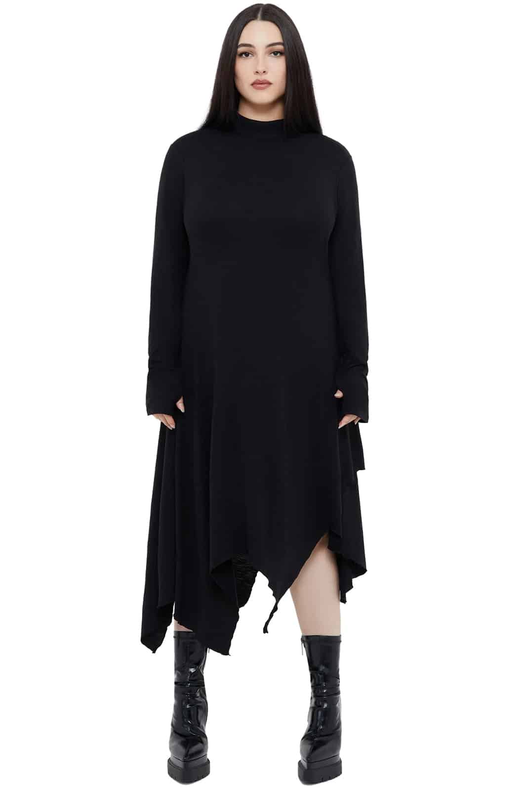 Simple yet expressive – this dress perfectly accentuates the minimalist gothic aesthetic. The soft slub jersey makes it comfortable to wear, while the asymmetric hem and subtle waist seam add movement and depth to the look. A versatile piece that can be worn both casually and smartly.