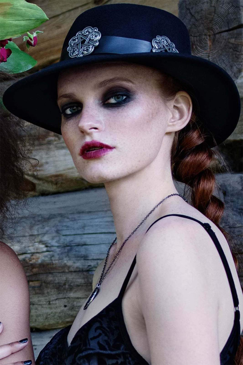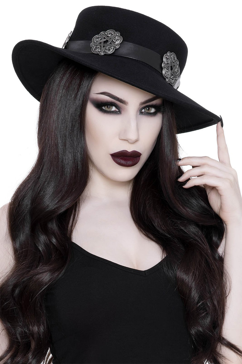 High-quality felt hat with a wide brim and a hatband made of black faux leather decorated with gray pentagrams and floral ornaments. Protects you from the sun and prying eyes.