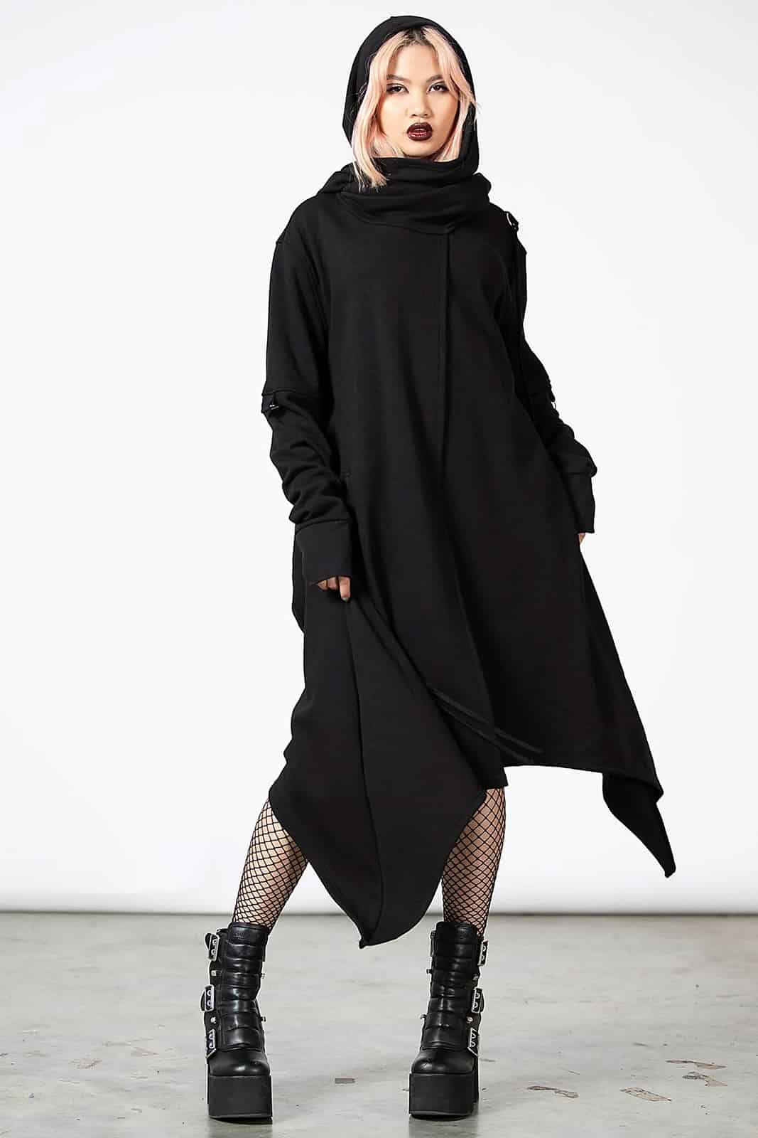 Extra-long gothic hooded jacket with an asymmetric hem. Made from soft jersey, brushed on the inside, with a large drape-style hood. Equipped with two pockets and a thumb hole, decorated with silver-colored D-rings.