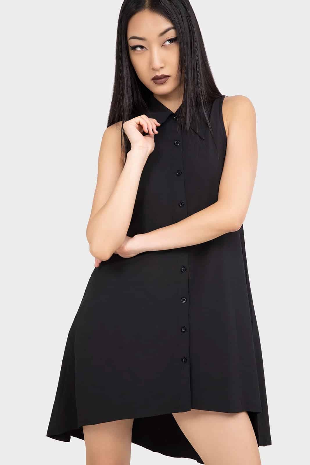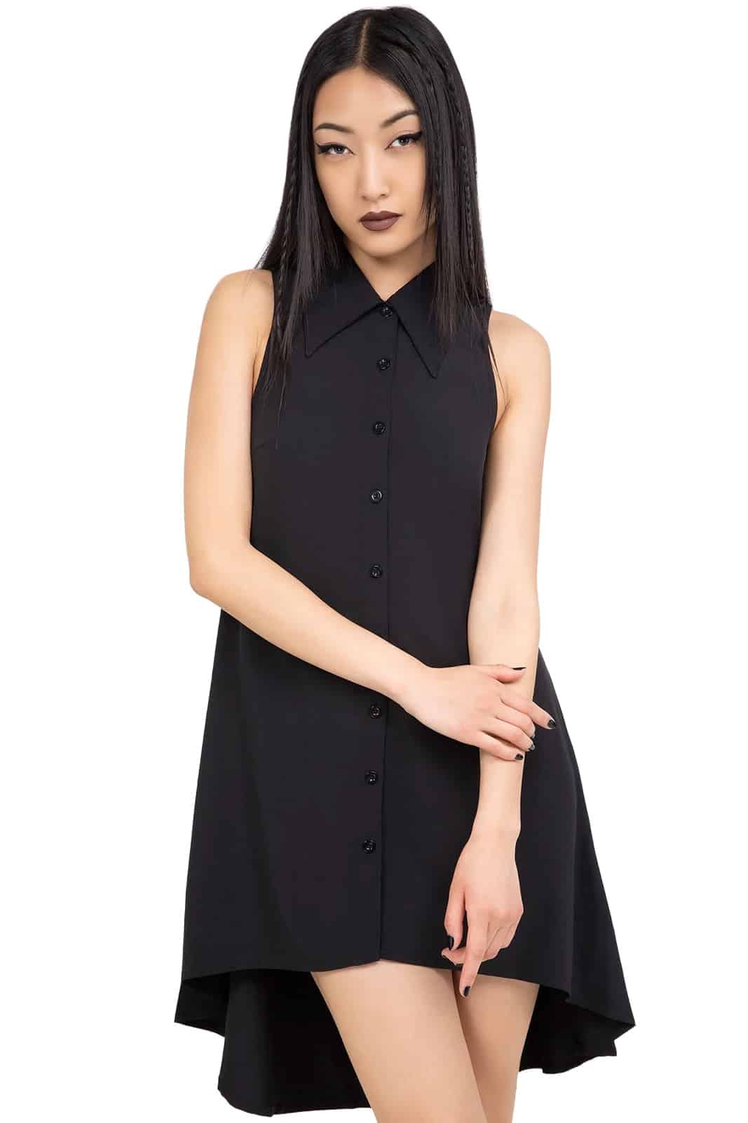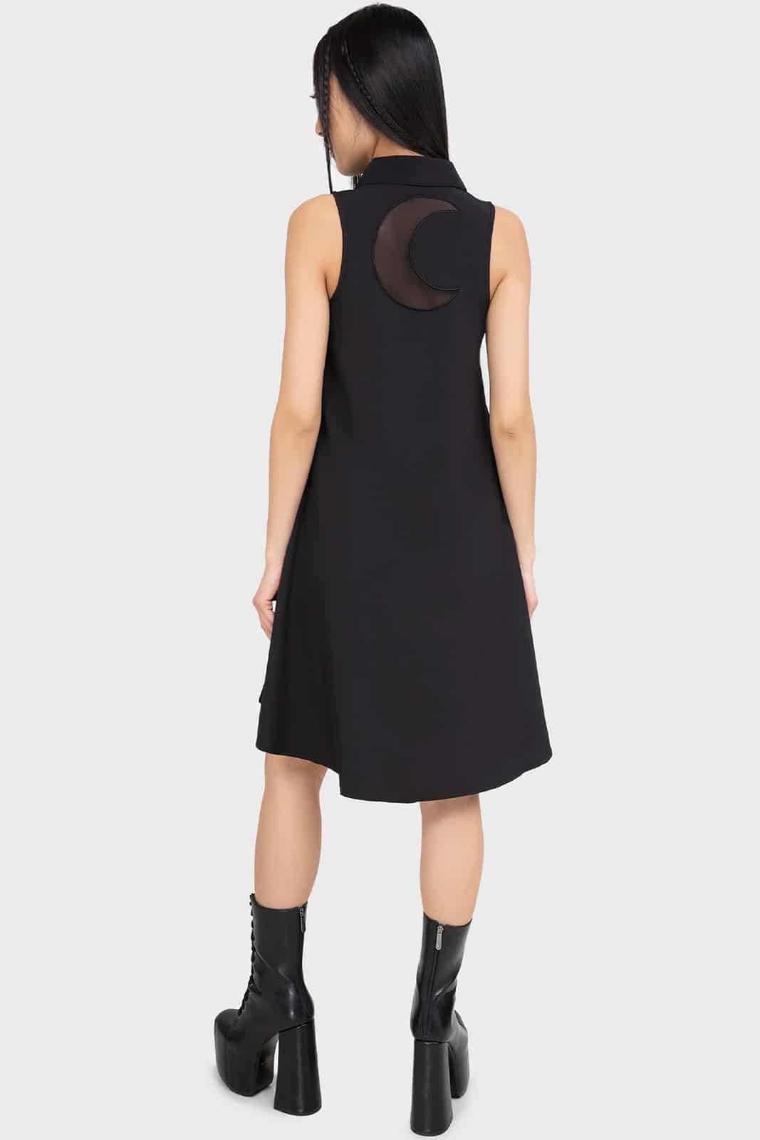 This gothic dress from the Kihilist range by Killstar combines mystical charm with a modern silhouette. The sleeveless design, combined with a flowing, asymmetric cut and a semi-transparent mesh moon on the back, creates an expressive look with a mysterious touch.