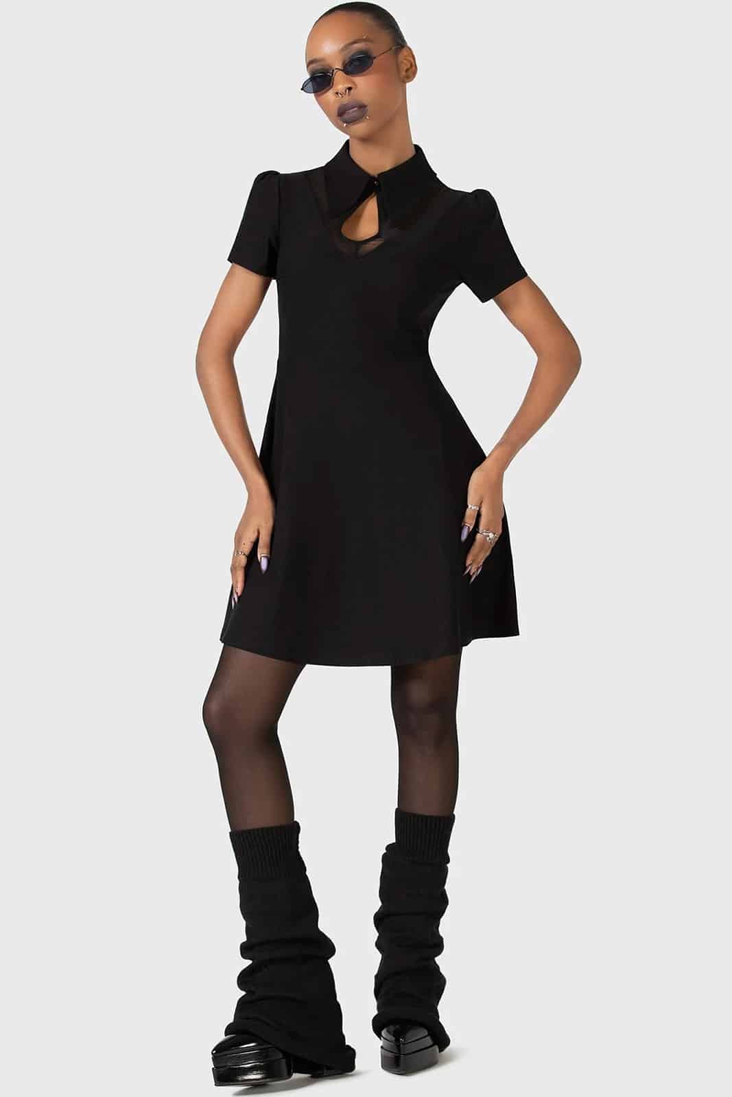 Kihilist mini dress made of soft and stretchy material with a large collar and button fastening. A charming mesh insert ends in short, cute puff sleeves. A keyhole detail adorns the area above the bust.