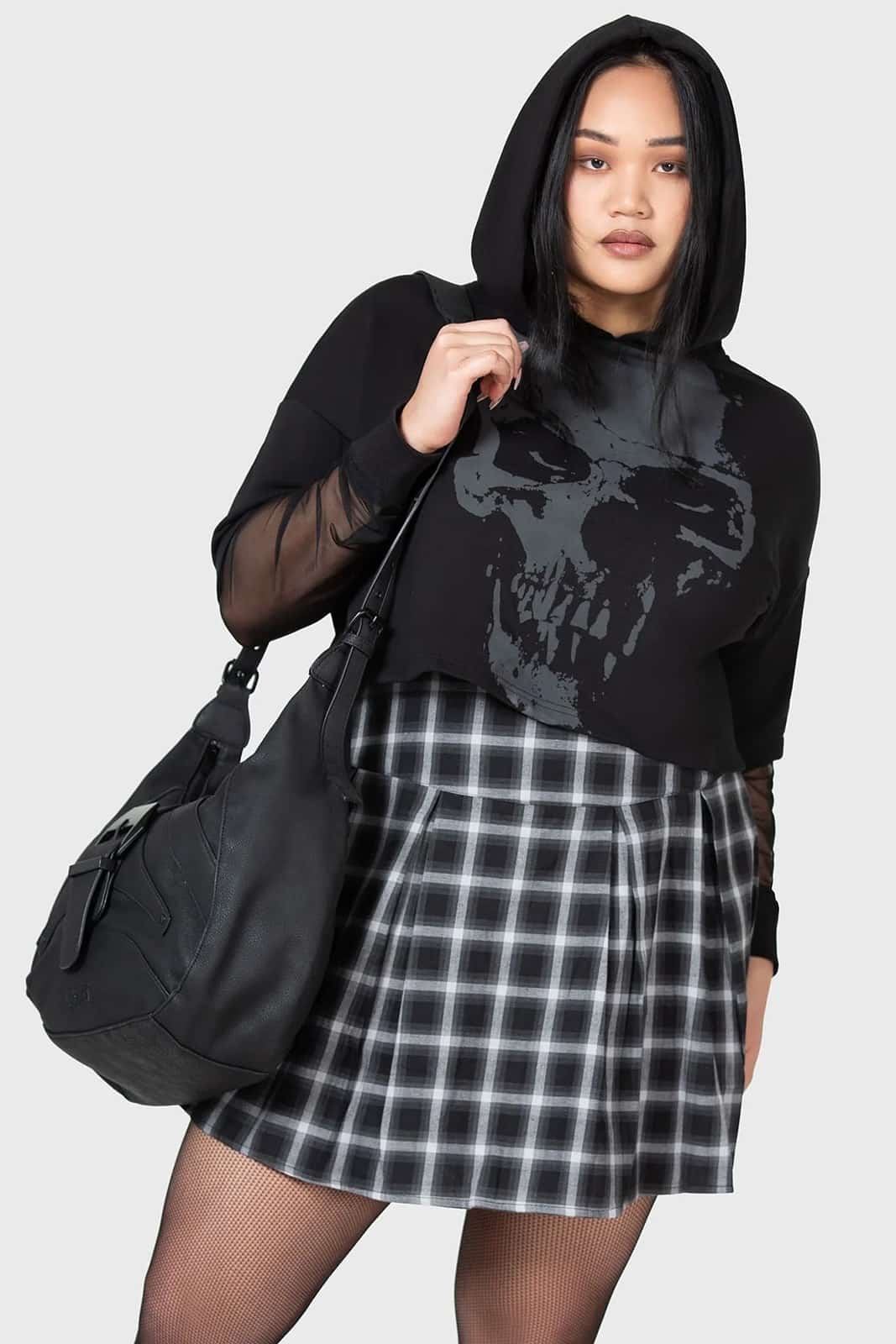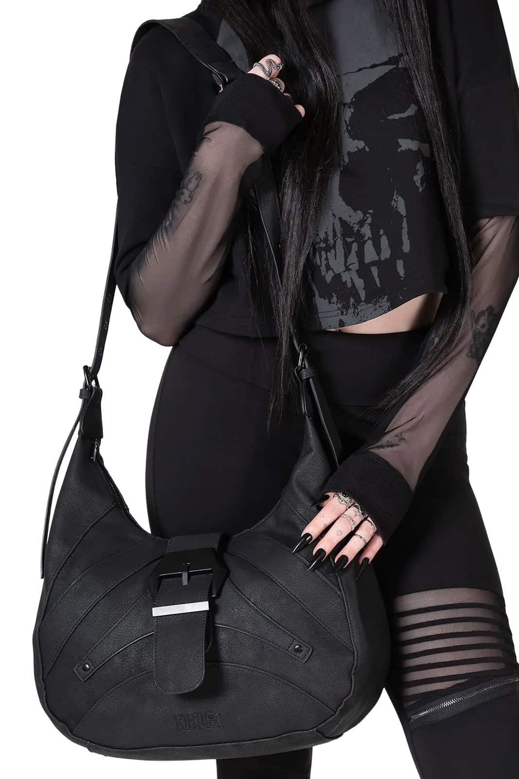 This black bag from the Kihilist range by Killstar combines functionality with a dark, edgy design. Made from soft, textured faux leather and equipped with an adjustable shoulder strap, it not only offers comfort but also plenty of storage space. Internal compartments and an external zipped pocket keep things organized, while the black hardware details complete the look. Perfect for everyday and nightlife.