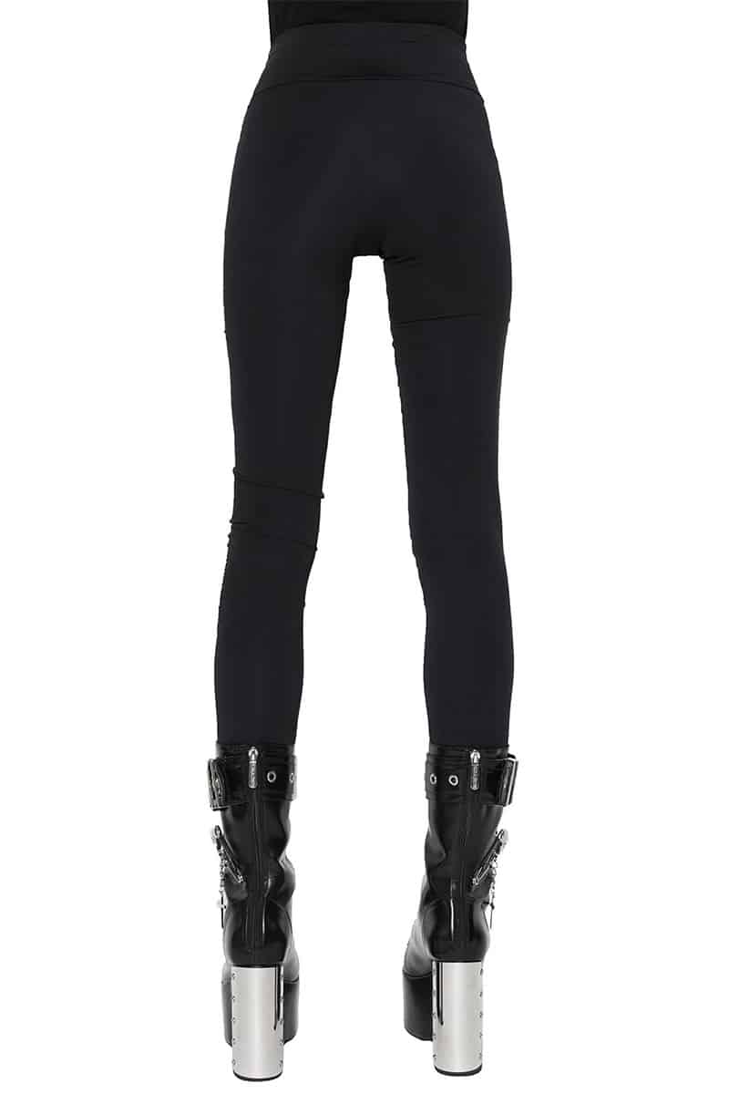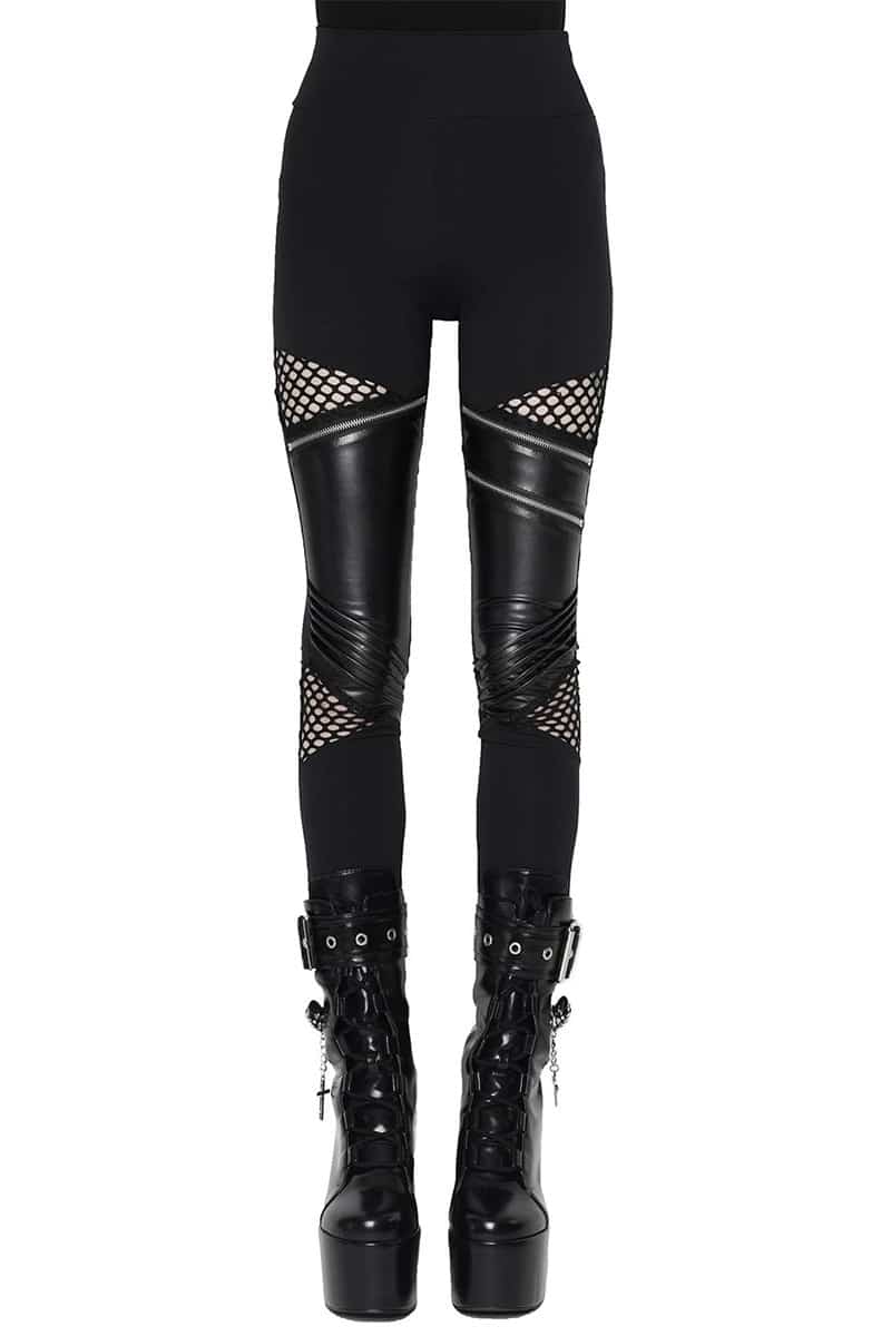 Gothic leggings made of slightly shiny material with a comfortable waistband, decorative seams, zippers and coarse fishnet and faux leather details.