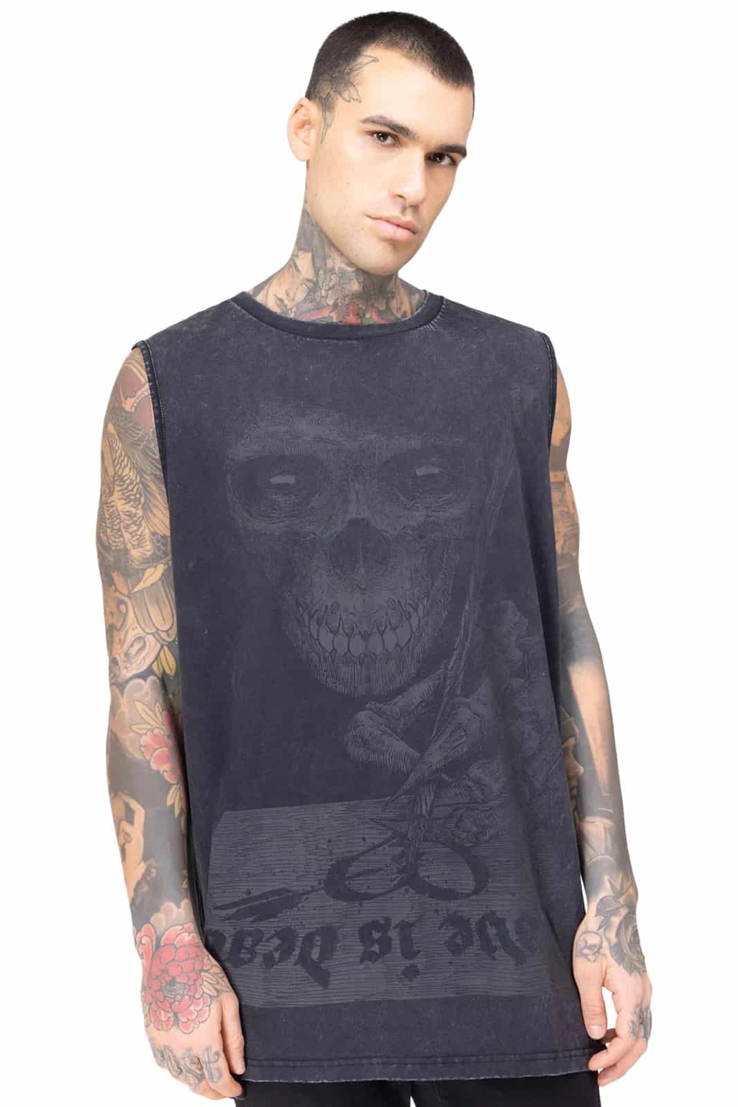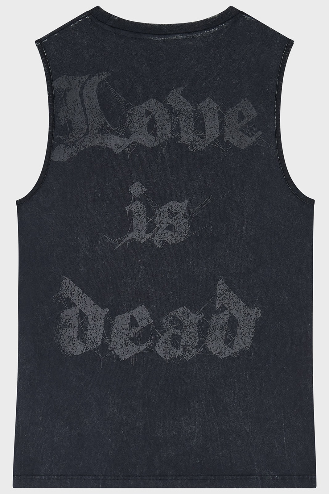 Sleeveless gothic shirt with a round neckline made from pure cotton. The front and back are decorated with various large prints.