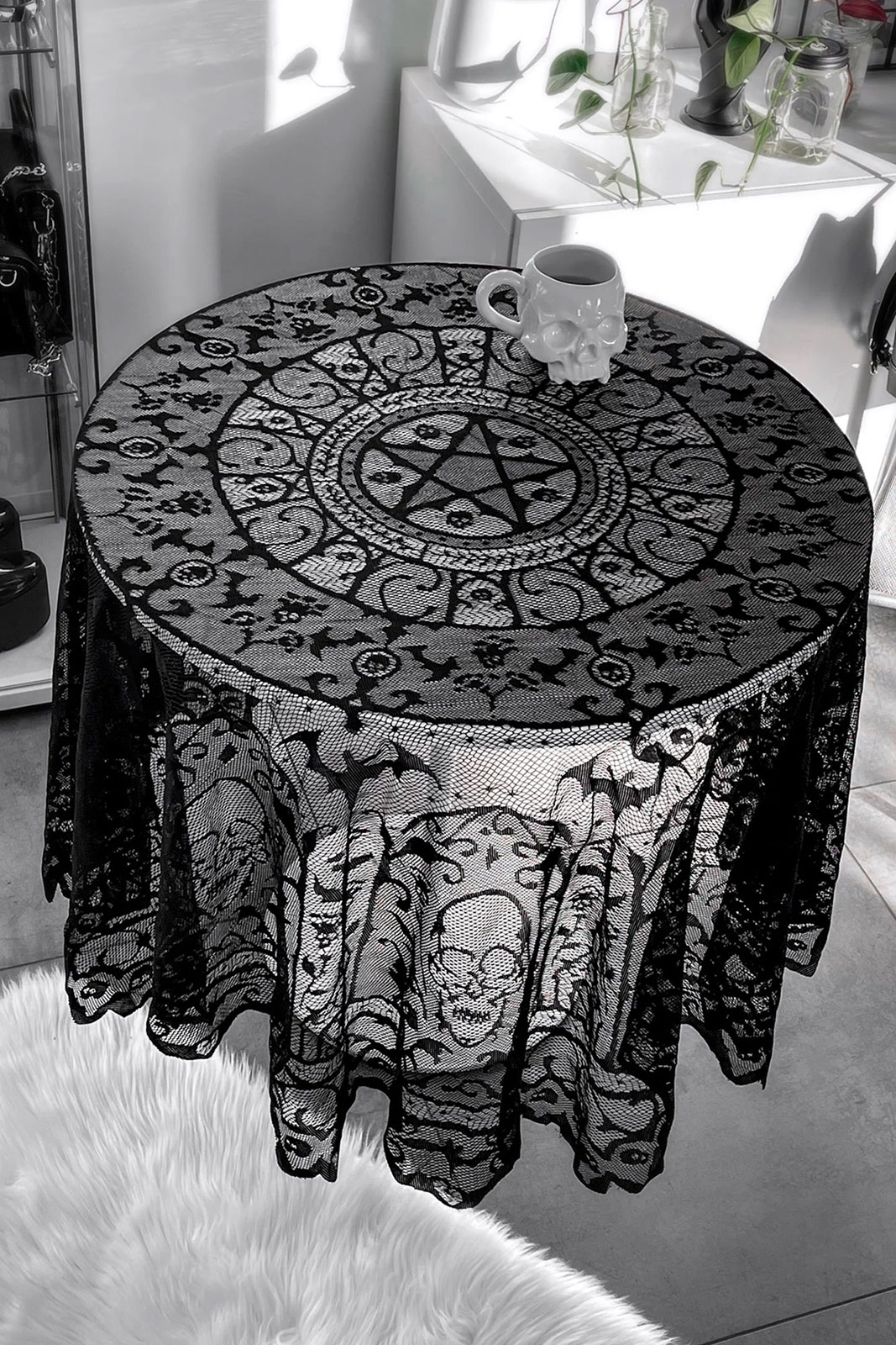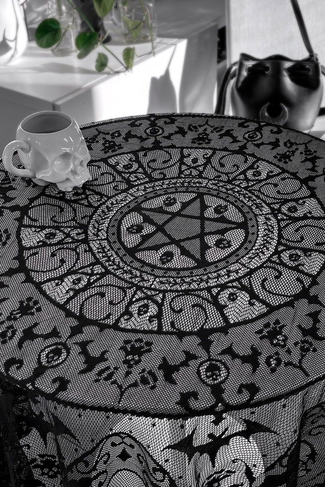 Black lace tablecloth with leaves, skulls, pentagrams and bats. The edge is wavy.