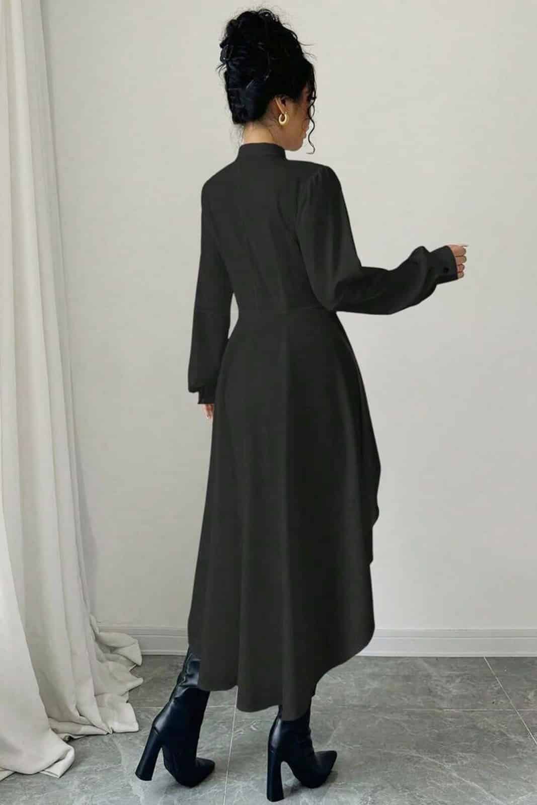 Exciting shirt dress with a short front and long back. The front is buttoned throughout. A short stand-up collar encloses the neck. The long sleeves are fitted with short cuffs.