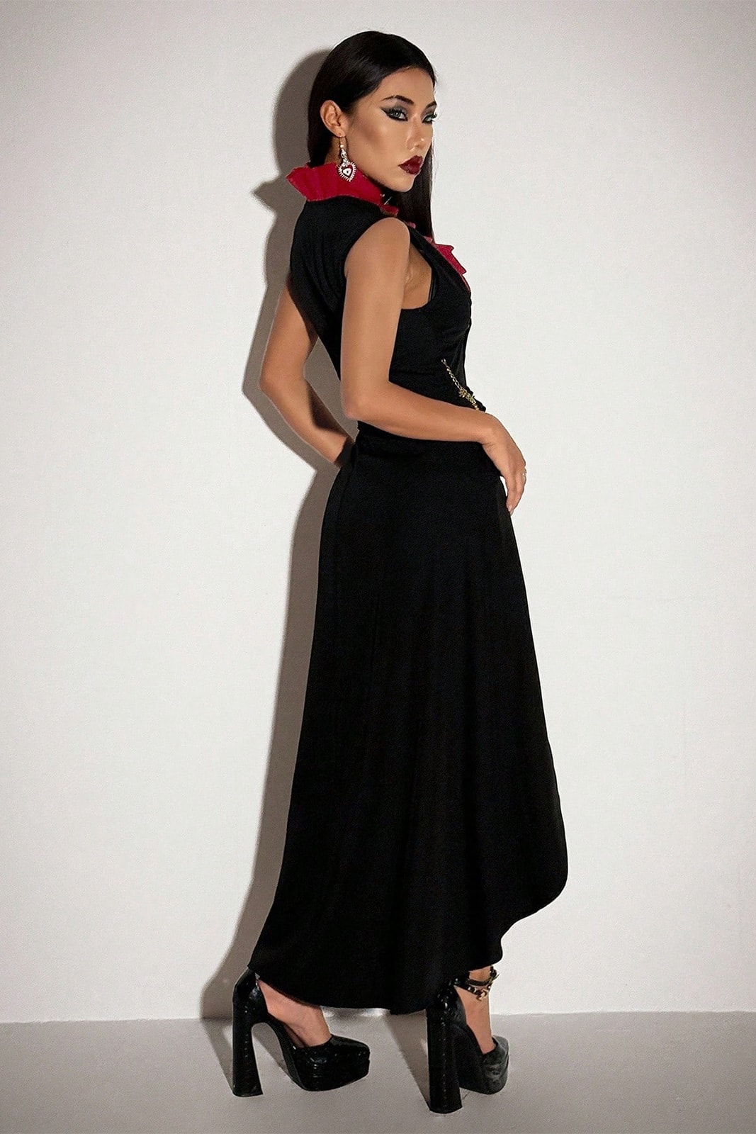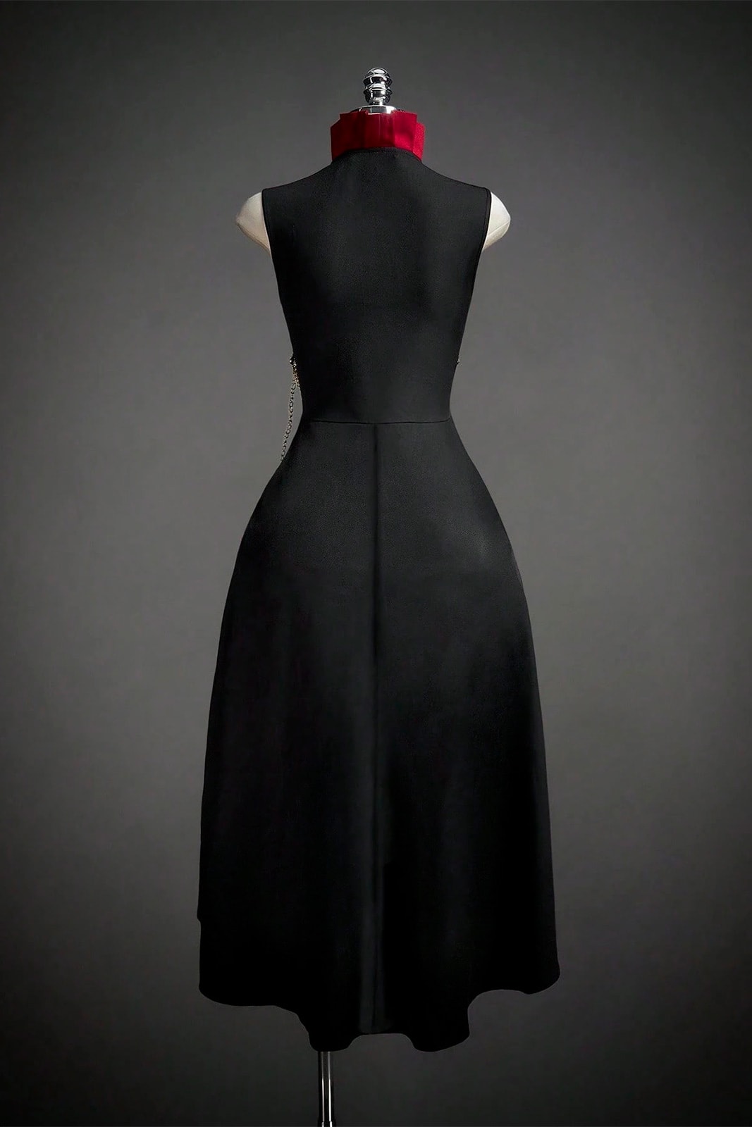 Dramatic gothic cape with a figure-hugging corset effect and high stand-up collar in deep blood red. The sleeveless silhouette and long asymmetric cut lend vampire and dark aristocratic vibes, while gold decorative chains accentuate the waist and hips. Made from 98% polyester and 2% spandex, this piece combines elegance, dark romance and stage presence – ideal as a coat, corset cover-up or dramatic costume highlight.