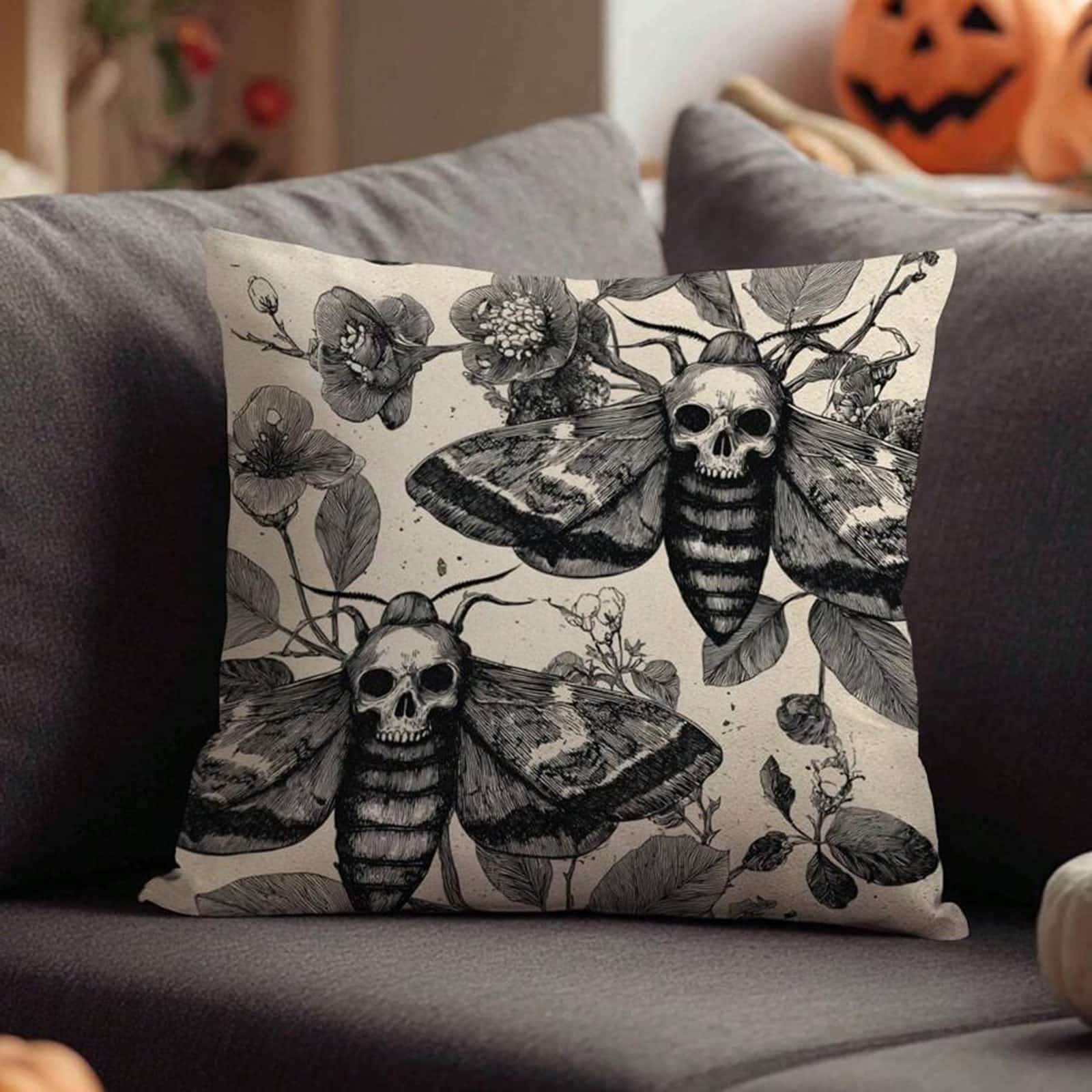 The Death’s Whisper cushion cover combines floral elegance with dark symbolism. The motif shows detailed skull and crossbones entwining over delicate flowers – a contrast of life and transience that lends any room a mysterious aura. Perfect for gothic interiors, dark aesthetics or as a striking decorative statement on the sofa or bed.