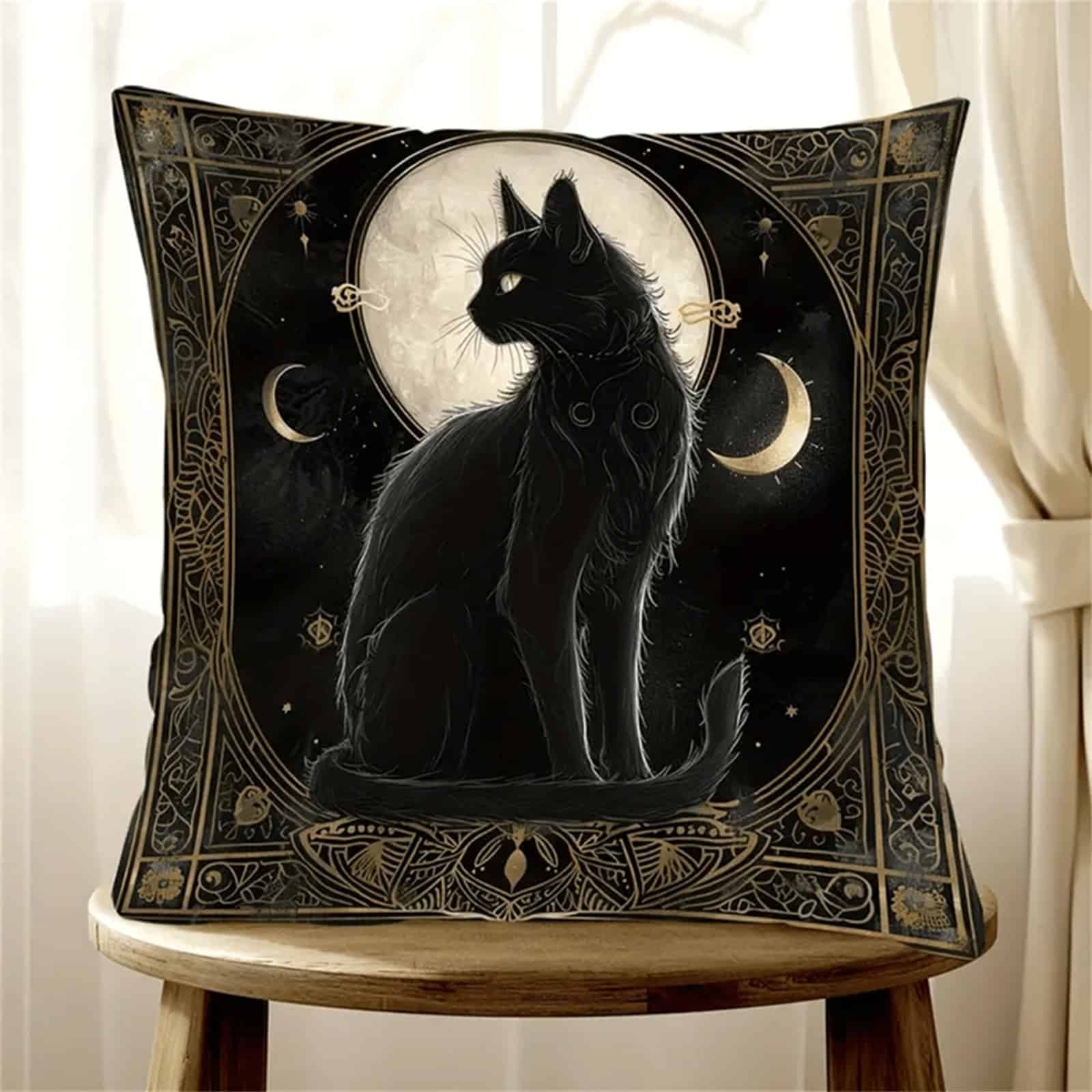 Black cushion cover with the motif of a black cat in front of a large full moon.