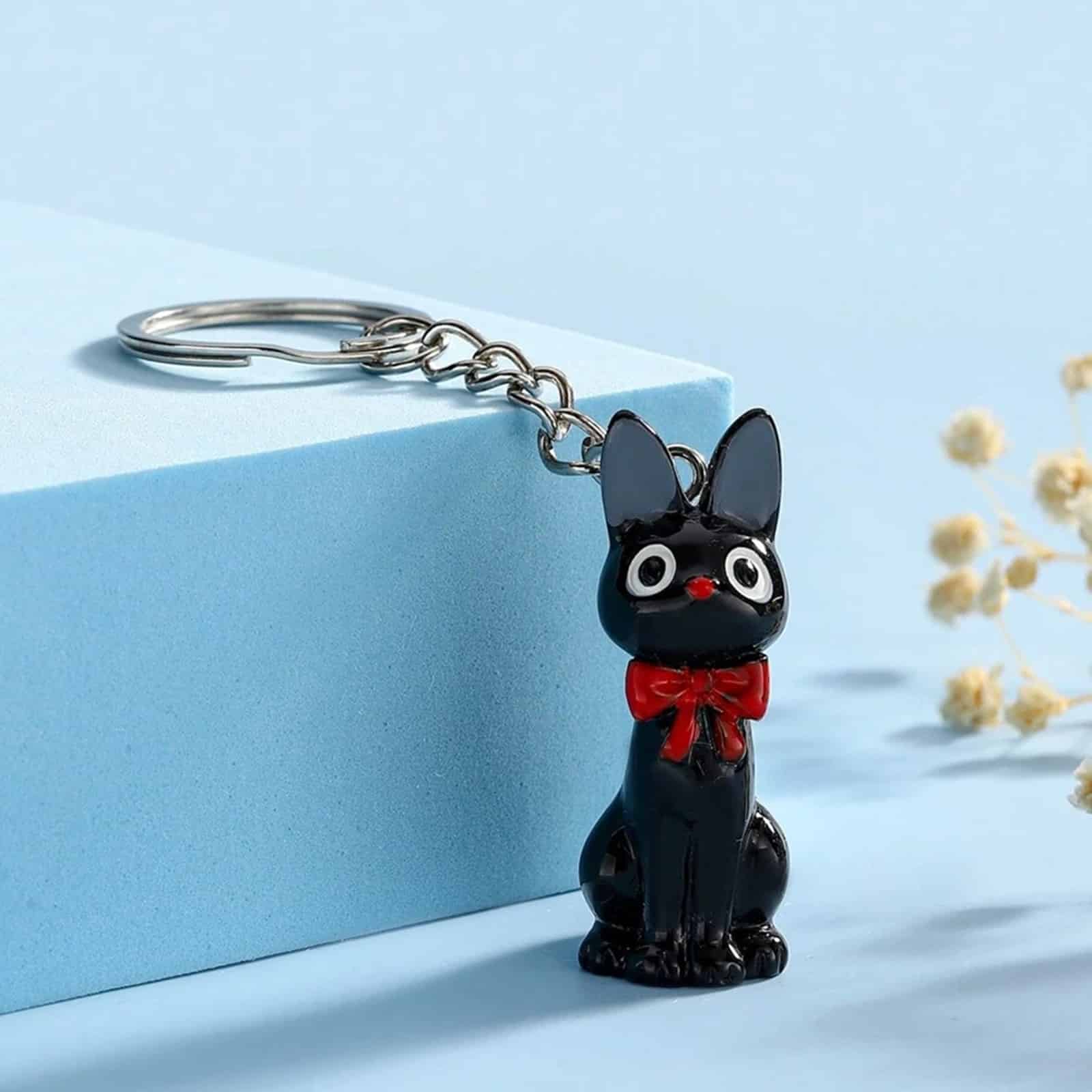 Cute key ring made of high-quality resin in the shape of a cat with a red bow.