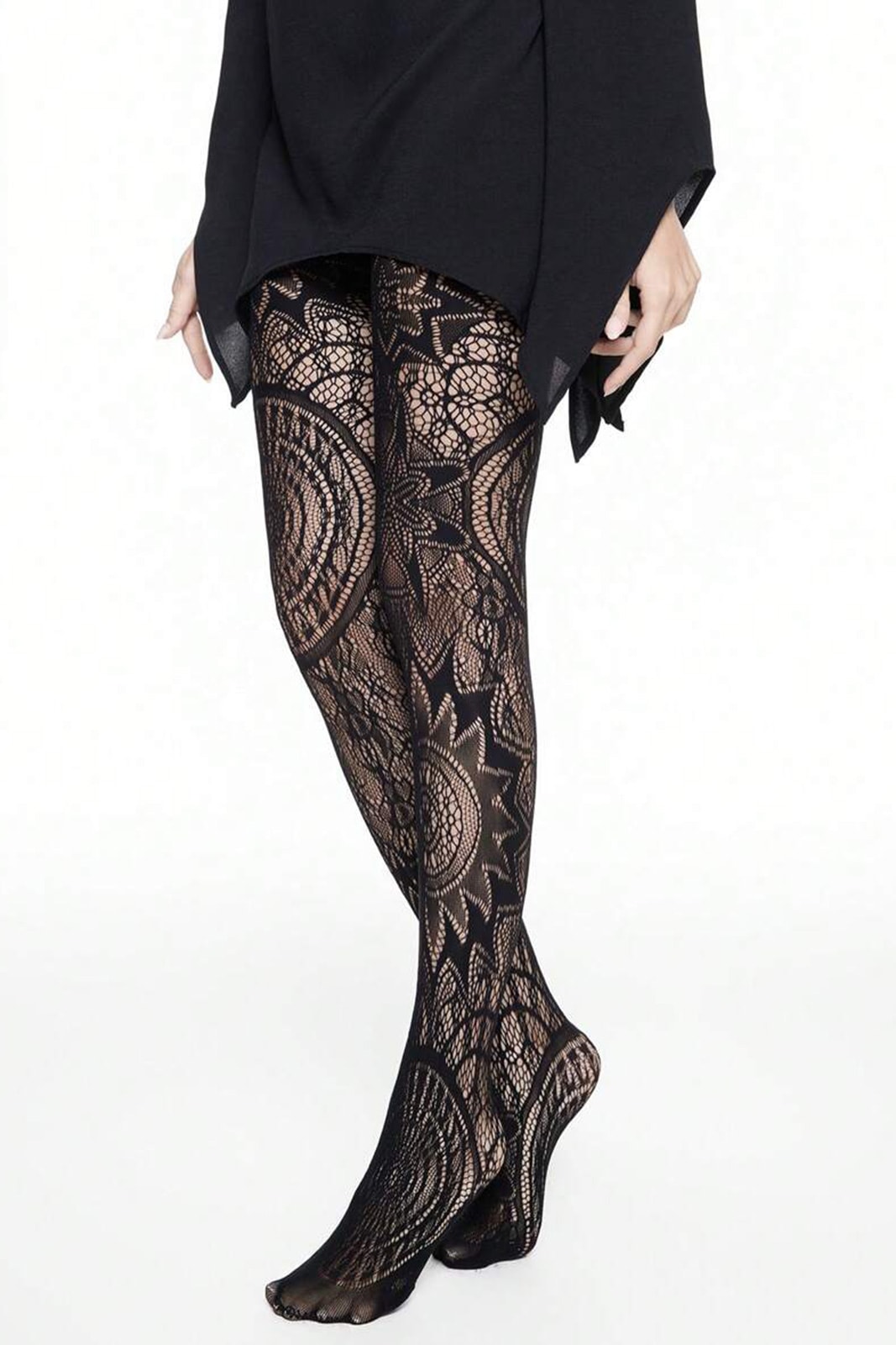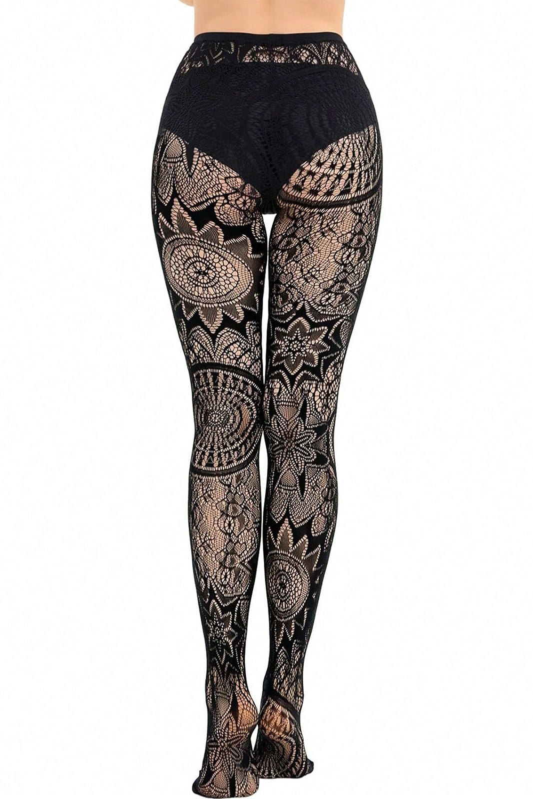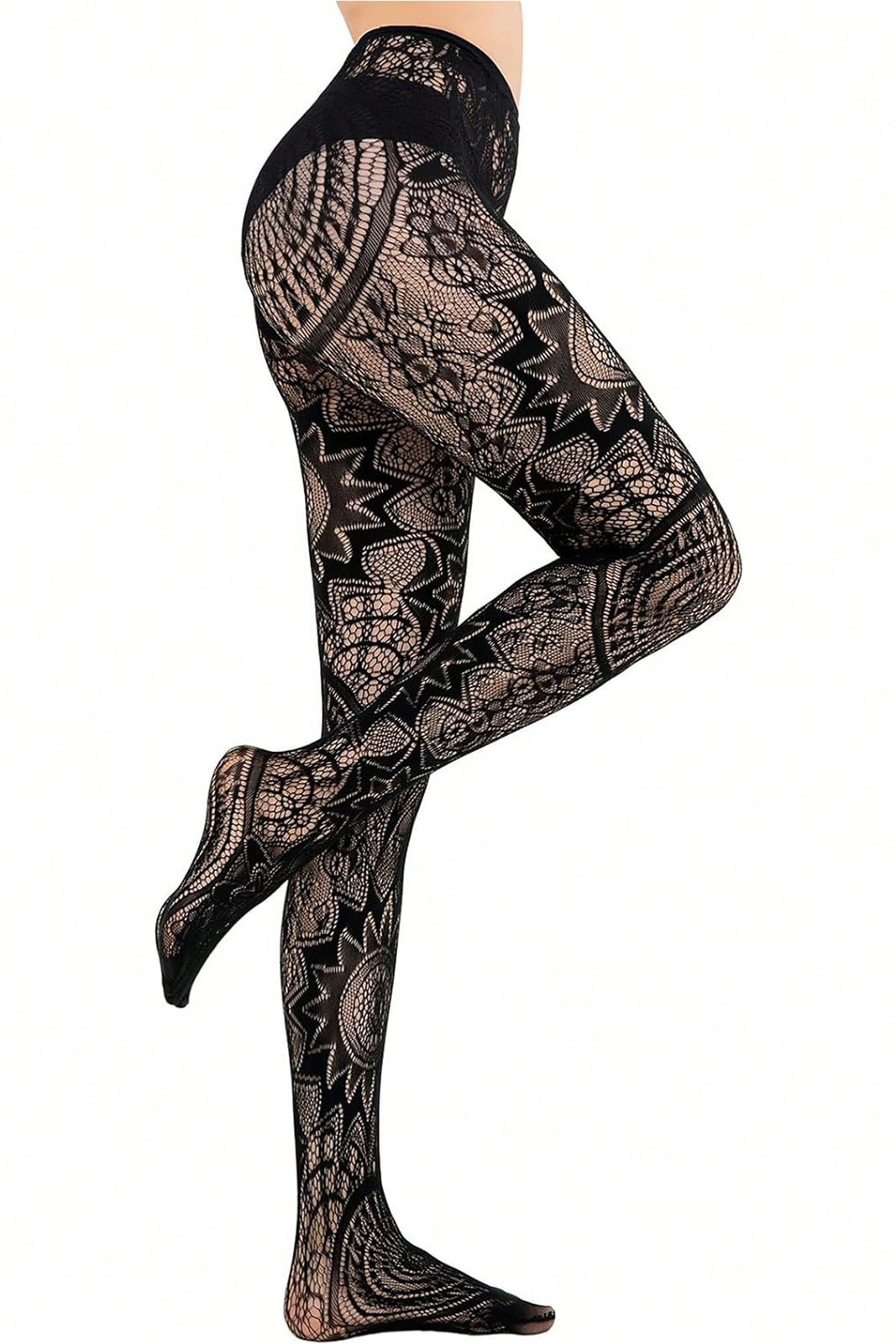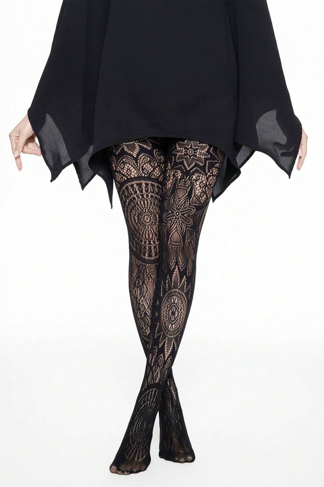 These tights are a real eye-catcher: the black mesh material is interwoven with artistic, mandala-like patterns that combine floral and star-shaped ornaments. The design runs the entire length and creates an extravagant, seductive look. The elasticated waistband offers a comfortable fit, while the transparent pattern shows off the legs to great effect – perfect for gothic looks, elegant outfits or as an eye-catching detail in party style.