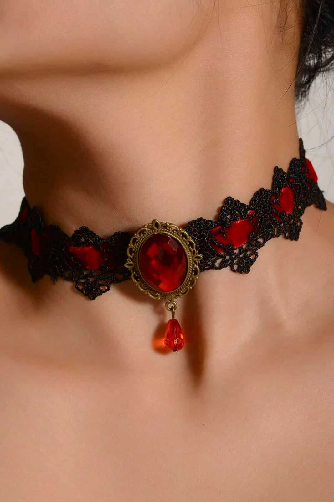 Gothic necklace made of fine lace set with a large red faux stone and a faux pearl. Closes with a lobster clasp.