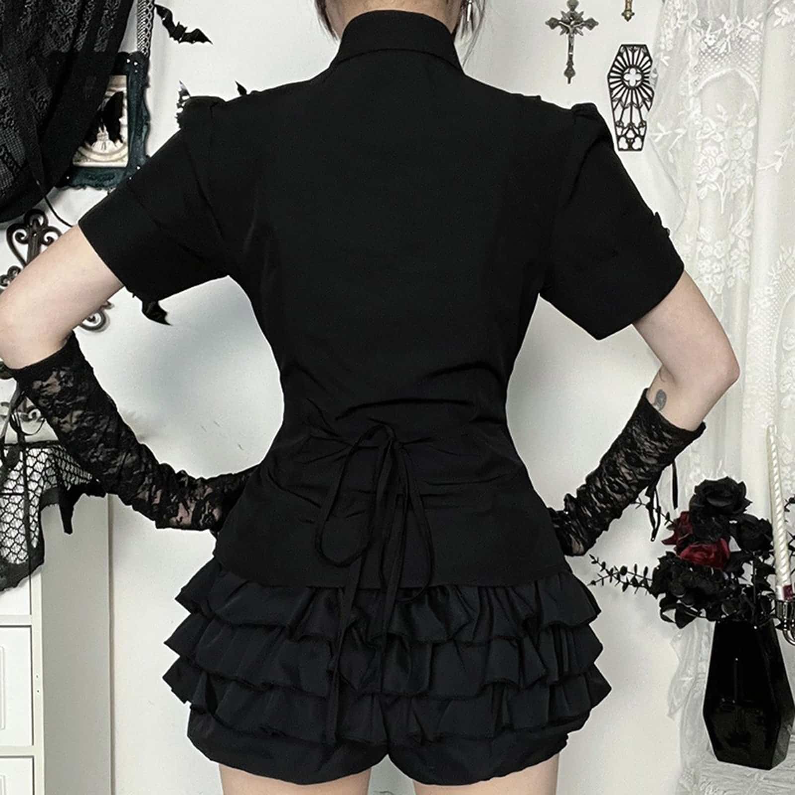 The Noir Echo blouse combines classic elegance with a touch of dark romance. Made from a high-quality, slightly shiny fabric, its tailored fit emphasizes the silhouette in a particularly flattering way. The striking ruffle trim along the button placket creates a playful, Victorian-inspired detail that adds depth and expression to the overall look. The short puffed sleeves emphasize the feminine character, while the shirt-style collar adds stylish structure. Whether as a contrast to playful skirts or as a statement piece in a dark ensemble – this blouse is a stylish basic for any gothic or elegance lover’s wardrobe.