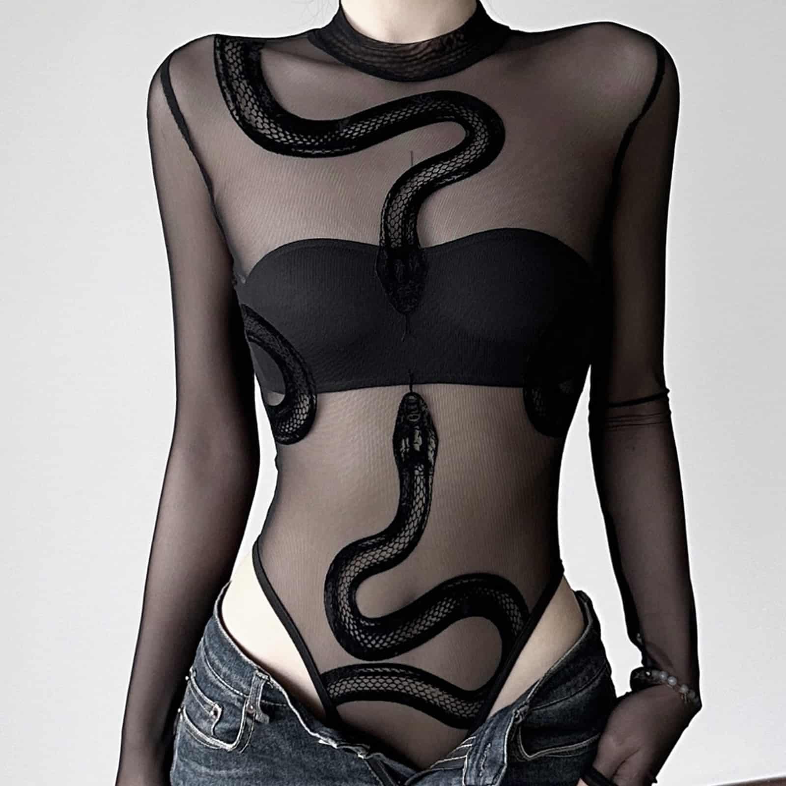 Seduce with a hint of danger – the Serpent Body made from fine mesh is a real eye-catcher. The see-through fabric clings seductively to the body, while the impressive snake motif in black accentuates the silhouette like a mysterious tattoo. The long sleeves and high-neck collar create a sensual balance between elegance and rebellion. Whether as a statement piece in the club or as an edgy layer under jackets and tops – this bodysuit adds a tantalizingly dark touch to any outfit.