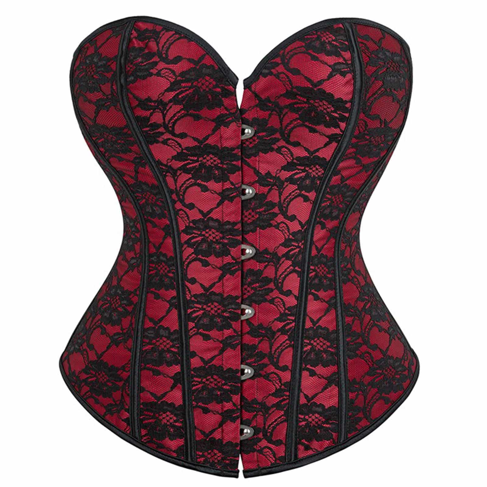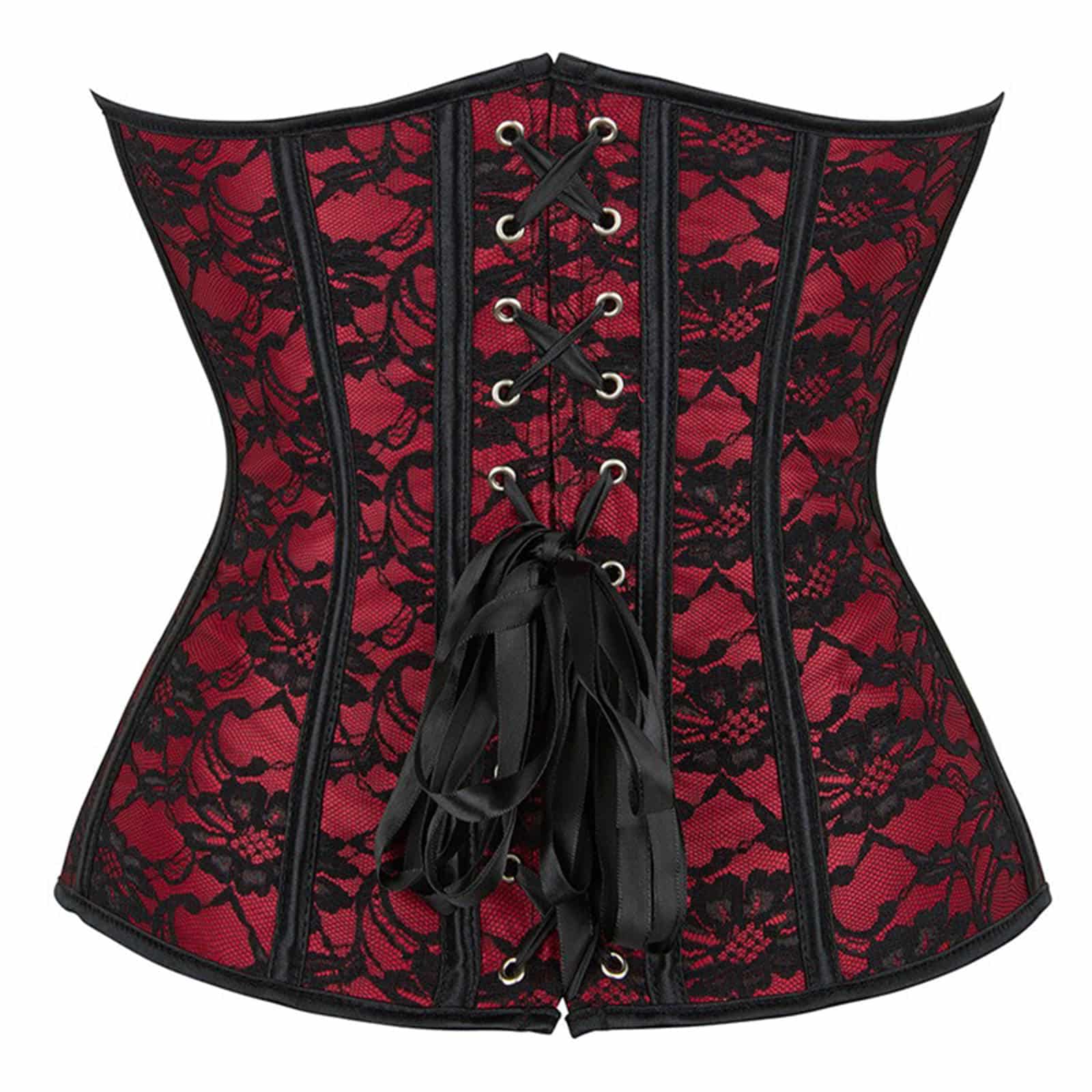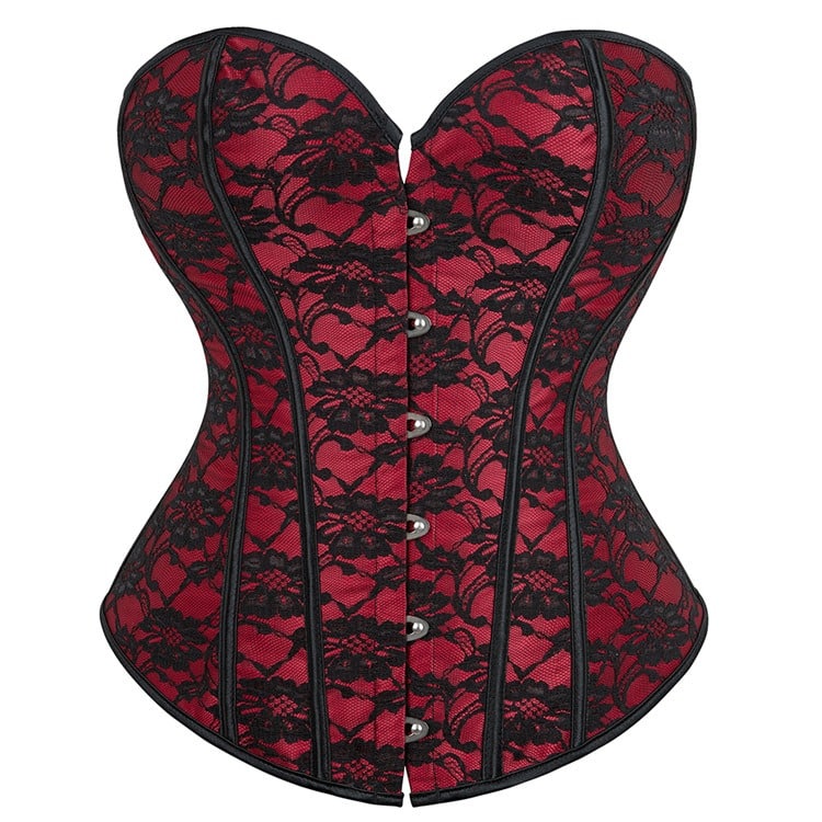Classic overbust corset with plastic stays, back lacing and hook closure. The slightly shiny brocade material with floral pattern is comfortable to wear and attracts attention. Can be combined in many ways.