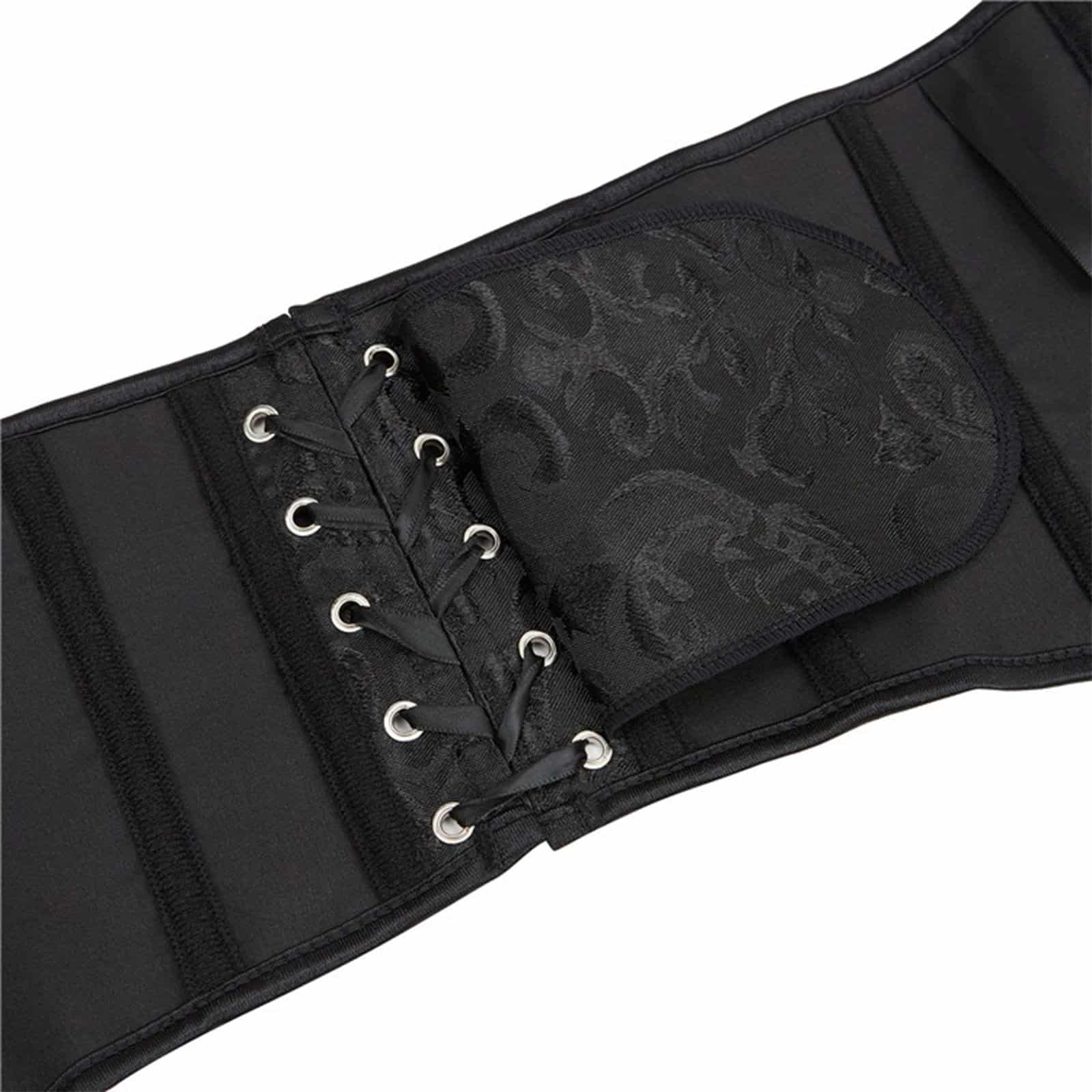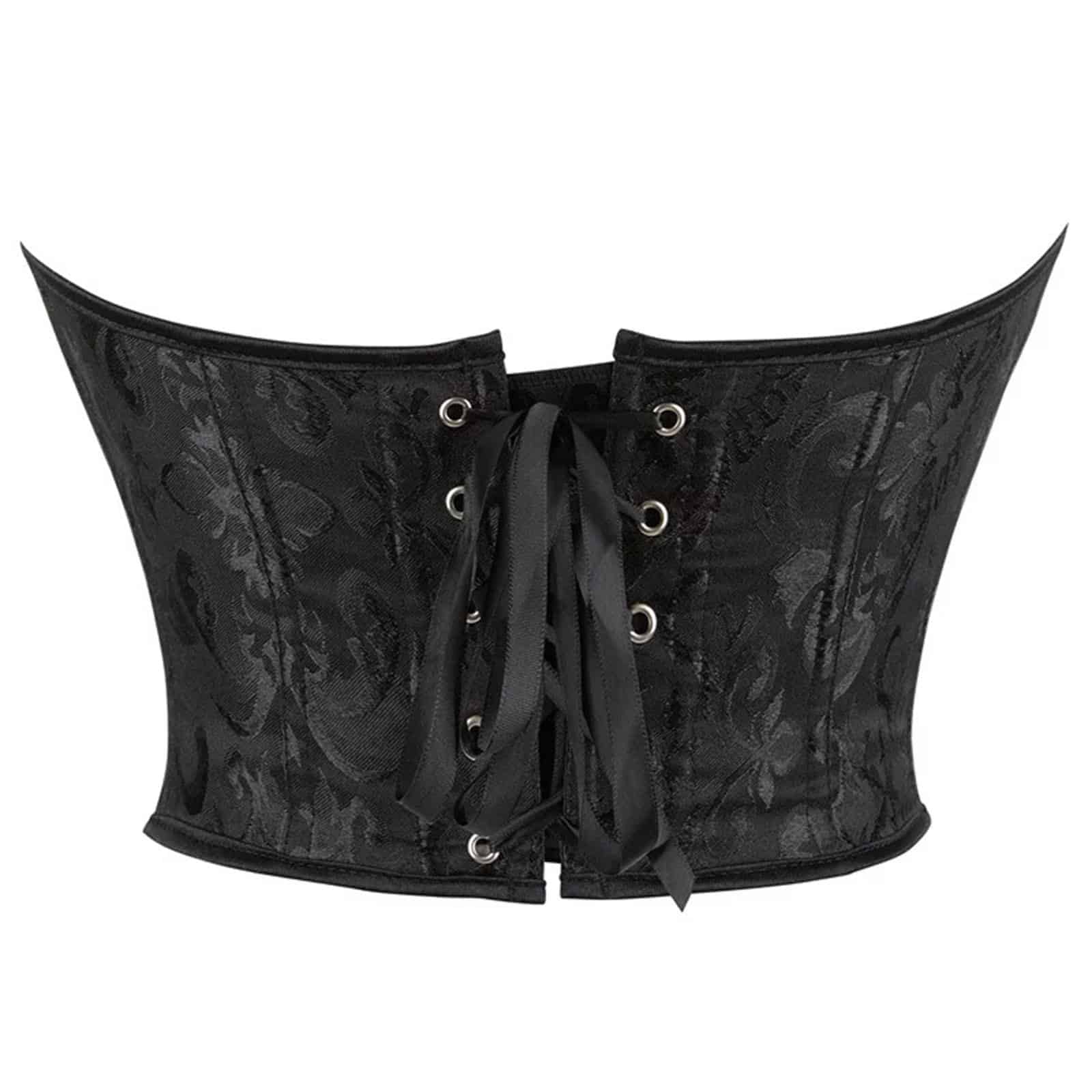 Short cut overbust corset with plastic stays and back lacing. The front is equipped with a hook closure. The back lacing is lined with a flap. A beautiful brocade pattern adorns the entire material.