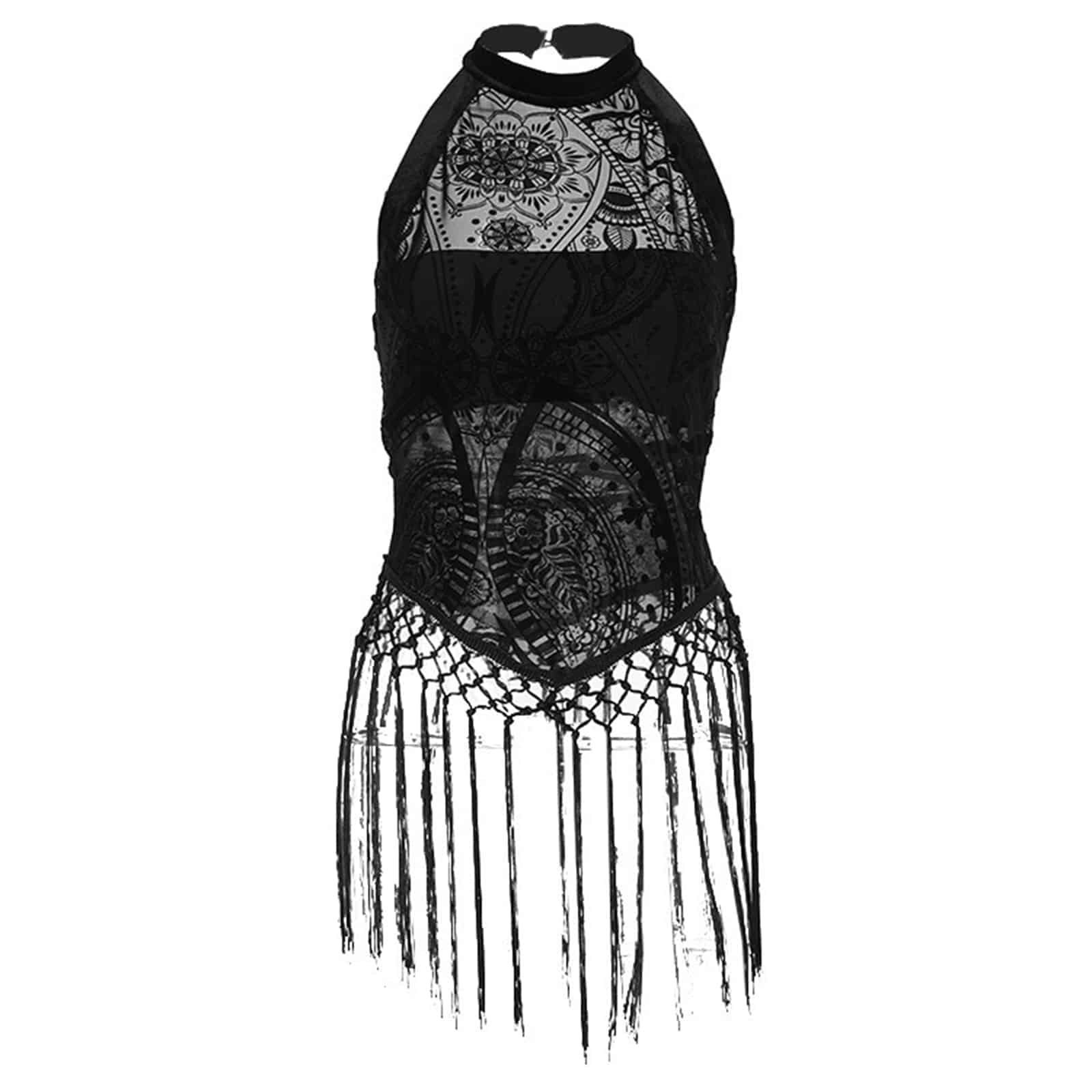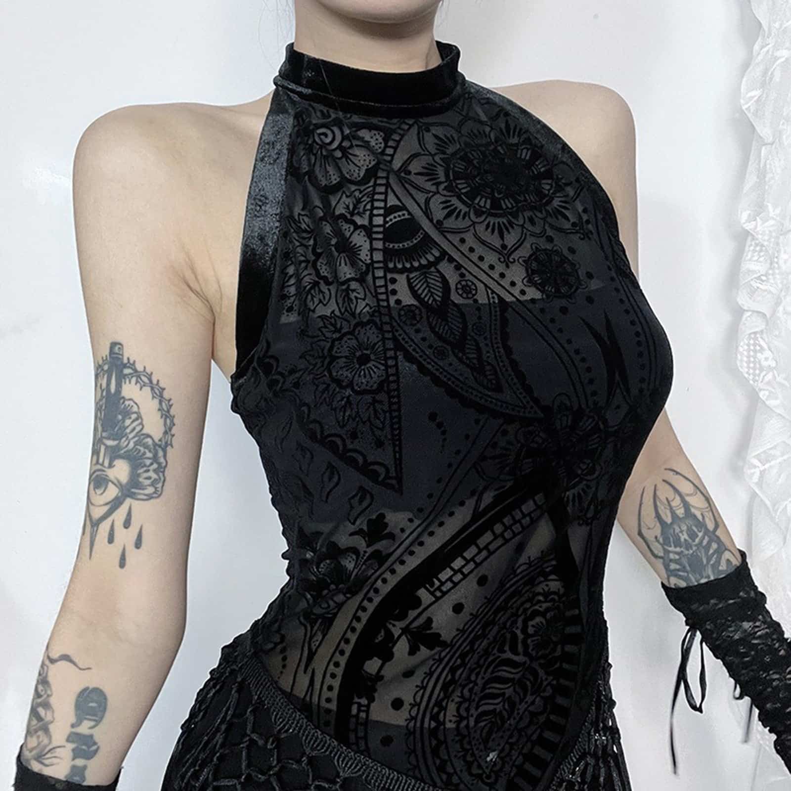Sleeveless gothic top with a fitted cut and button fastening at the high neck. The slightly transparent fabric is floral flocked and has a pretty fringed hem.