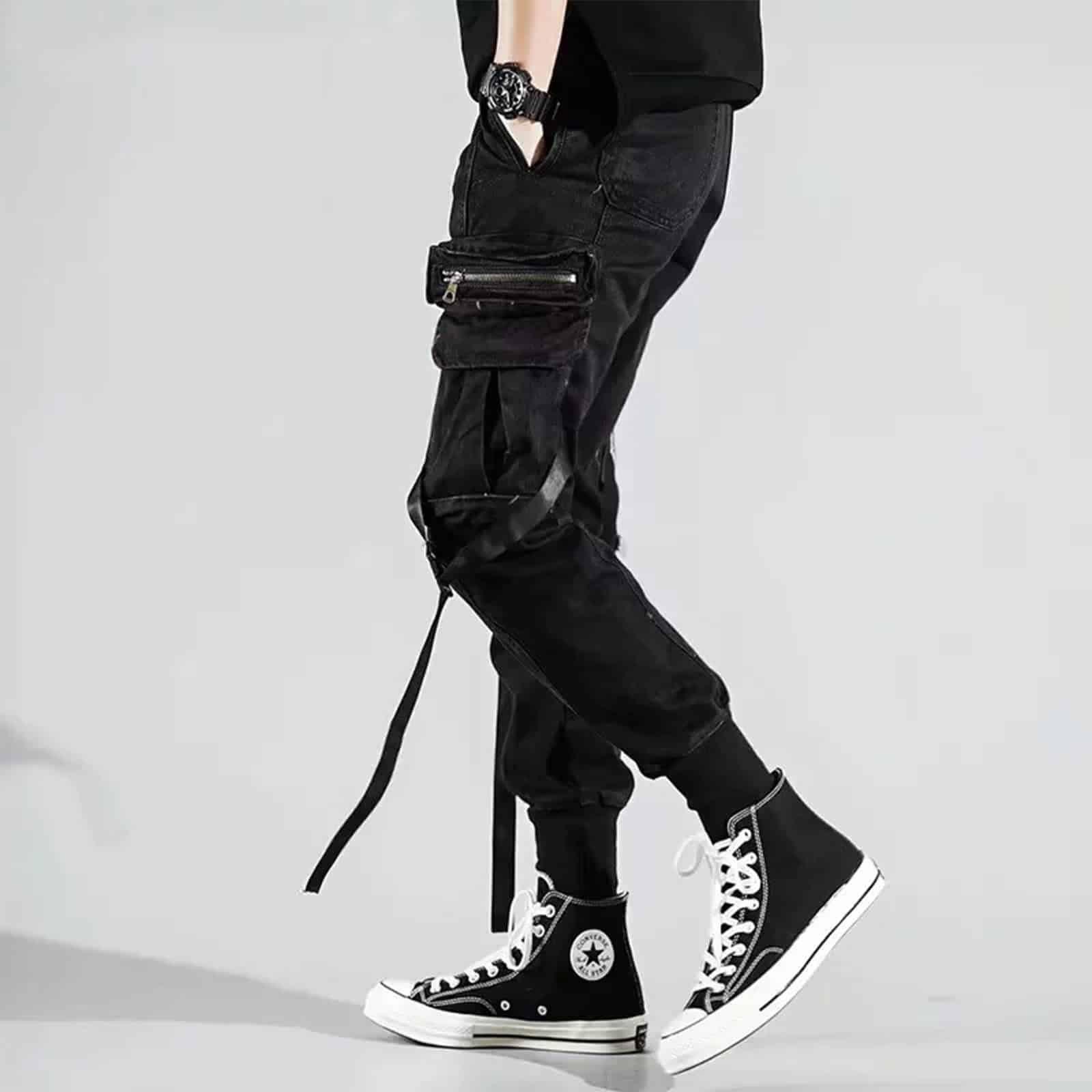 Casual pants with elastic waistband and drawstring. Two slide-in pockets are incorporated on the side. Two back pockets are found on the back. Pockets are placed on both sides of the thighs. There is an additional small zippered pocket on the left thigh. Wide comfortable cuffs close the pants on the leg. Adjustable straps are attached to the thighs.