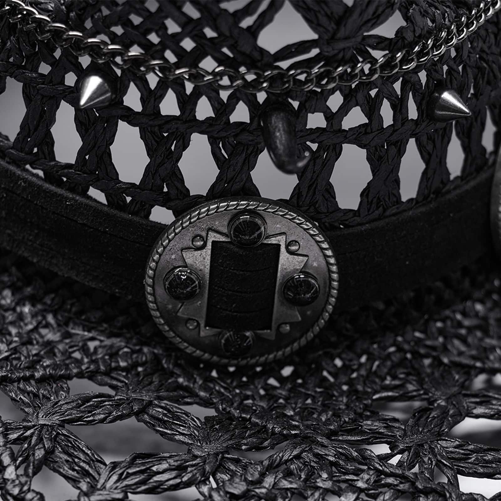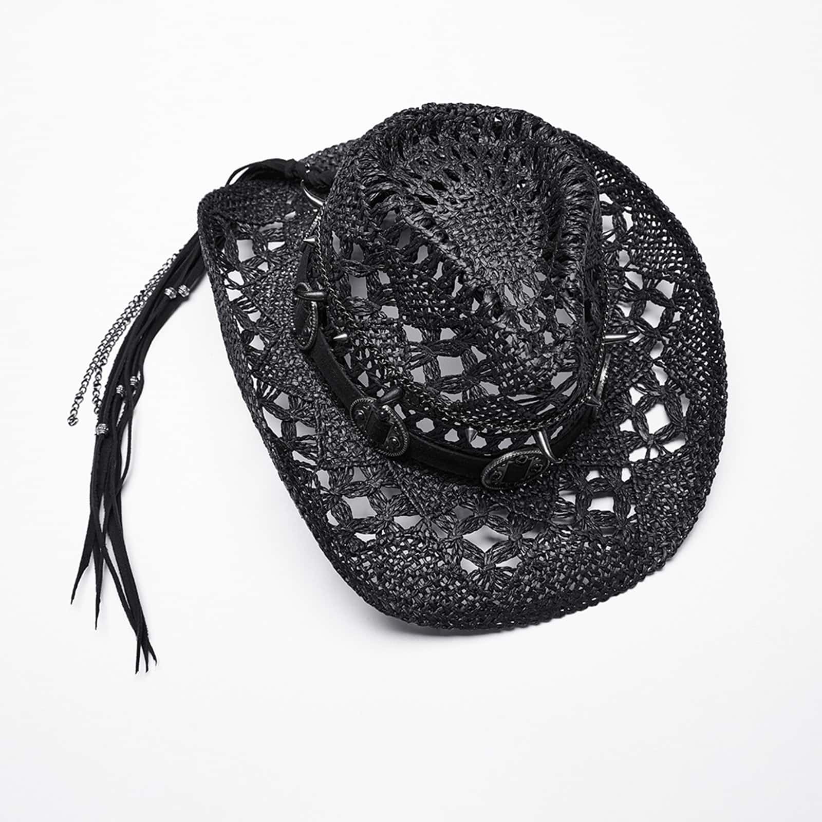 The Rebel’s Tribe cowboy hat takes the classic western style and transforms it into something grittier, suitable for those who wander off the beaten track. This black cowboy hat features an open, decorative weave pattern that hints at a rebellious, free spirit, while strips of faux suede adorned with circular metal motifs and a hanging, beaded ‘tail’ add a touch of mystique. Simple and curved spikes with chain details add the perfect finishing touch, combining rusticity with a gothic touch.
