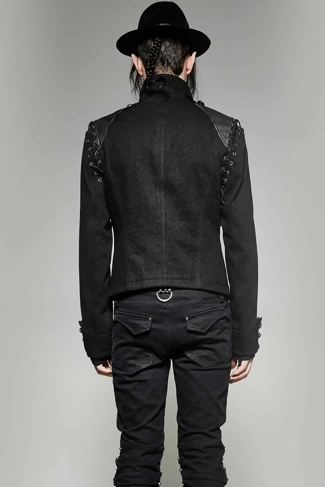 Jacket conjured from high quality twill fabric with details in vegan faux leather. The mandarin-style collar flows directly into a full-length zipper. The front decor is inspired by a vintage military uniform and trimmed with embossed metal buttons. Two zippered side pockets and decorative cuffs complete the look. The sleeves are attached to the body by lacing. With the sleeves removed, it can be worn as a vest.
