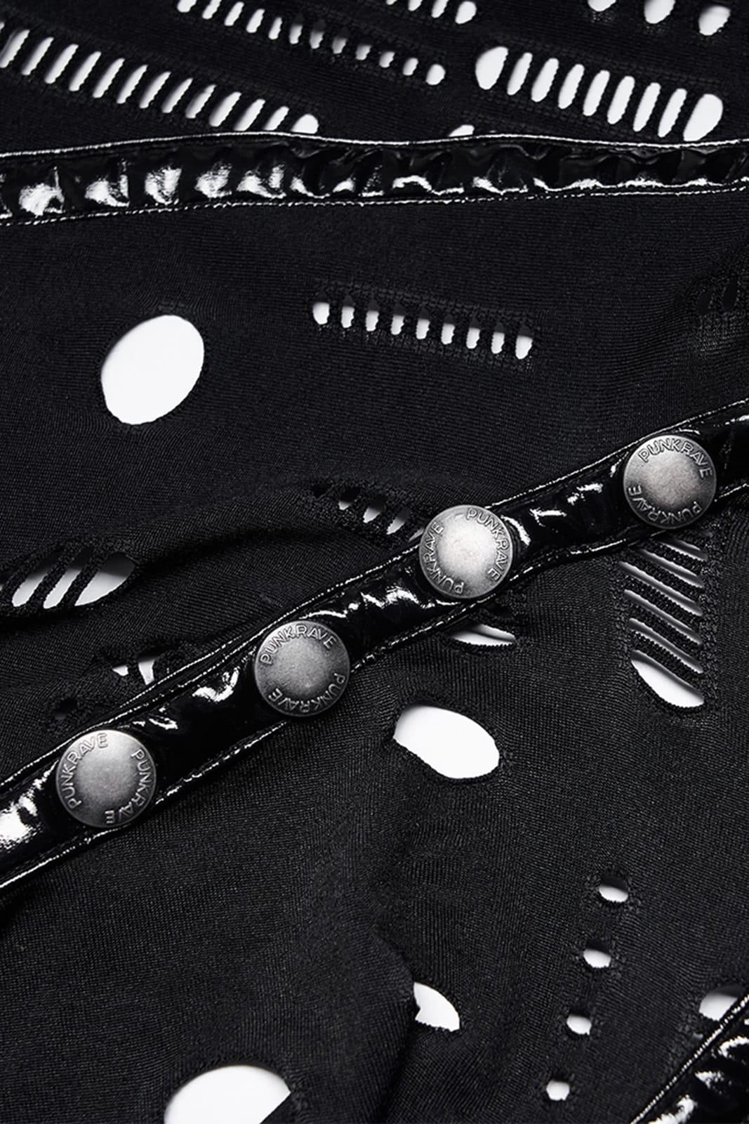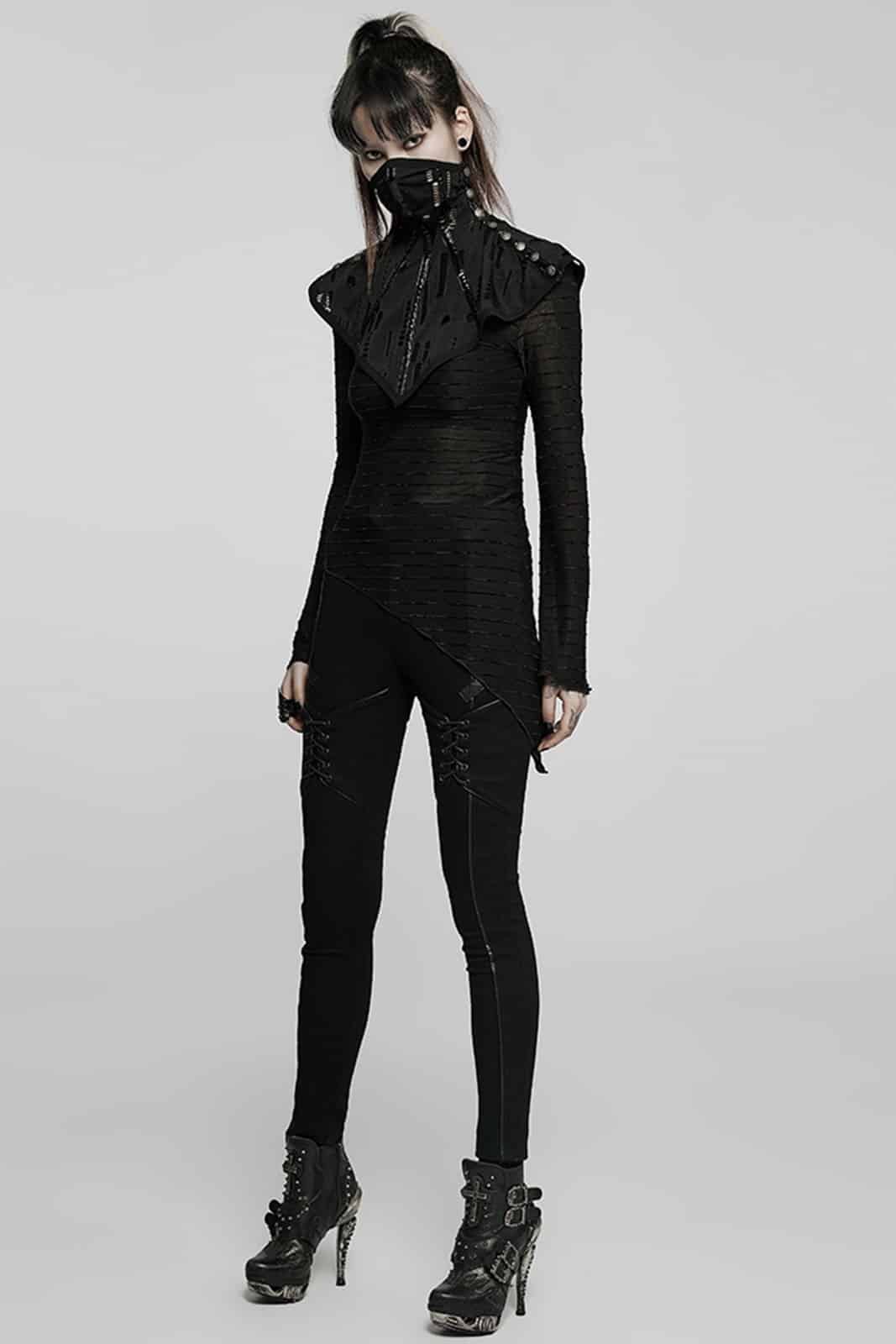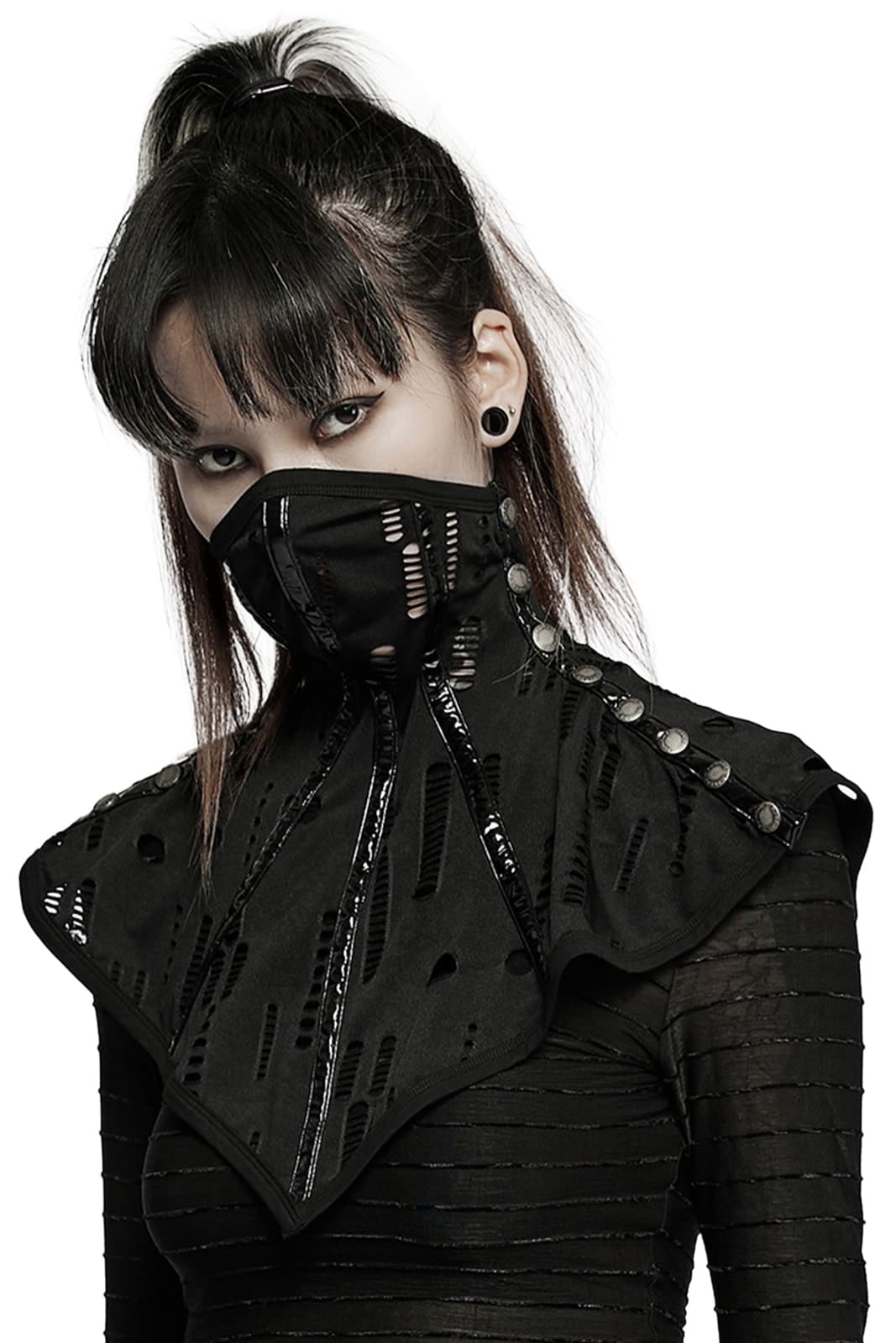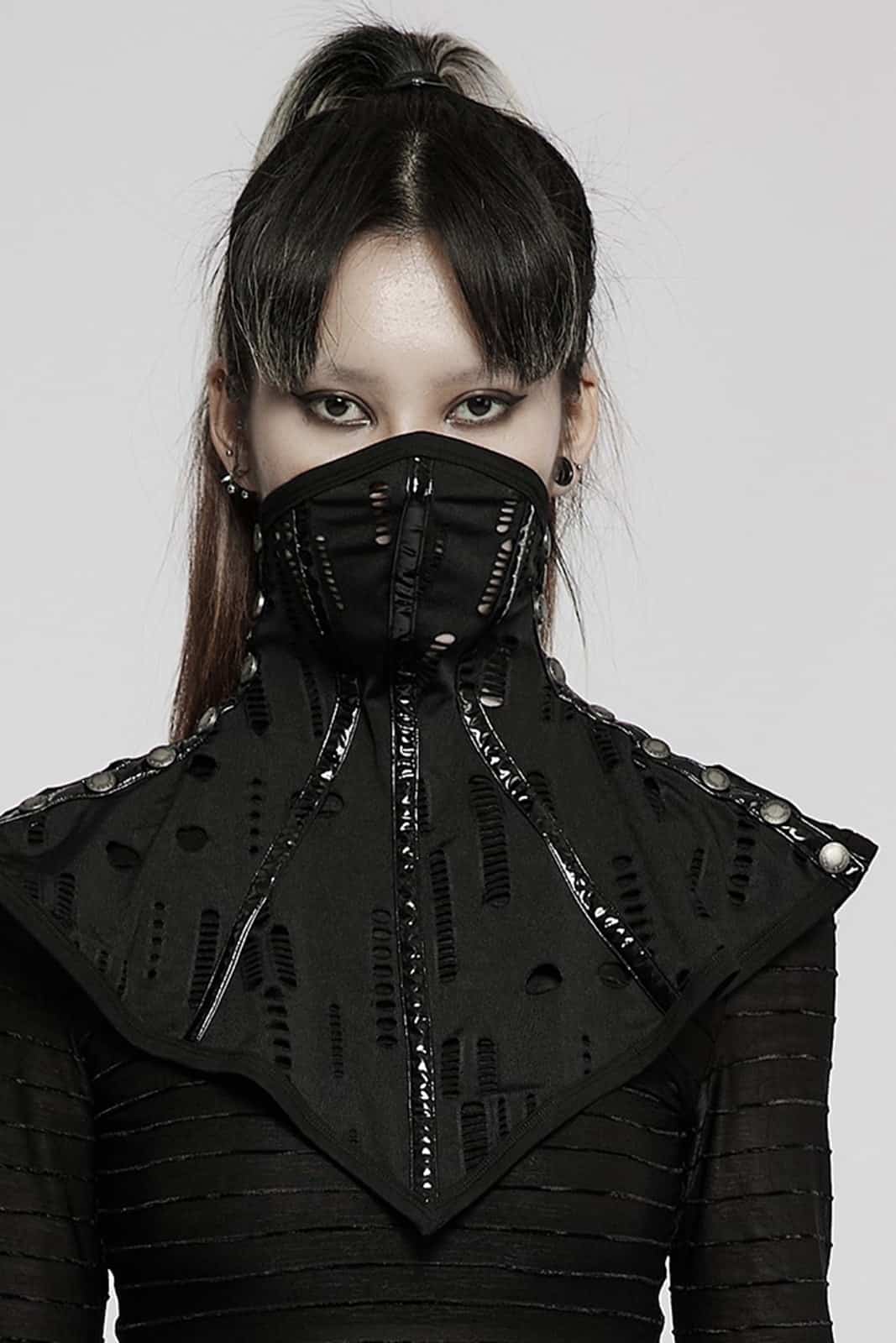 This unusual post-apocalyptic-style accessory combines a mask element, collar and corset look in one. The black, distressed knit material is accentuated by shiny PVC details, while the shoulder section is closed with press studs. A dark design piece that instantly gives any outfit a rebellious, futuristic look.