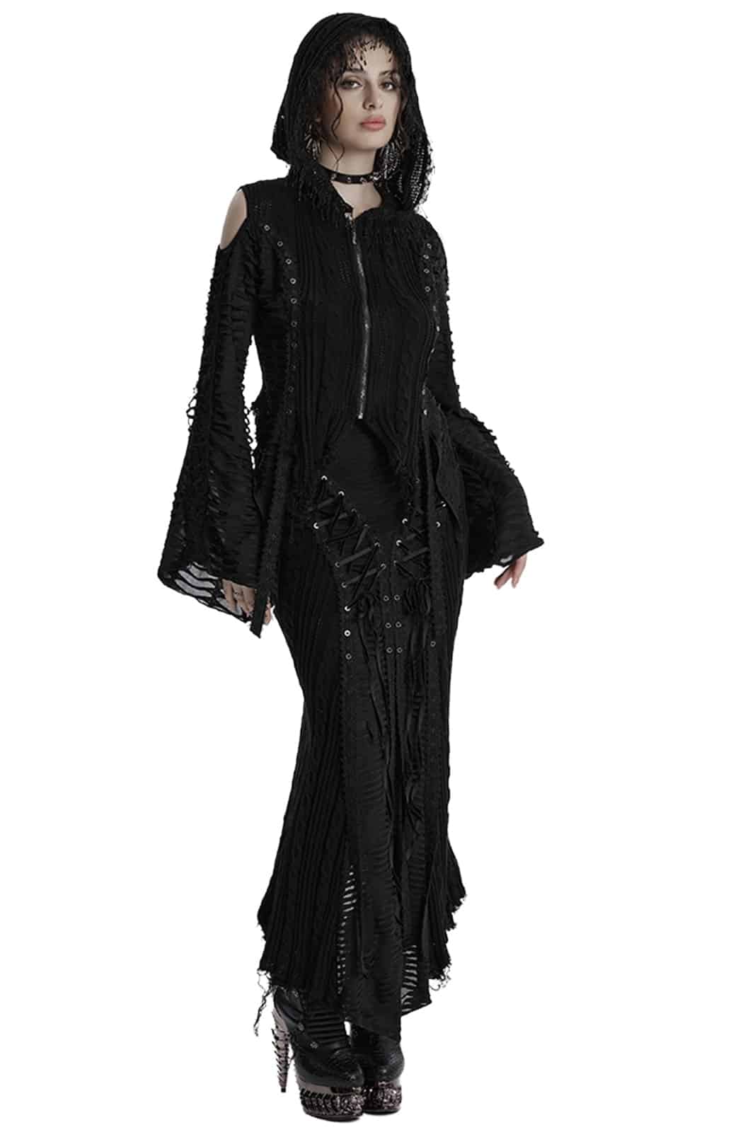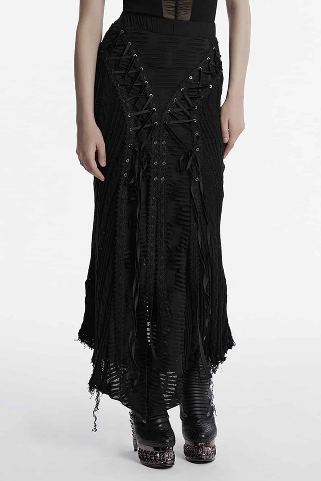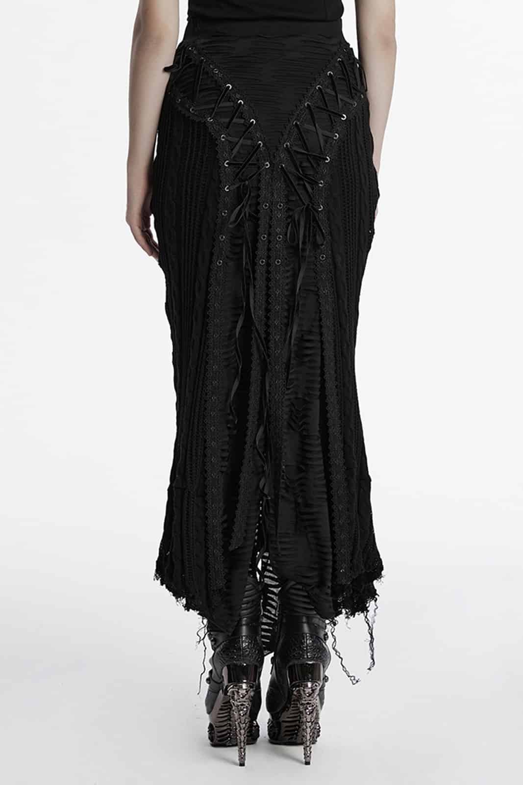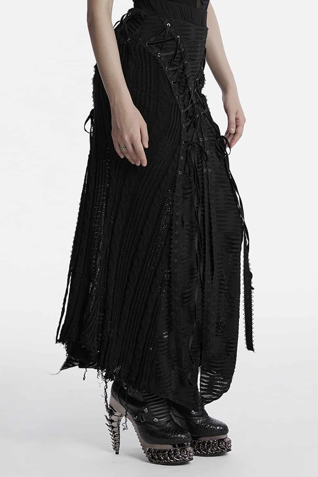 The Misanthrope long gothic skirt is really exciting! The trumpet/mermaid cut is super chic and emphasizes the figure, while the distressed-look knit accents give the whole outfit a cool, slightly ripped aesthetic. The unfinished hem adds even more to the “used” character, which goes super well with a goth or punk look. The lacing is a great detail because it makes the whole thing even more dramatic and allows you to adjust the skirt to your waist. The elasticated waistband also ensures comfort, which is always a plus, especially with a fitted design.