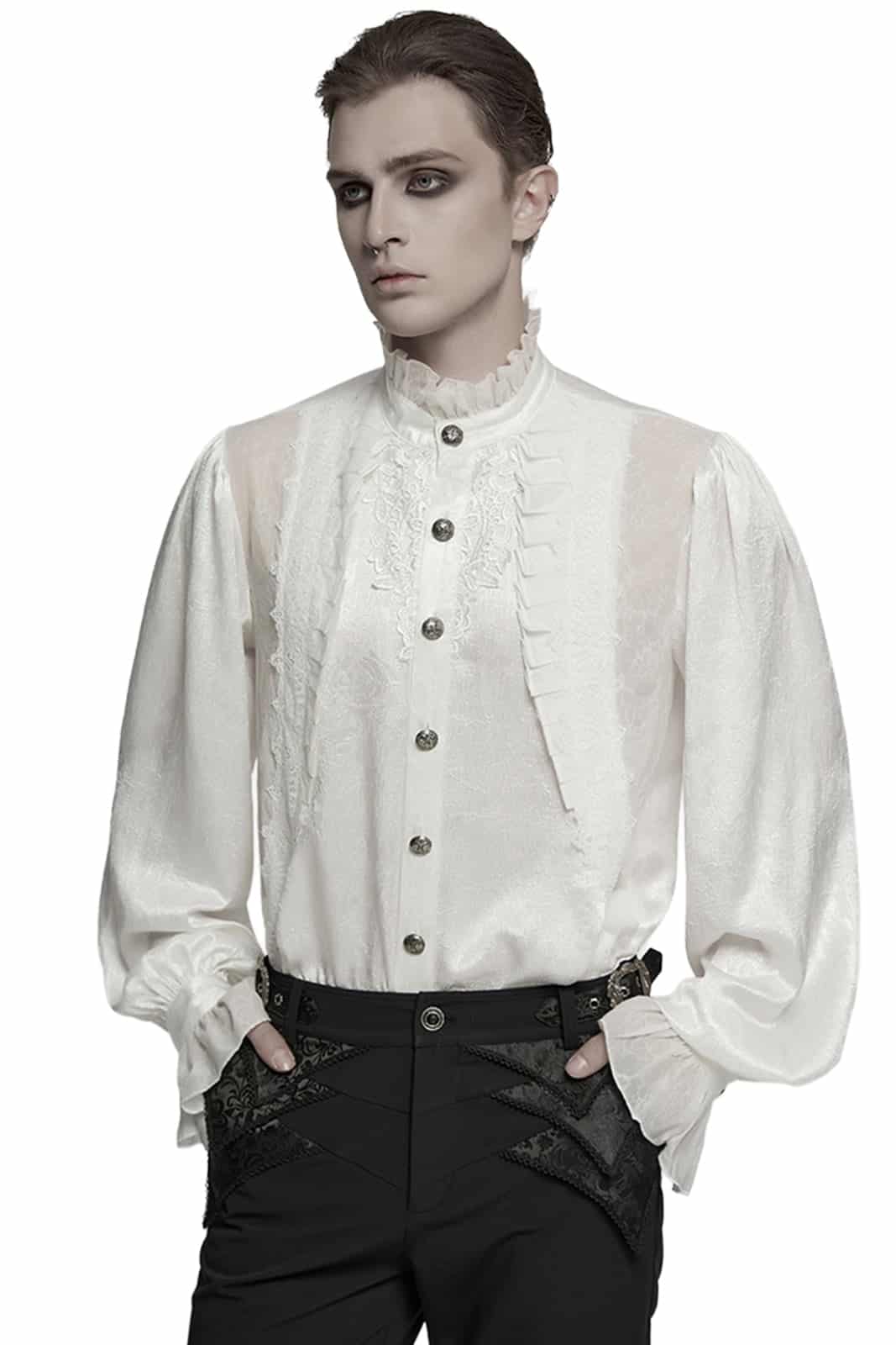 This romantic gothic shirt adds elegance and drama to any outfit. The white fabric with a delicate rose pattern and shimmering texture adds a sophisticated touch, while sheer inserts and lace appliqués refine the look. The wide-cut poet sleeves and frill trim make it the perfect piece for stylish outfits with a baroque aesthetic and dark romance.