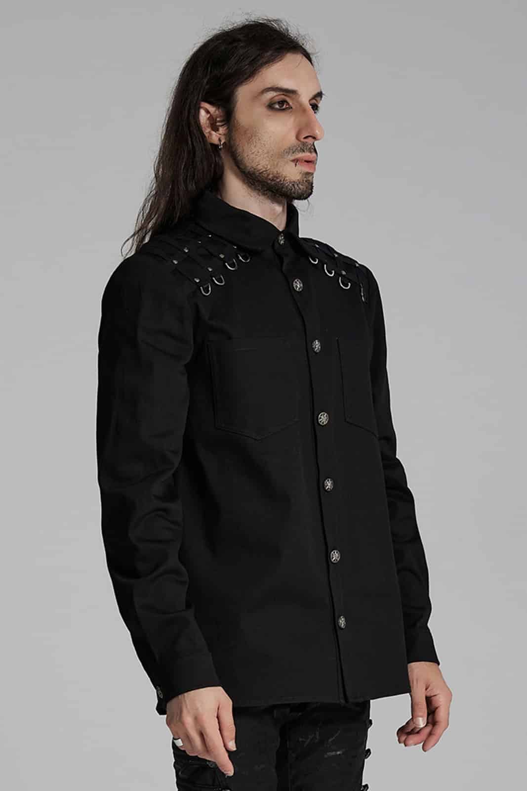 Classic cut shirt with short stand-up collar and buttoned front. Trimmed with two breast pockets. The shoulder area is decorated with D-rings and small studs. A horizontal studded band on the back creates a wide neckline.